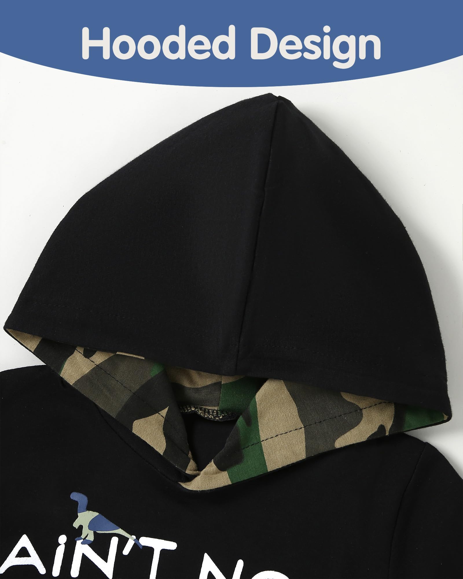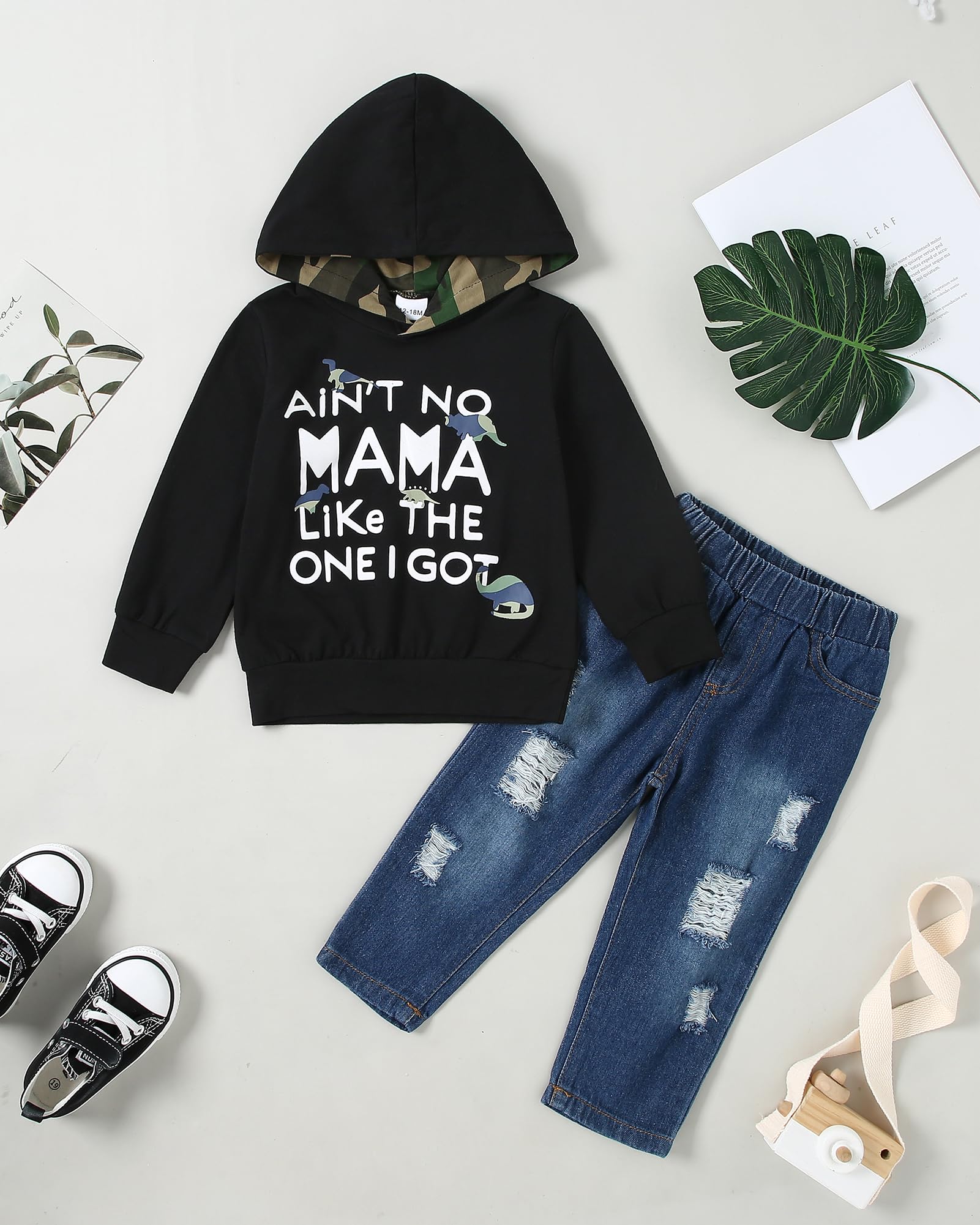 Stylish toddler fall outfits: Pullover design, letter pattern printed long sleeve hoodie top, and ripped jeans pants. Build your little guy a trendy look now!