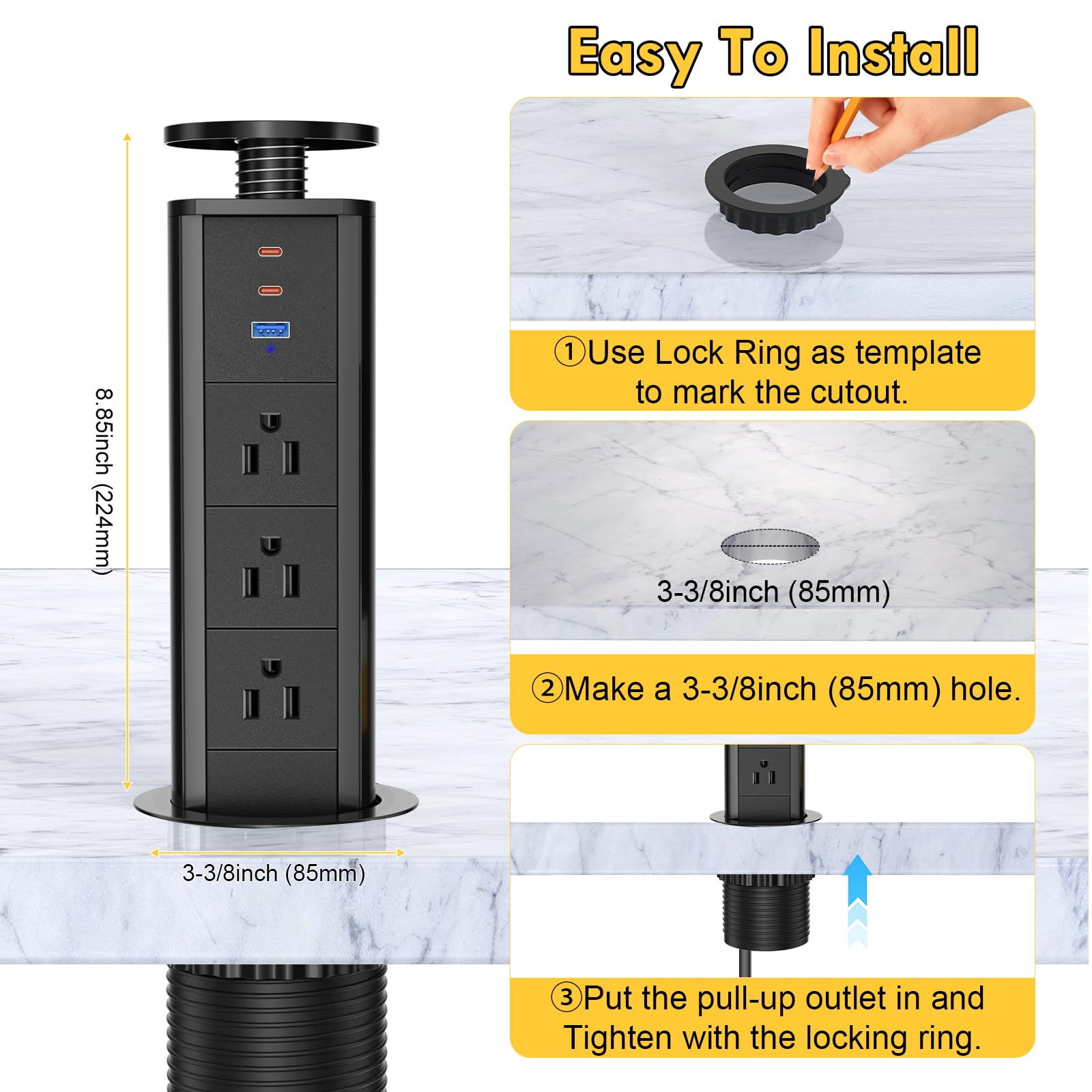 【Easy to Install】: Drill a hole 3-3/8inch (85mm) and then put outlet into the hole; it can be installed horizontal or vertically as long as you have space inside the countertop; so you can install this outlet in any position you need to.