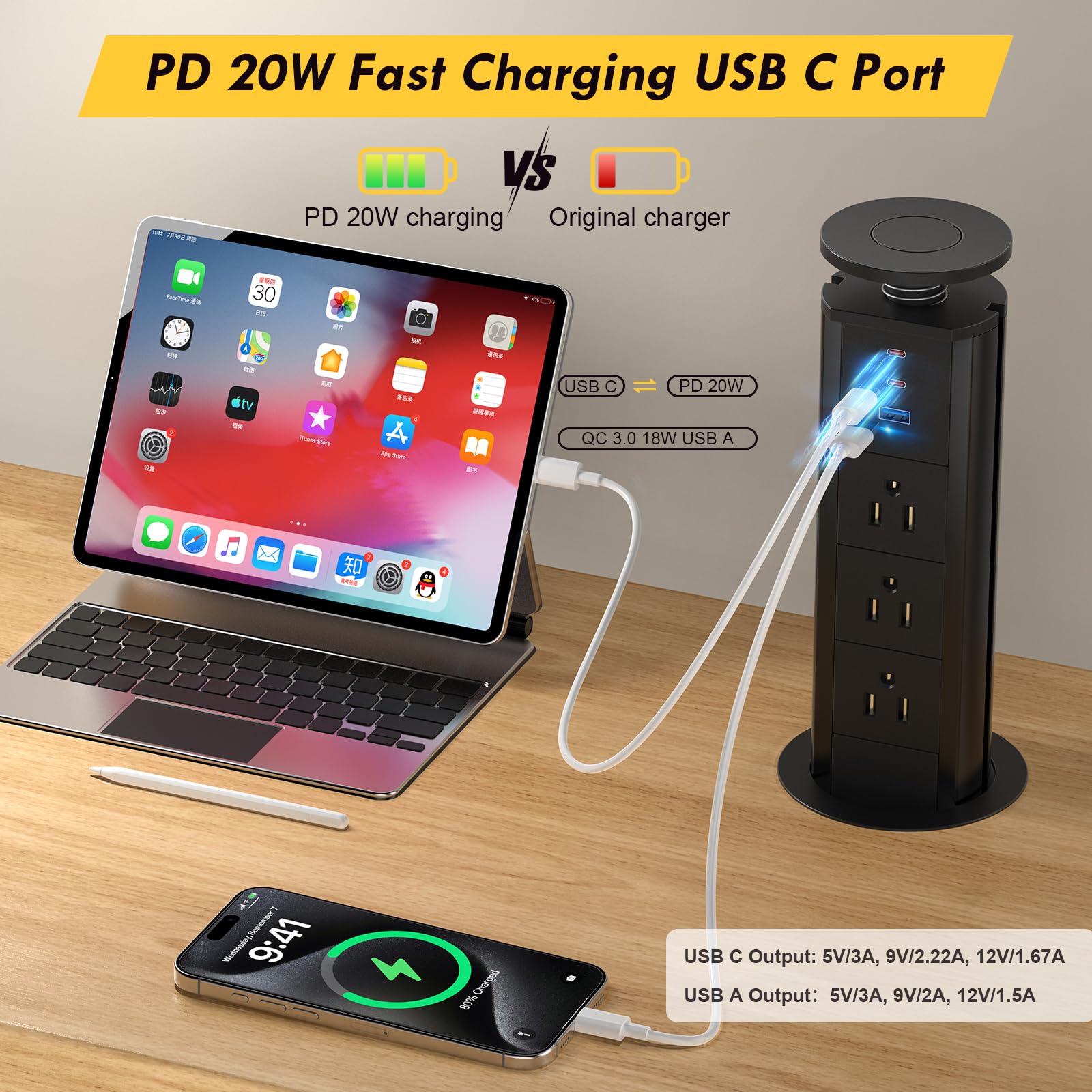 【Power Outlet with USB】: With 3 AC outlet (125V/15A) and 1 USB-A (5V/3A, 9V/2A, 12V/1.5A, QC 18W Max) & 2 USB-C Port (5V/3A, 9V/2.22A, 12V/1.67A, PD 20W Max). USB ports can charge phones, tablets and other usb device.