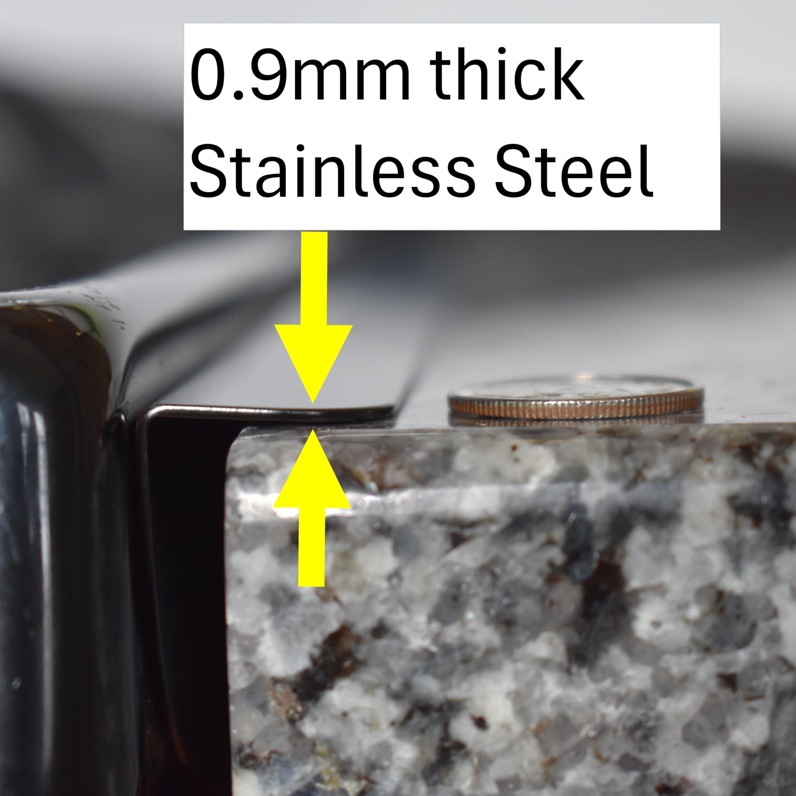 HIGH QUALITY: 0.9mm thick stainless steel formed flat and straight. Edges all carefully rounded.