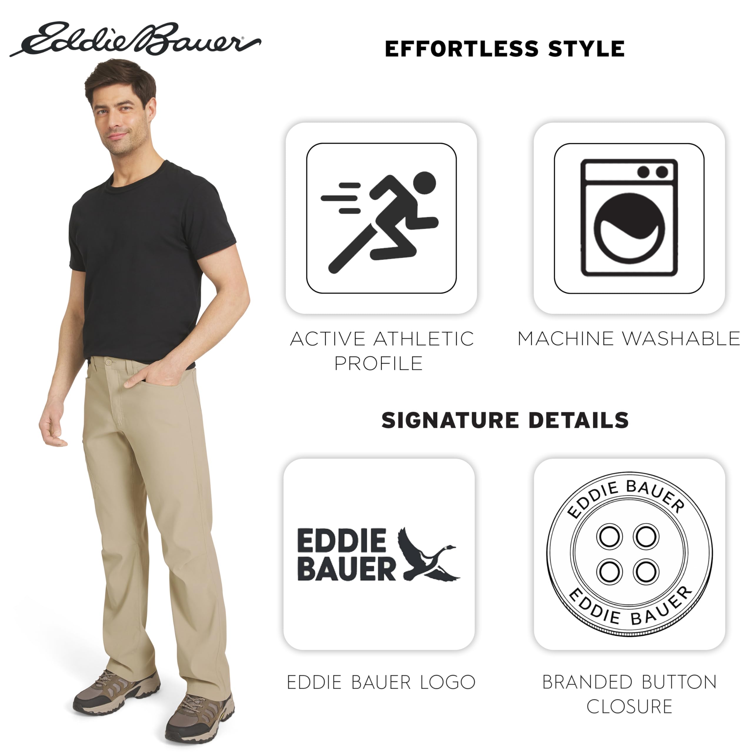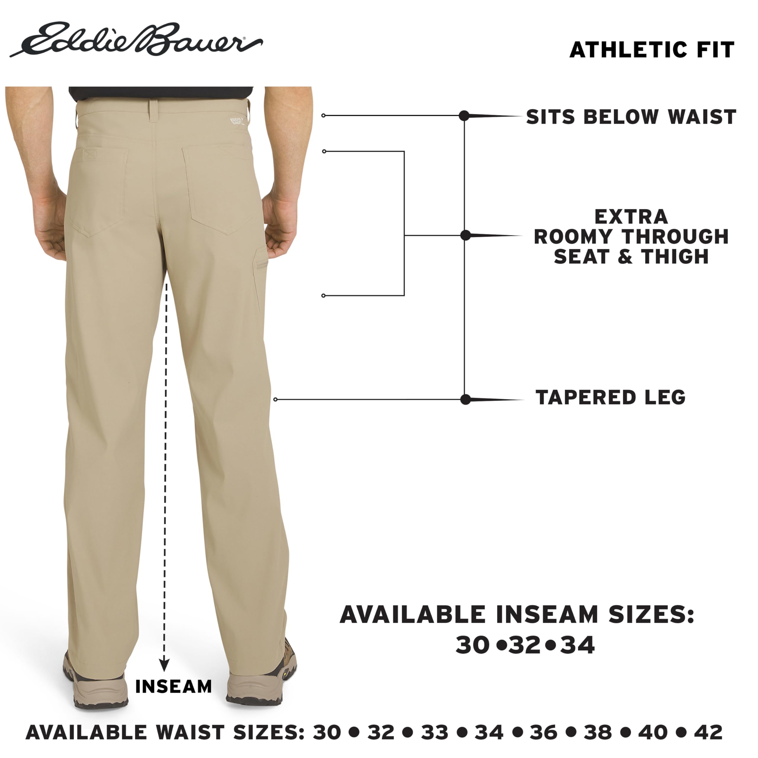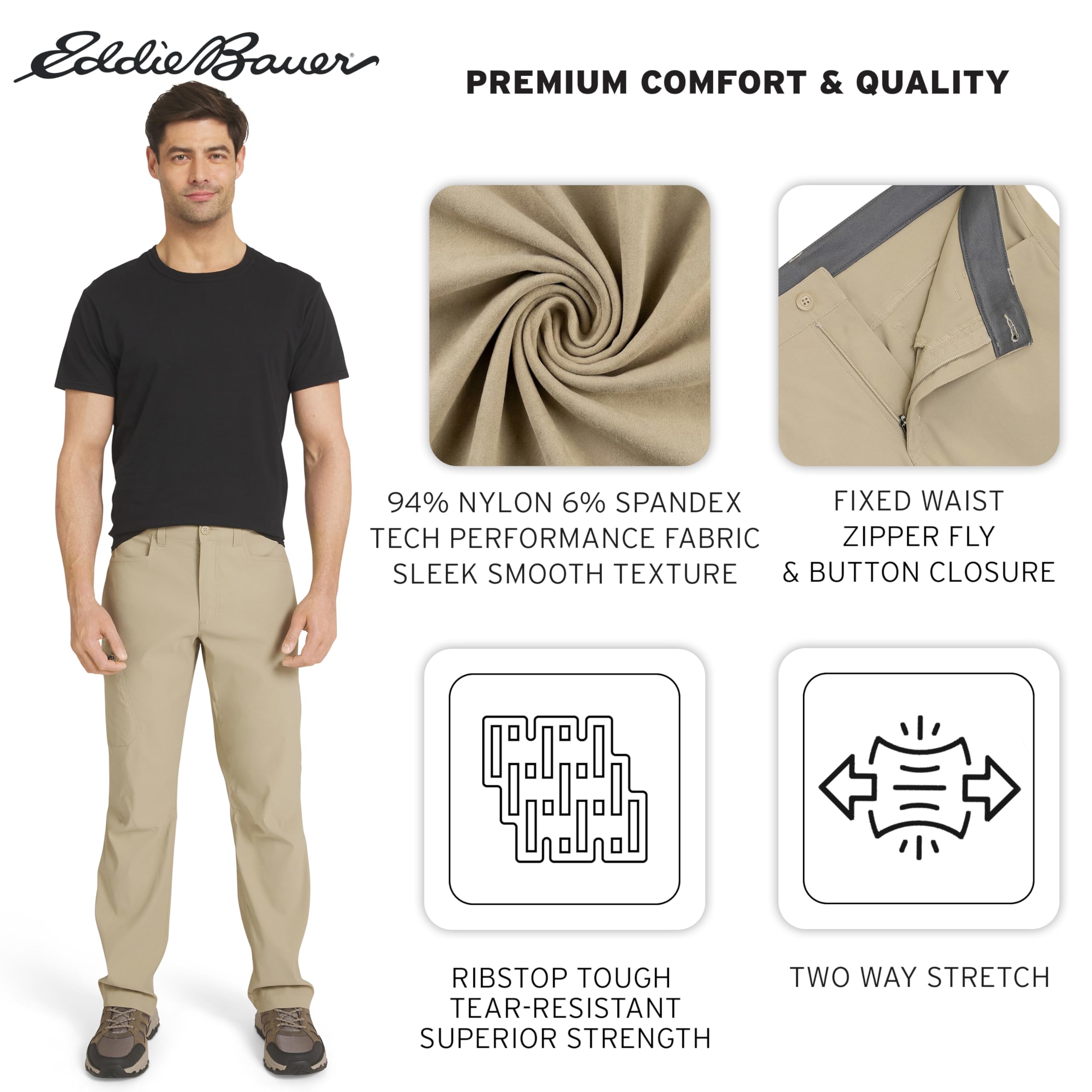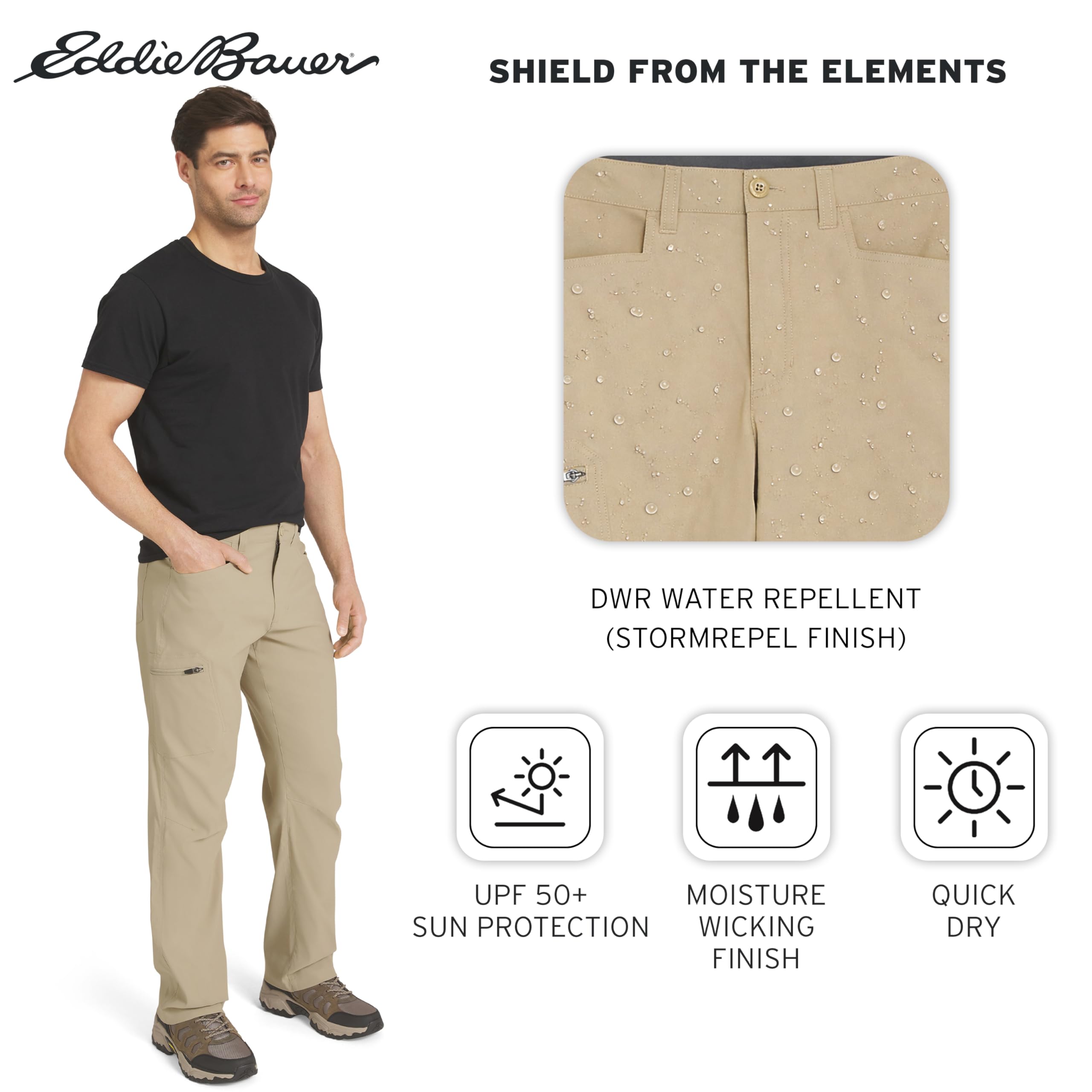 Description Built on a legacy of adventure-driven innovation, Eddie Bauer is committed to a sustainable and inclusive future for all. By utilizing materials and methods that minimize environmental impact, we strive to build an outdoor culture that is open, welcoming, and accessible to every explorer. This mission drives us to create high-performance apparel that respects the planet while empowering you to discover the great outdoors with confidence and purpose. Experience professional-grade performance with guide-tested ripstop fabric engineered for everything from alpine scrambling to backcountry climbing. This lightweight, bluesign® certified nylon-spandex blend features Flexion two-way stretch technology and articulated knees, ensuring exceptional mobility while taking anything you dish out on the trail. To keep you protected, these pants include a StormRepel® DWR finish to shed moisture and FreeShade® UPF 50+ sun protection to block harmful UV rays during long days in the sun. Discover a streamlined silhouette designed for high-intensity movement with an Active Fit that sits close to the body without restricting your range of motion. These moisture-wicking, quick-dry pants are equipped with a total of five pockets, including a zippered cargo pocket at the thigh to keep your phone and maps secure. Whether you are navigating a summit or traveling light, these pants pair perfectly with technical hiking boots or a performance sun hoodie, providing a secure, athletic profile for any adventure.