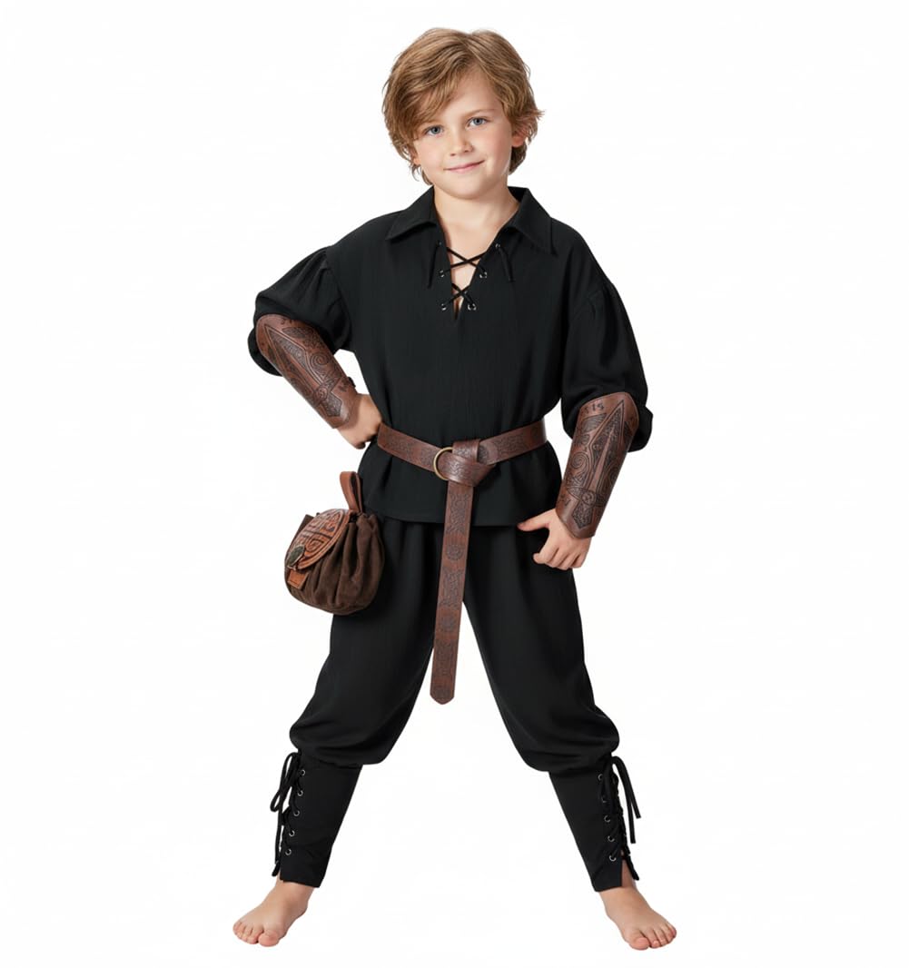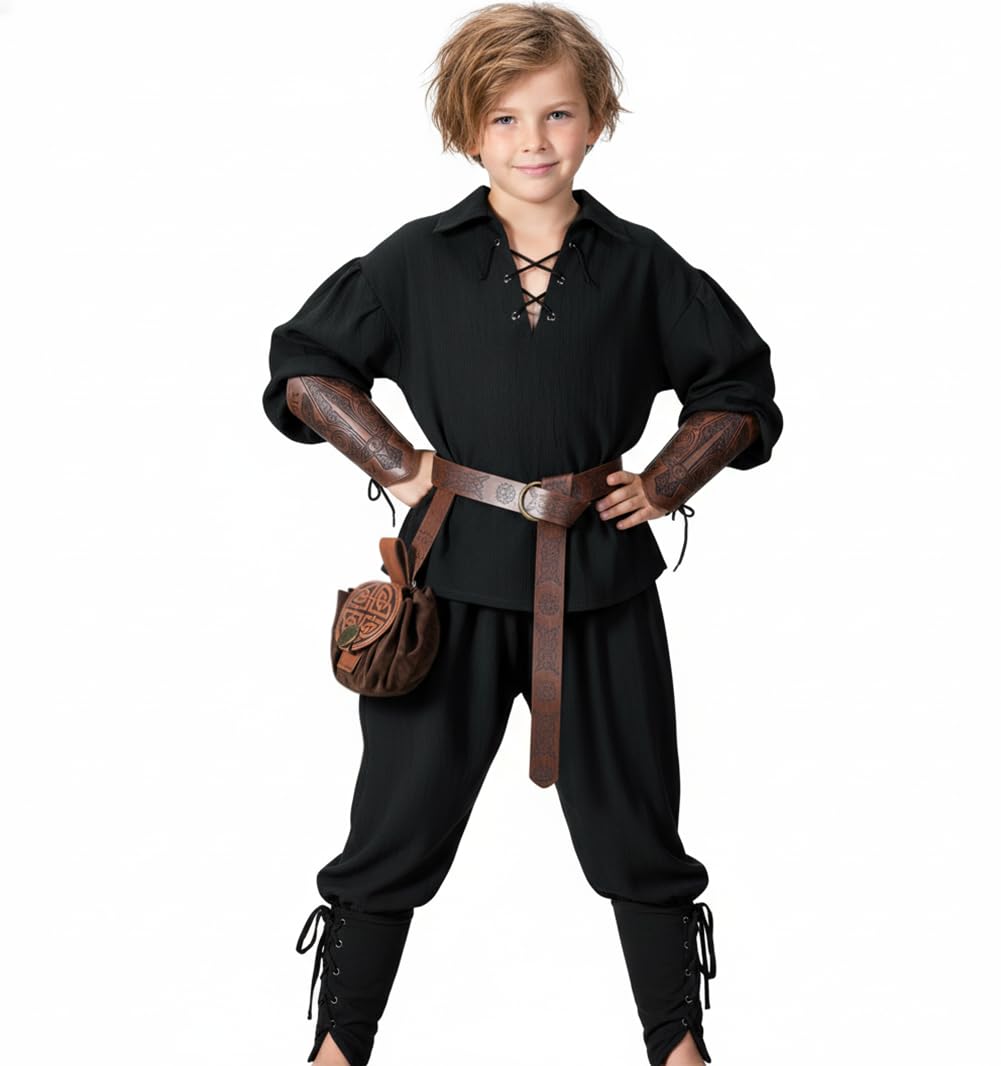 【Tunic Design】: Boy's Halloween costume shirt, vintage role-playing shirt, long sleeves, lace up neckline, loose fit, elastic wide cuffs, dropped shoulders, unique historical era style.