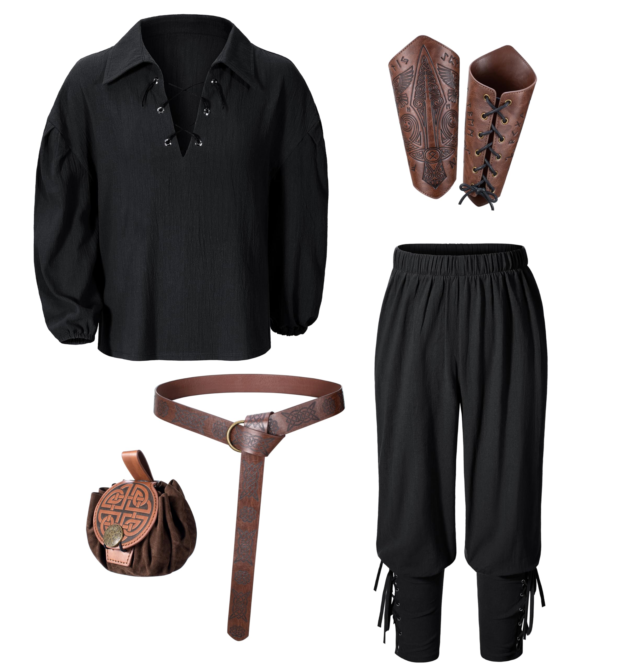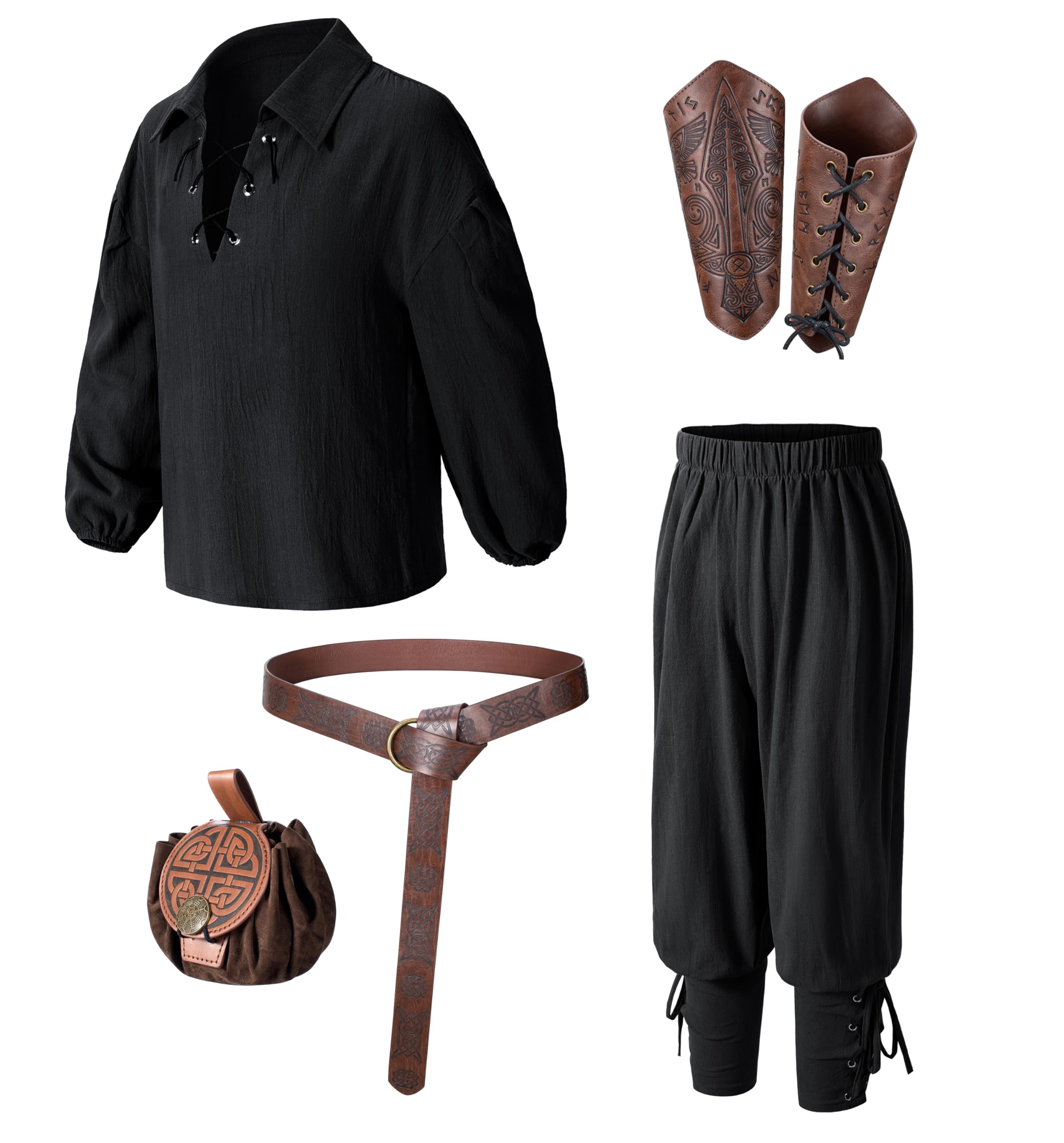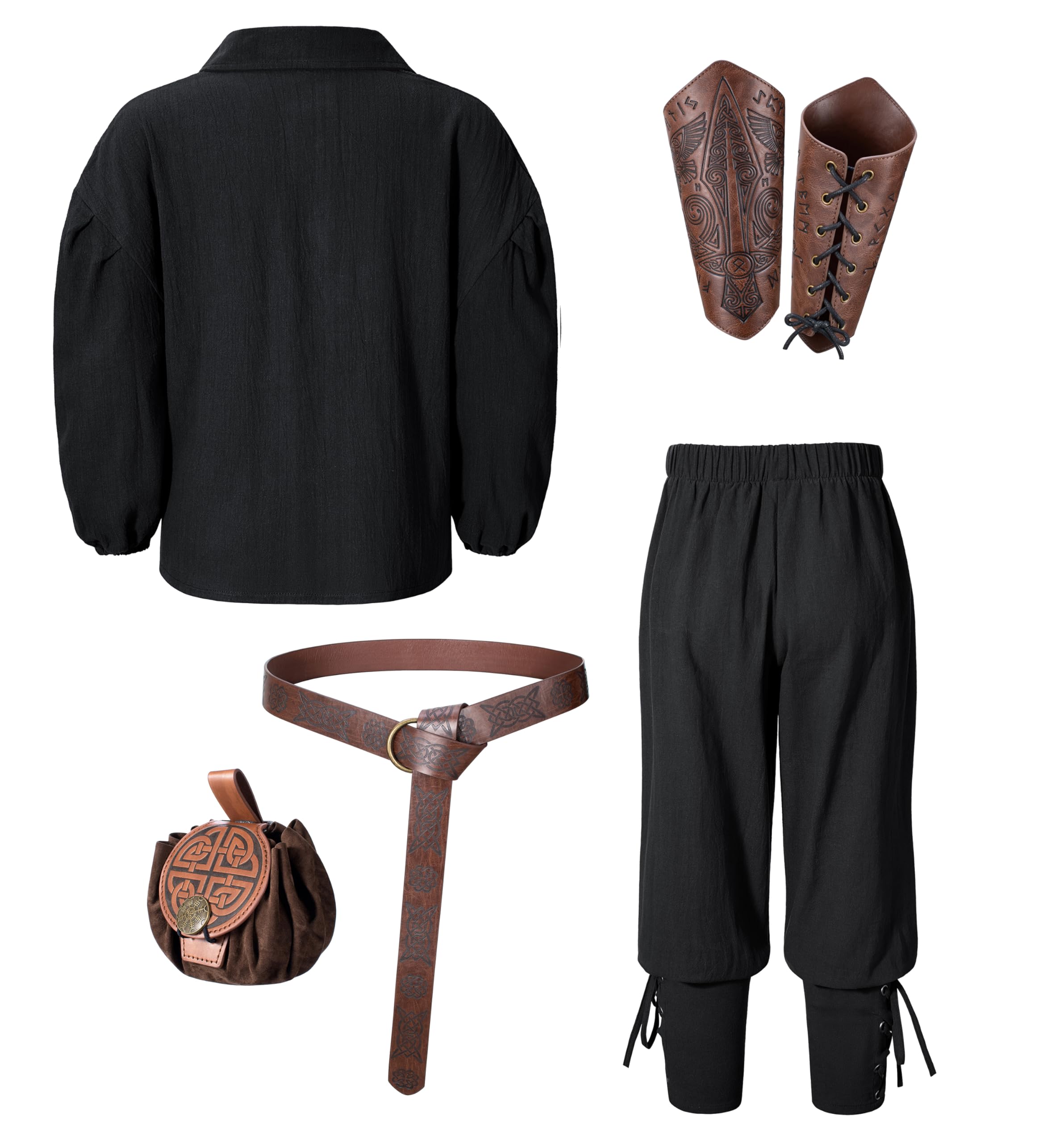 【Package Includes】6pcs set:Medieval Shirt,Vintage Pants,Leather Belt,Waist pouch,1 pair of arm Bracers.