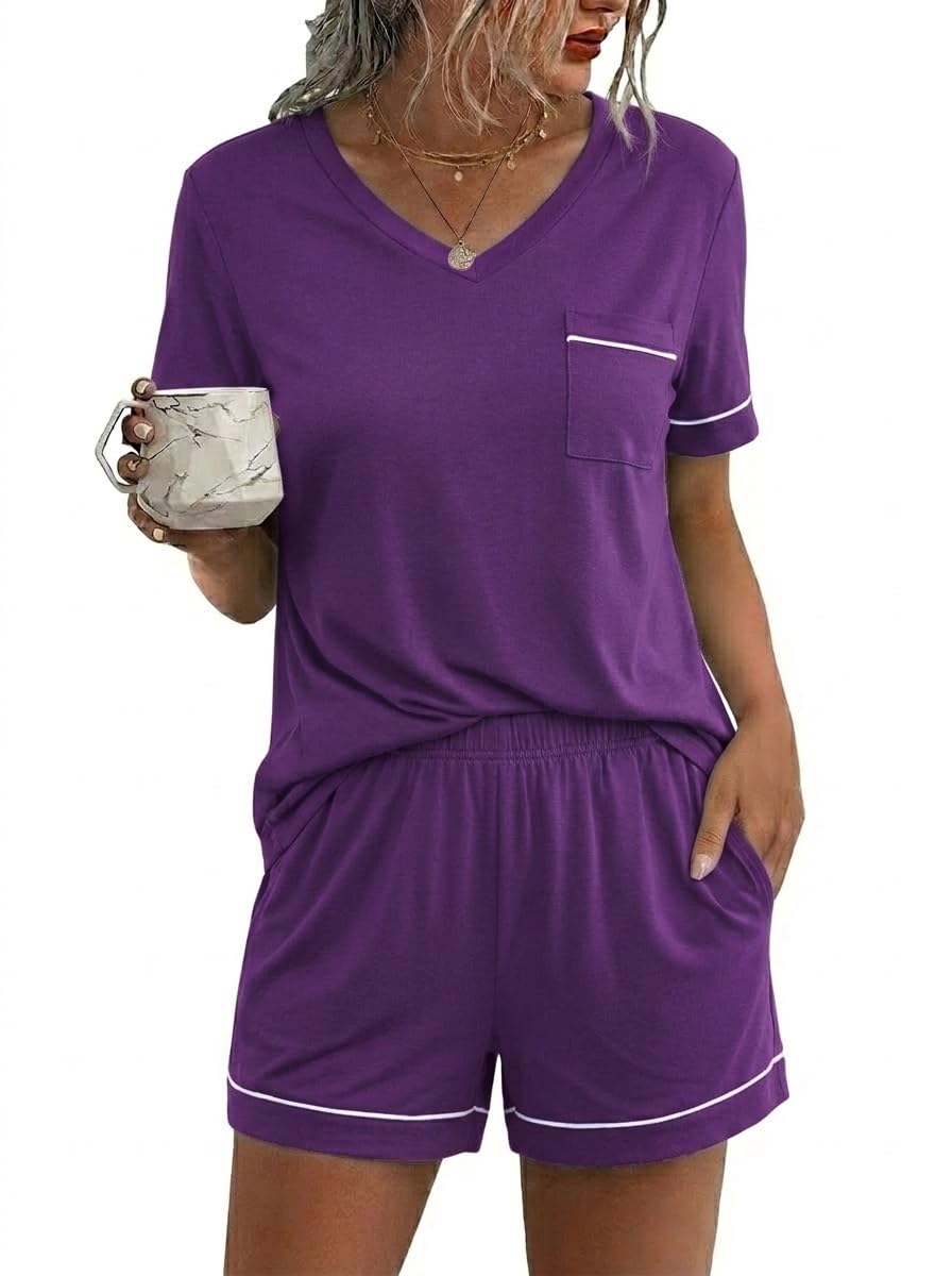 【Thoughtful Design】 The pjs top features a V Neck, chest pocket, and contrast Hasselblad trim; the lounge shorts include side pockets and matching piping for a polished, relaxed look