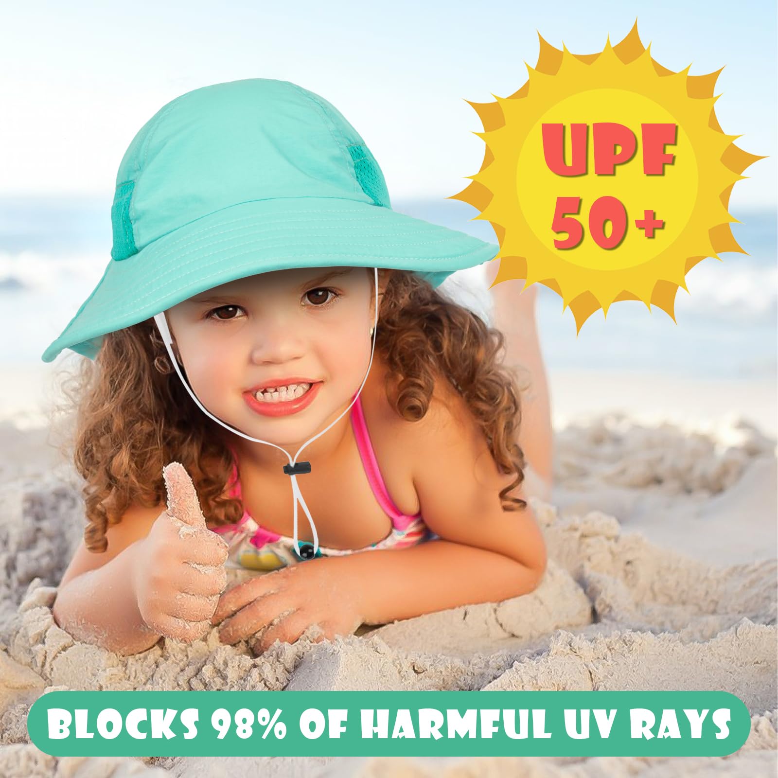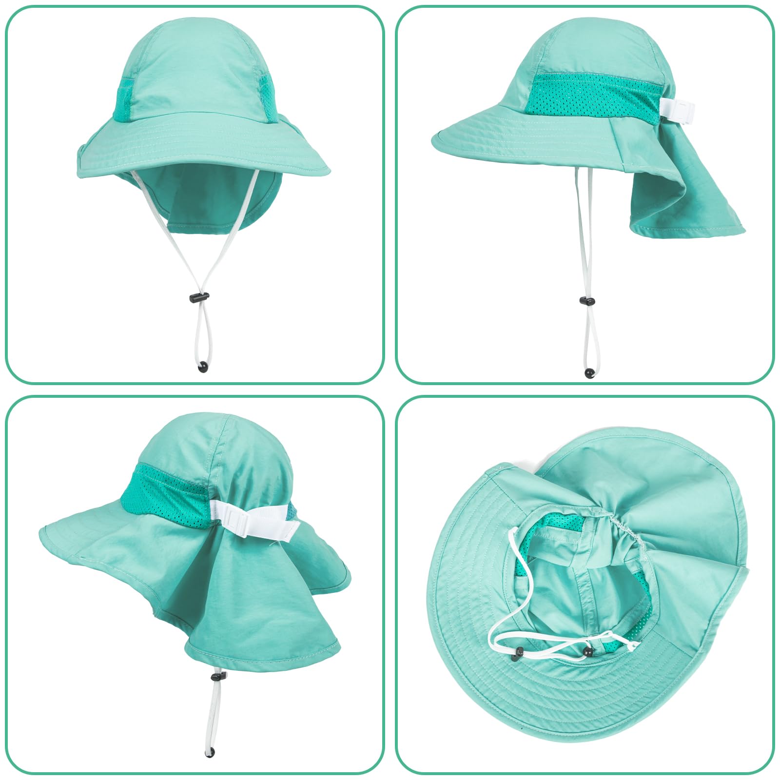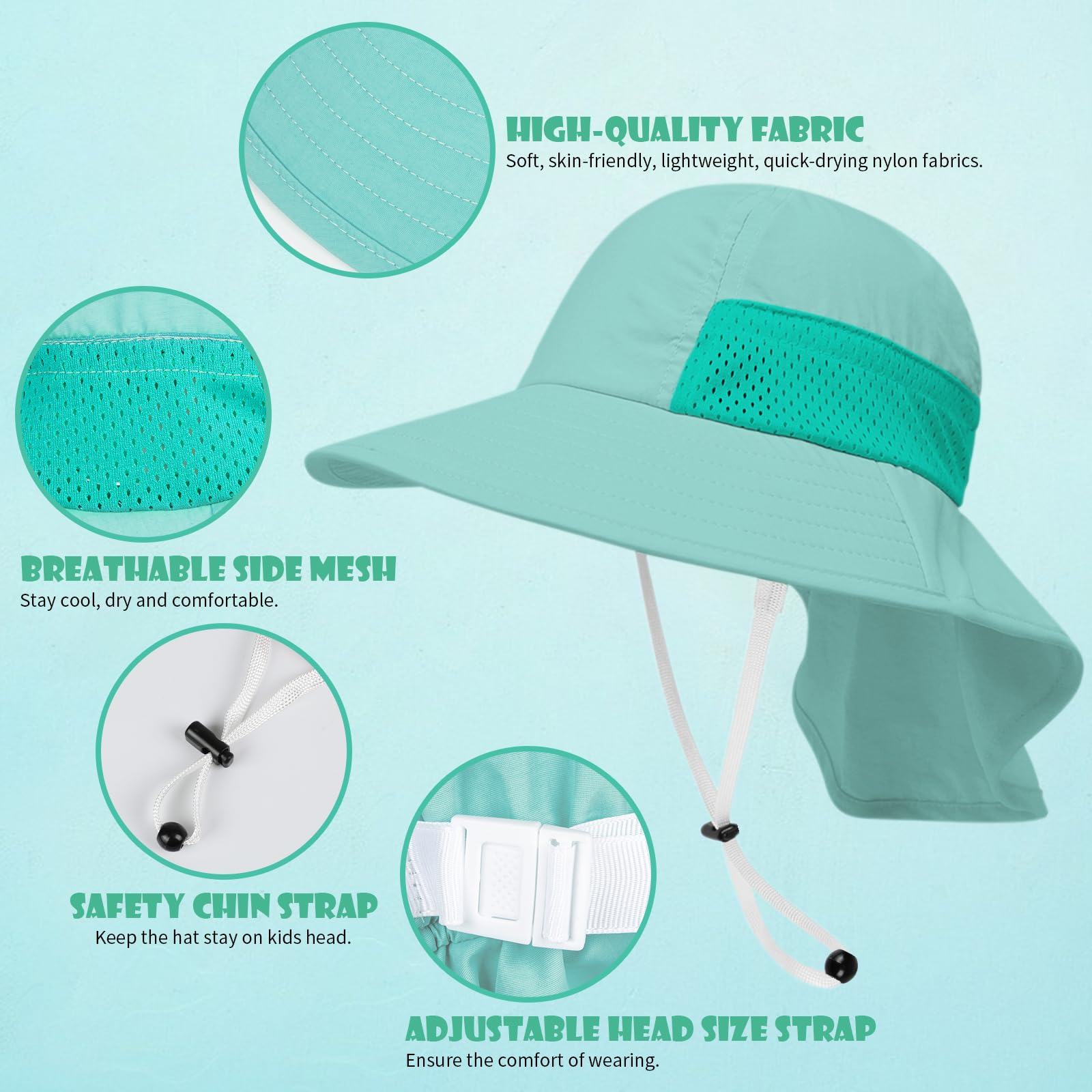 GREAT SUN PROTECTION: The kids sun hat features highest rated UPF 50+ sun protection, which blocks up to 98% of UVA and UVB Rays! Its 3" wide brim and 5.4"long neck flap help to cover kid's face, ears, back and neck, thus protecting the delicate skin from sun burn better