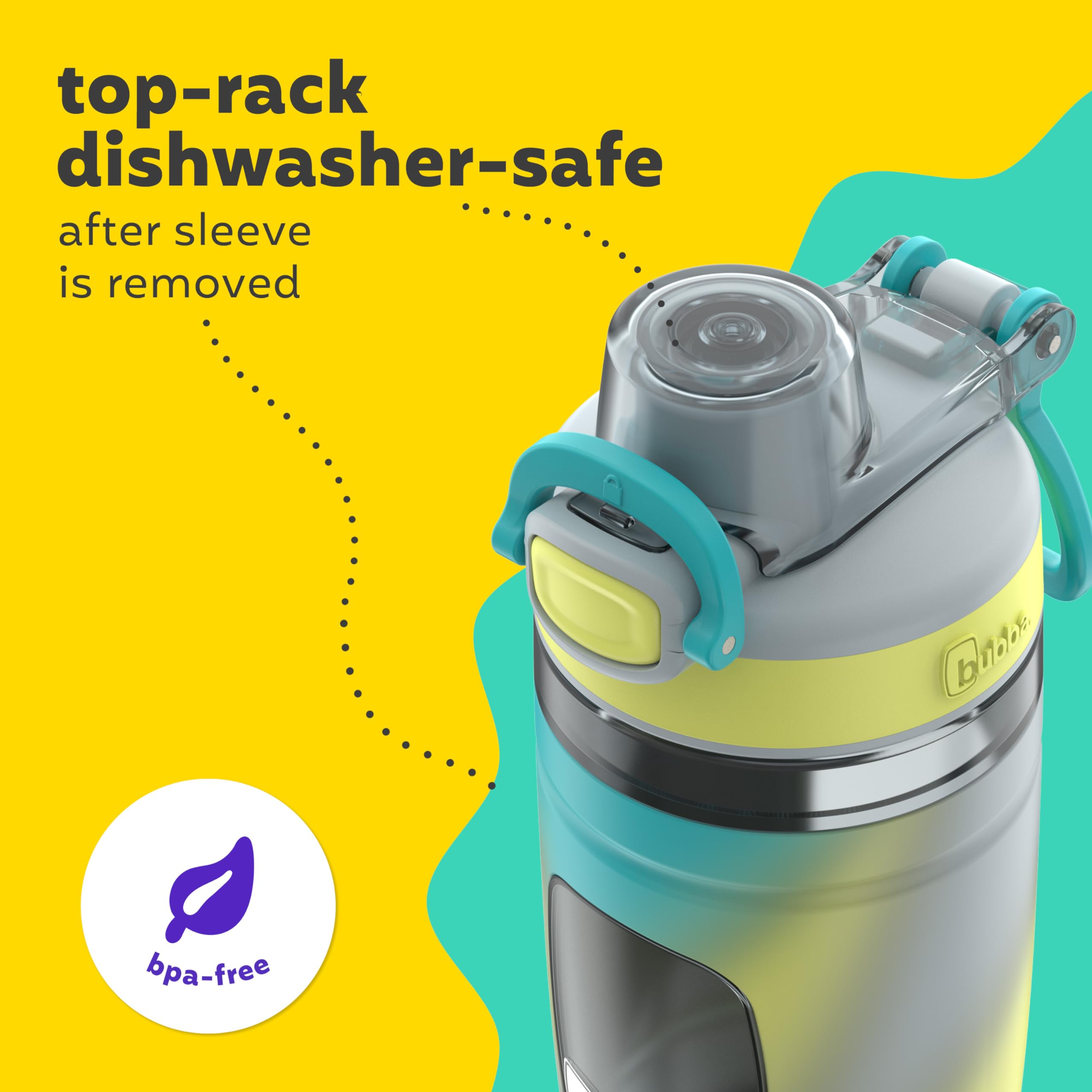 Teach your kids good hydration habits with the bubba Flo Kids Water Bottle with Silicone Sleeve, 16oz. It features a leak-proof lid and a handy button lock to prevent accidental openings, keeping the inside of your car safe from spills. With a high-flow chug lid, kids can quickly hydrate without missing their turn on the monkey bars. A built-in spout cover keeps out dirt and germs. This sturdy water bottle is made of impact-, stain-, and odor-resistant BPA-free plastic. In addition to keeping drinks cold longer, the easy-to-grip silicone sleeve reduces condensation and includes a see-through window so you can track liquid consumption. The sleeve comes off, so throw lid and body onto the top rack of your dishwasher for no-fuss cleaning. Rest assured, your bubba is guaranteed for life. For ages 3 and up.