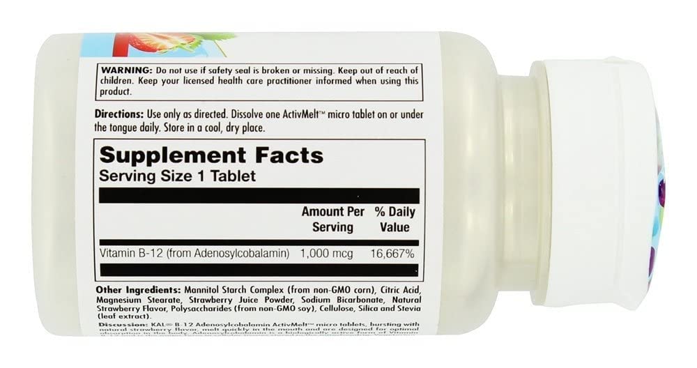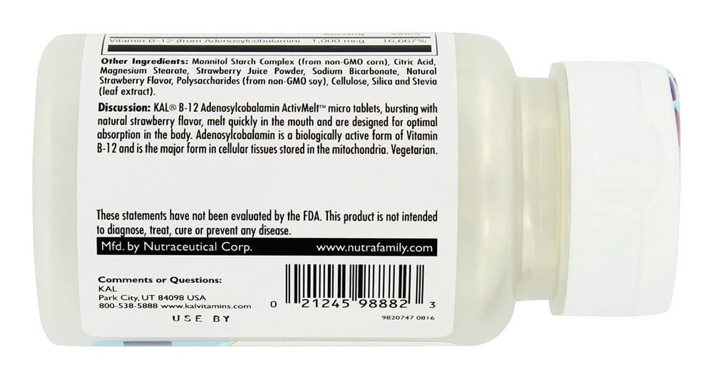 Kal ActivMelt technology comprises instant-melt action. This contains B-vitamins, D-3, chromium picolinate, zinc, etc. Delicious sweet and natural flavor ActivMelt micro tablets dissolve in your mouth. Non-GMO and lactose-free.