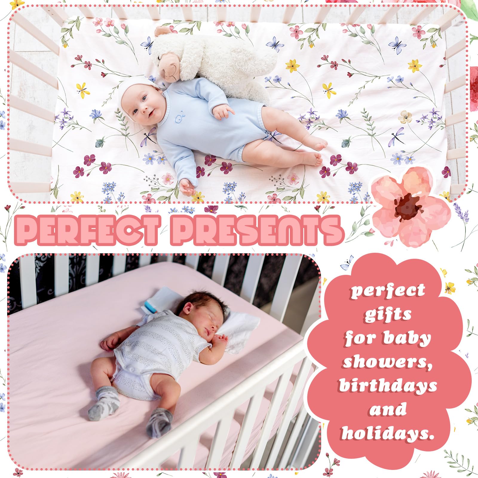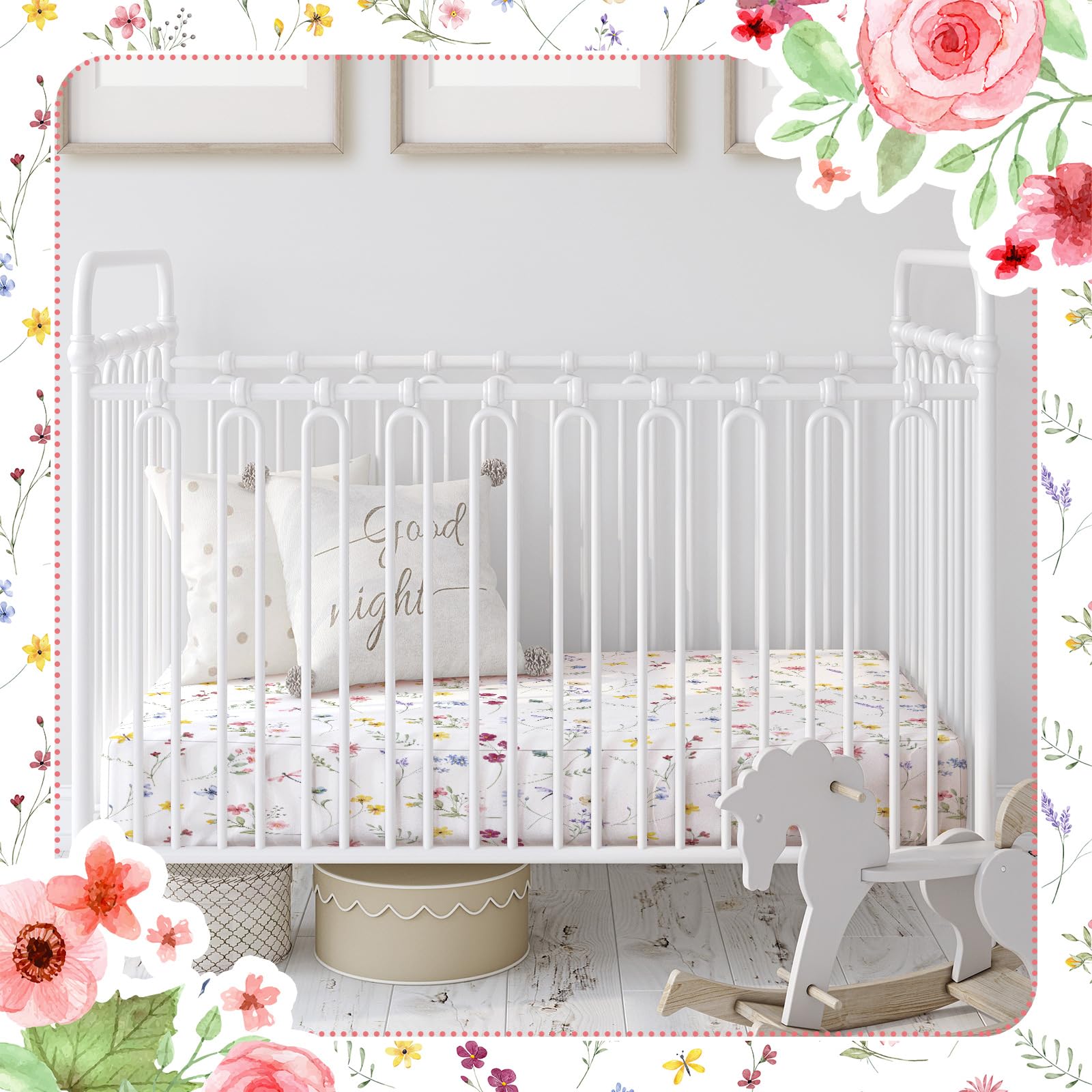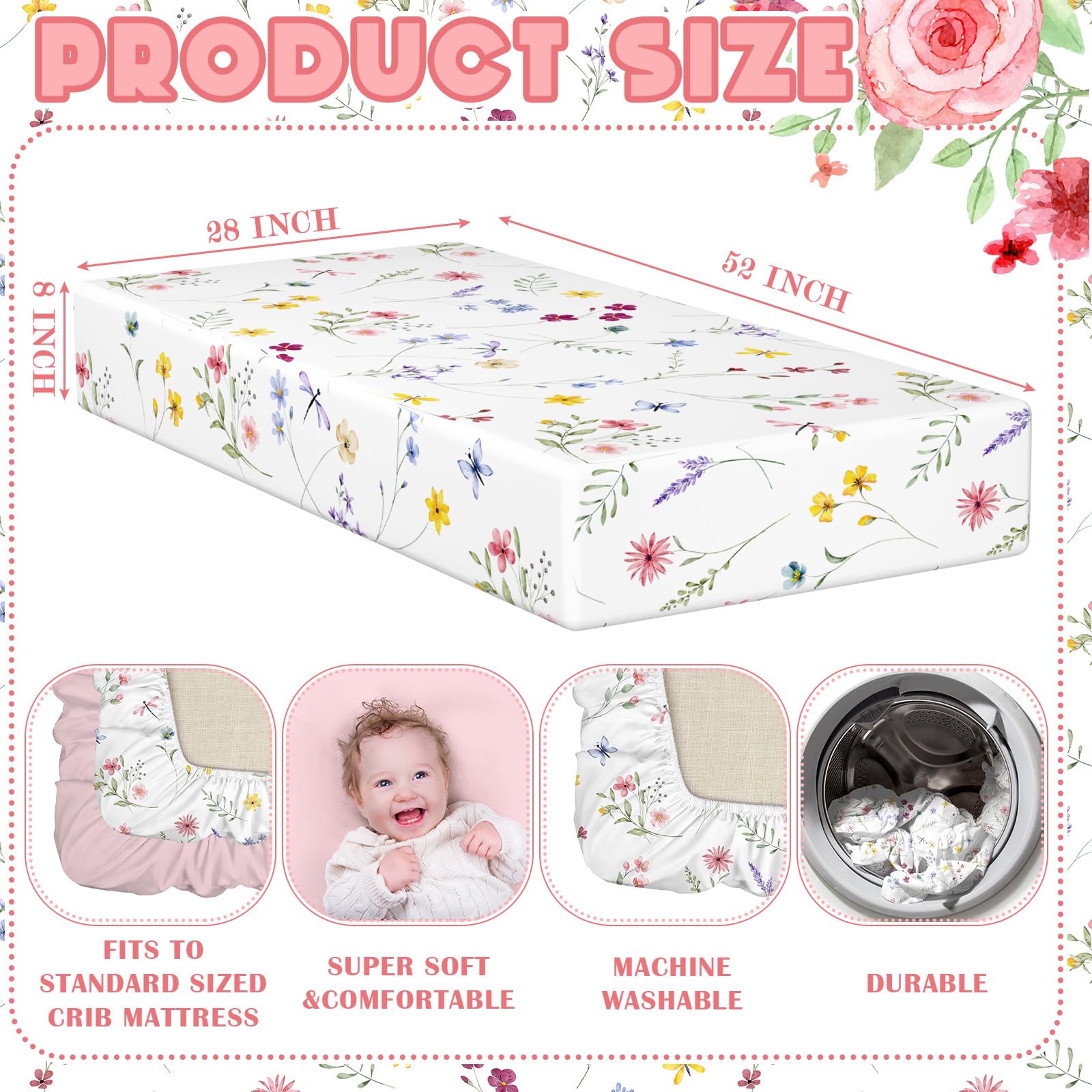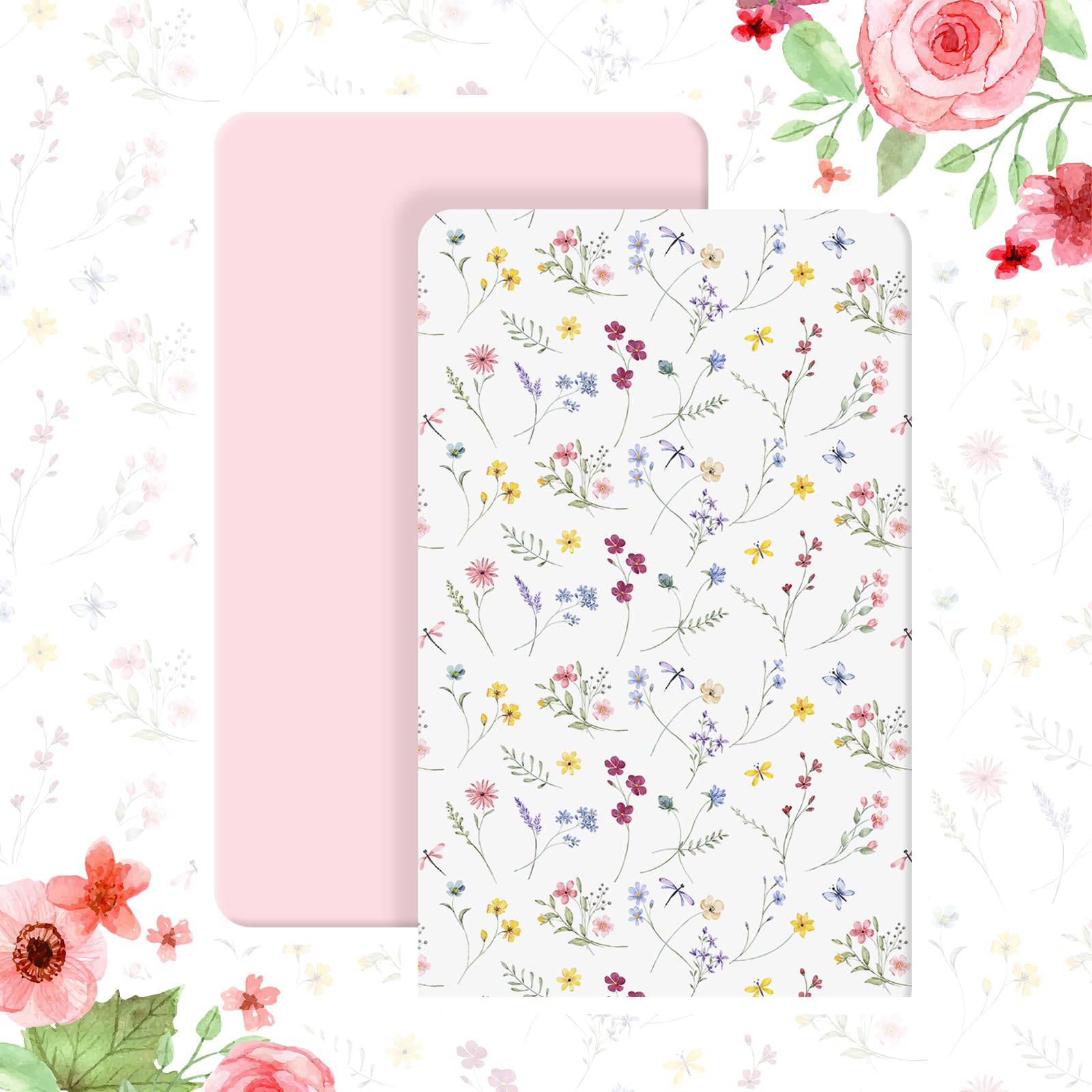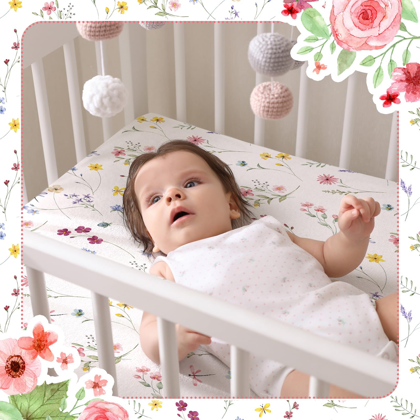 Wildflower Bed Sheet Set: includes 2 pcs baby bed sheets compatible with a 52" x 28" standard baby mattress; 4 sided elastic edging design, paired with an 8 inch deep pocket, provides a secure fit that is not easily displaced; 2 pcs bed sheet configuration, easy to change and wash, keep clean and ready for apply at any time; Practical and thoughtful, creating a comfortable and reassuring sleeping space for babies