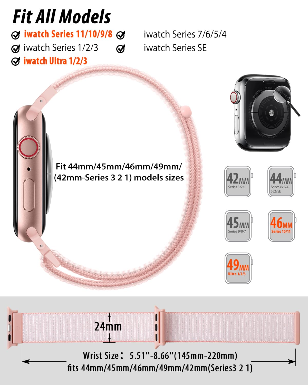 [Fit All Models]: Sunnywoo sports nylon watch bands - Compatible with apple watch for women and men, Fits all apple watches, iWatch Bands for Se, Ultra 3/2/1, Series 11, Series 10, Series 9, Series 8, Series 7, Series 6, Series 5, Series 4, Series 3, Series 2, Series 1, iWatch wrist straps offer two size options, ① 5.11"–7.87" (130–200mm) fits 38/40/41/42mm cases ② 5.51"–8.66" (145–220mm) fits 44/45/46/49mm cases. Please check the size on the back of the watch and choose the right size