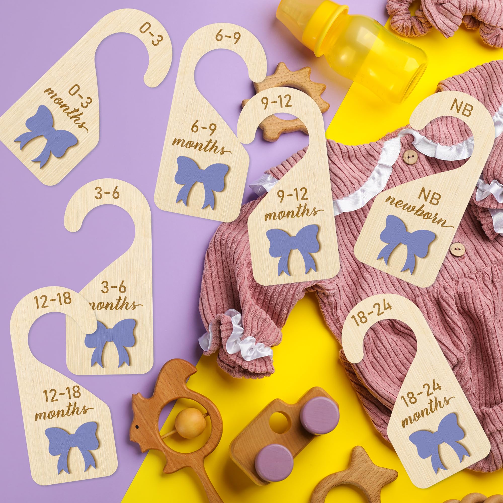 Purple Bow Baby Closet Dividers: Package includes 7Pcs clothing dividers covering all ages from newborn to toddler, Newborn, 0-3 months, 3-6 months, 6-9 months, 9-12 months, 12-18 months, 18-24 months, and 1 black velvet bag. Excellent choice for organizing clothes for parents-to-be.