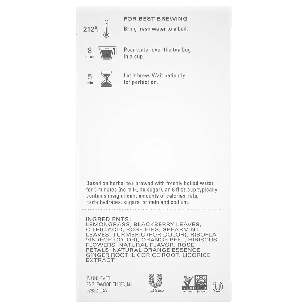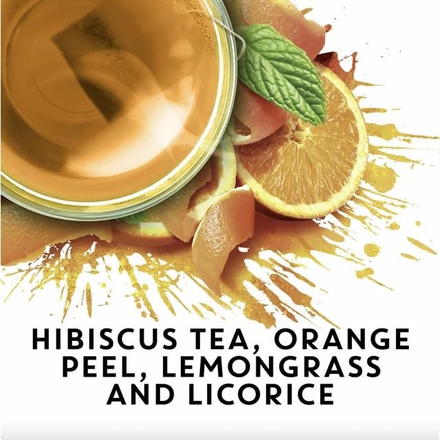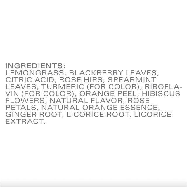 Bold Citrus Taste: Enjoy a deliciously juicy herbal tea, infused with lemongrass, blackberry leaves, rose hips, spearmint leaves, hibiscus flowers, orange peel, orange essence, and licorice root for a refreshing flavor.