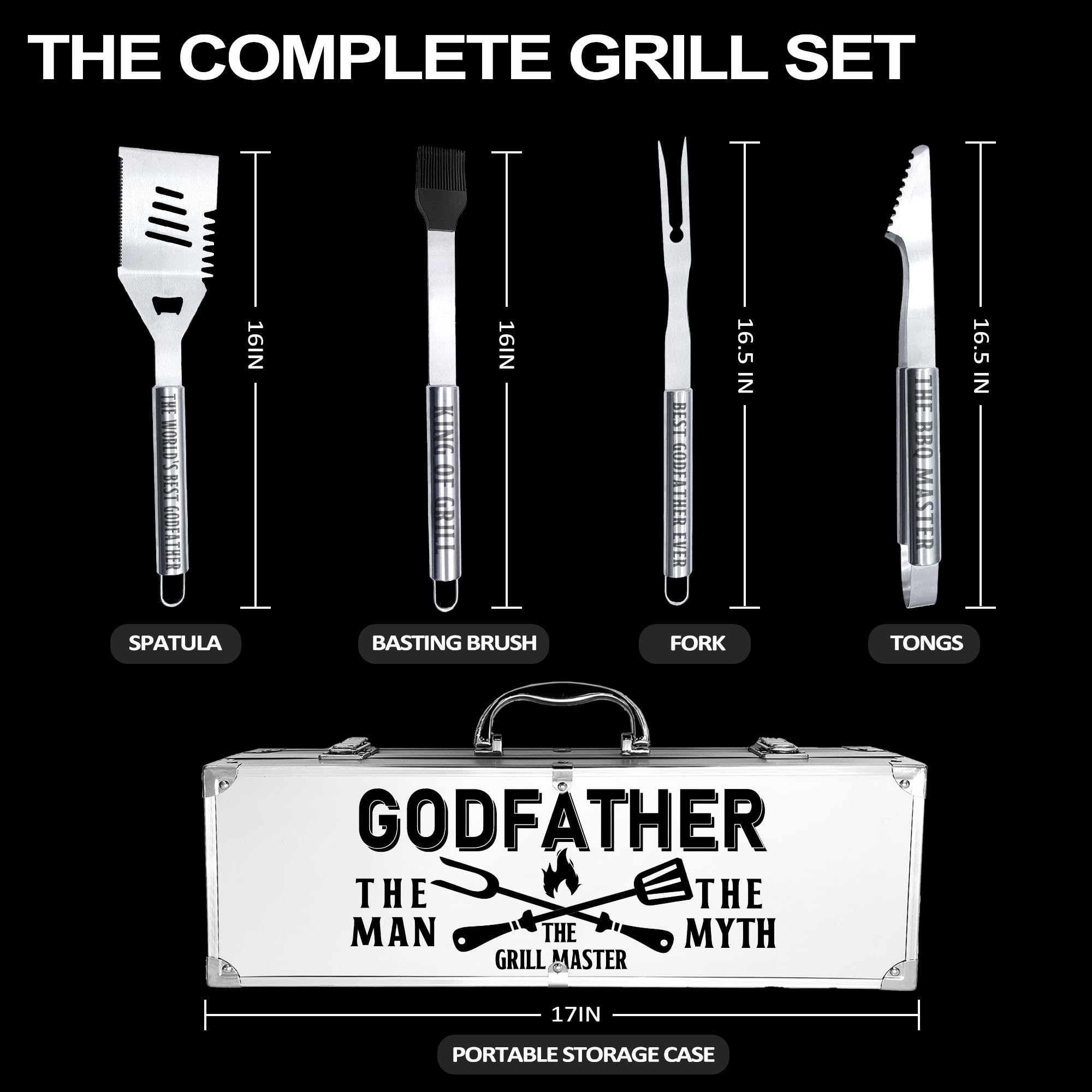 ESSENTIAL TOOLS FOR GRILLING - Essential starter set for godfather who is barbecue lover, This grill set contains everything you need for all your BBQs: 1*Multi-purpose spatula, 1*Grill fork, 1*Tongs,1*Basting brush. All the tools are all packed in a durable aluminum carrying case - perfect for use on the go or at home.