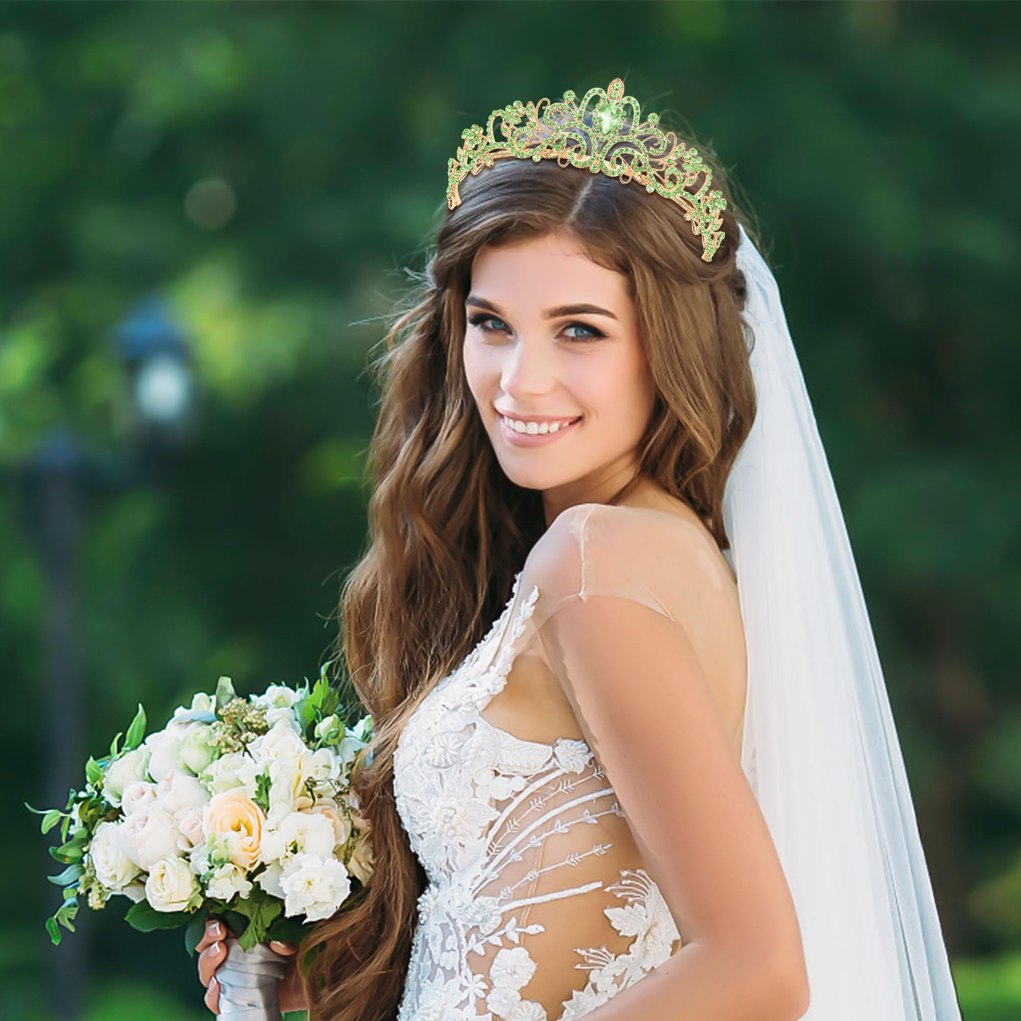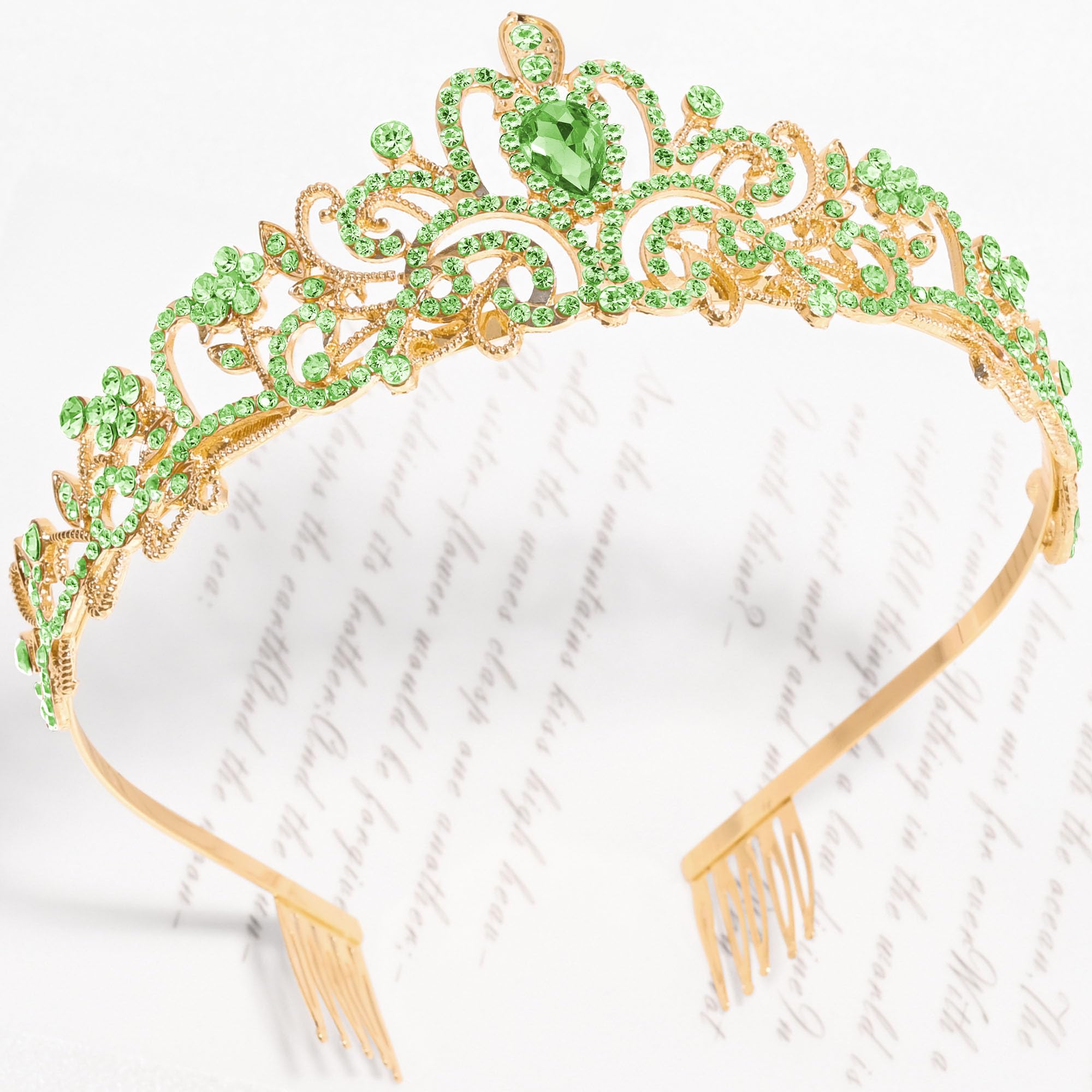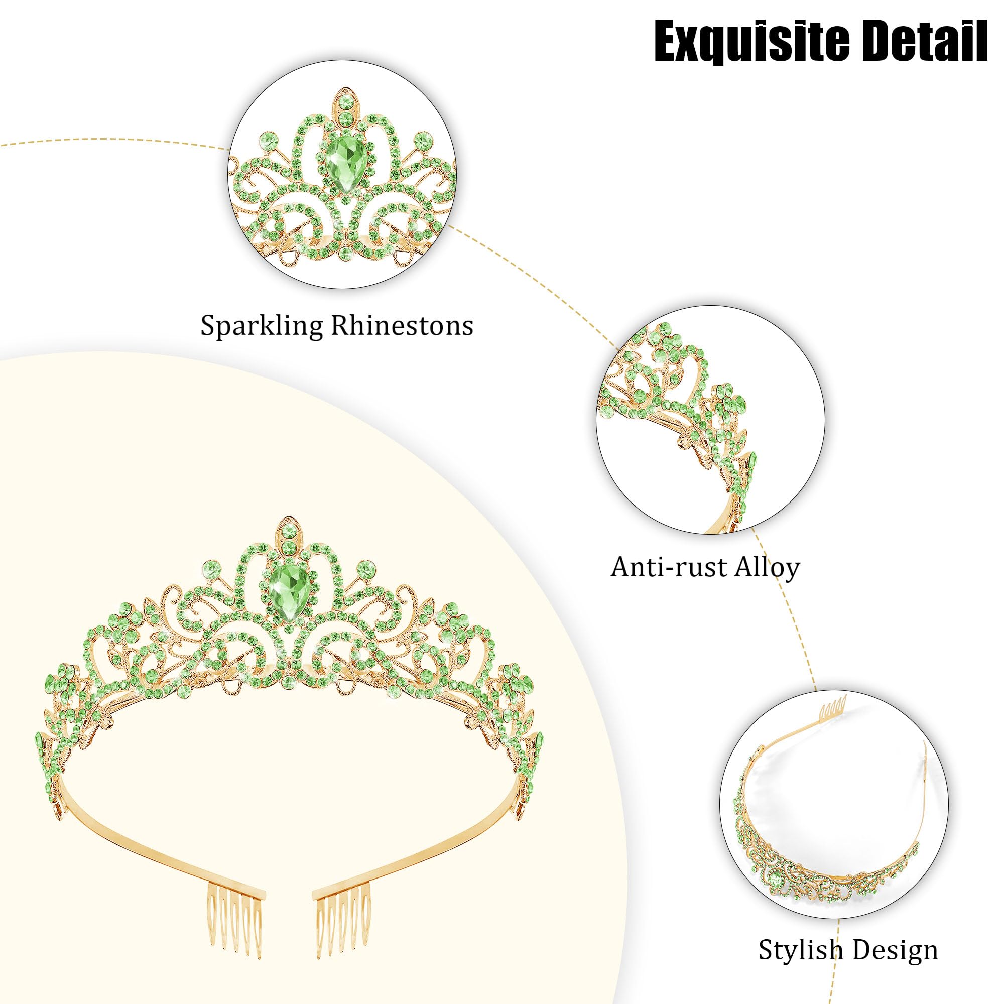 👑[Side-Comb Design] The both sides of princess tiaras for women are designed with comb. Holds the queen crown well on your head. No more worries about your green crown falling off on the move. The lightweight structure and adjustable comb provide a fit and gentle grip. Make you pretty without any discomfort.