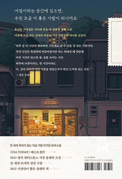 “받아들여지고 있다는 느낌이 이렇게 슬프고도 좋을 줄이야!” 브런치북 전자책 출판 프로젝트 수상작! 독자 요청 쇄도로 전격 종이책 출간 “책과 서점을 통해 새로운 관계를 만들고, 스스로 일어서기 위해 애쓰는 사람들의 이야기가 깊이 있게 펼쳐진다.”(소설가 김금희 심사평) 서울 어디에나 있을 것 같은 동네의 후미진 골목길. 오가는 사람도 많지 않은 가정집들 사이에 평범한 동네 서점 하나가 들어선다. 바로 휴남동 서점! 슬픈 사연을 갖고 있는 사람처럼 얼굴에 아무런 의욕도 보이지 않는 서점 주인 영주는 처음 몇 달간은 자신이 손님인 듯 일은 하지 않고 가만히 앉아 책만 읽는다. 그렇게 잃어버린 것들을 하나둘 되찾는 기분으로 하루하루를 보내다 보니 소진되고 텅 빈 것만 같았던 내면의 느낌이 서서히 사라진다. 그러다 어느 순간 깨닫는다. 자신이 꽤 건강해졌다는 사실을. 그 순간부터 휴남동 서점은 완전히 새로운 공간이 된다. 사람이 모이고 감정이 모이고 저마다의 이야기가 모이는 공간으로. 바리스타 민준, 로스팅 업체 대표 지미, 작가 승우, 단골손님 정서, 사는 게 재미없는 고등학생 민철과 그의 엄마 희주 등 크고 작은 상처와 희망을 가진 사람들이 휴남동 서점이라는 공간을 안식처로 삼아 함께 살아가는 법을 배운다. 『어서 오세요, 휴남동 서점입니다』는 우리가 잃어버린 채 살고 있지만 사는 데 꼭 필요한 것들이 가득한 책이다. 배려와 친절, 거리를 지킬 줄 아는 사람들끼리의 우정과 느슨한 연대, 진솔하고 깊이 있는 대화 등. 출간 즉시 전자책 TOP 10 베스트셀러에 오르며 수많은 독자의 찬사를 받은 소설이 독자들의 강력한 요청으로 마침내 종이책으로 다시 태어났다.