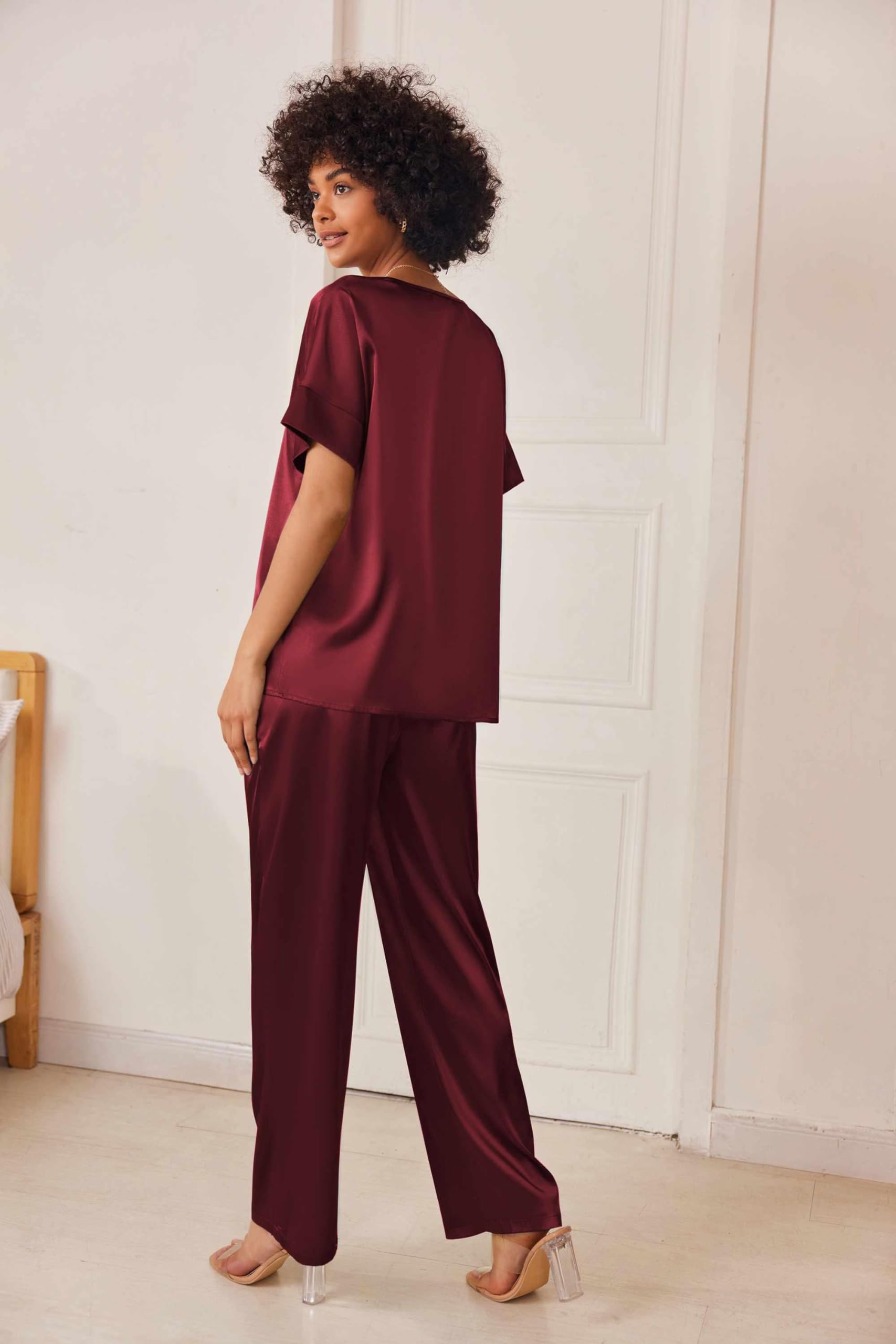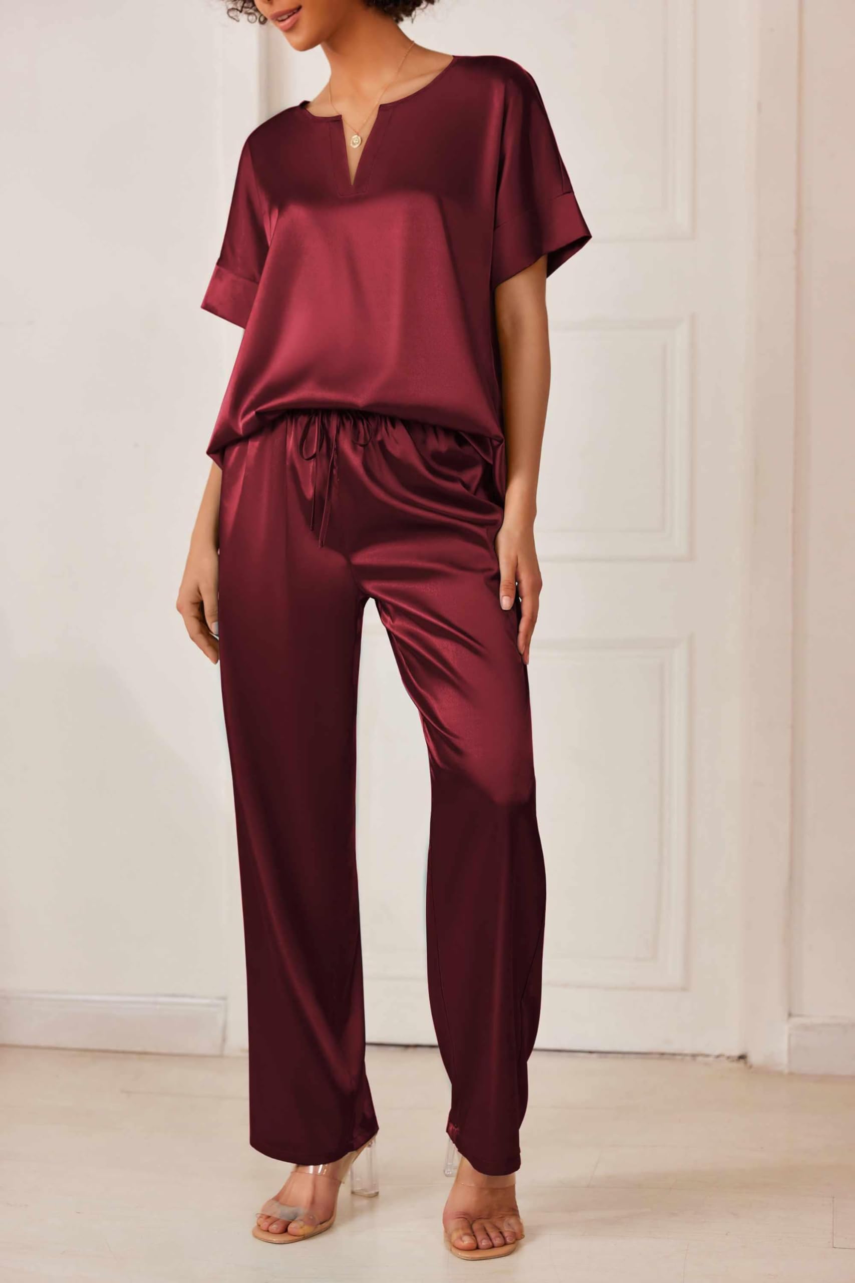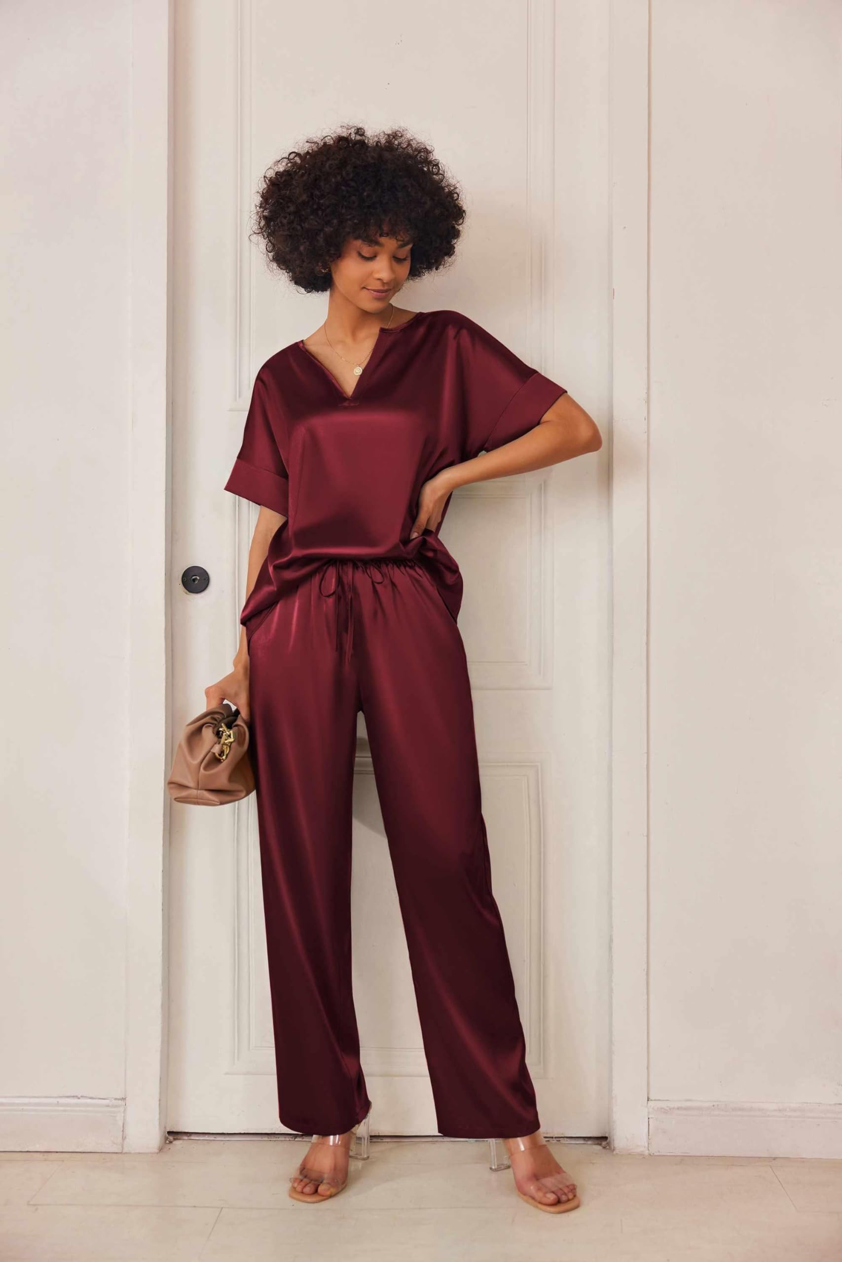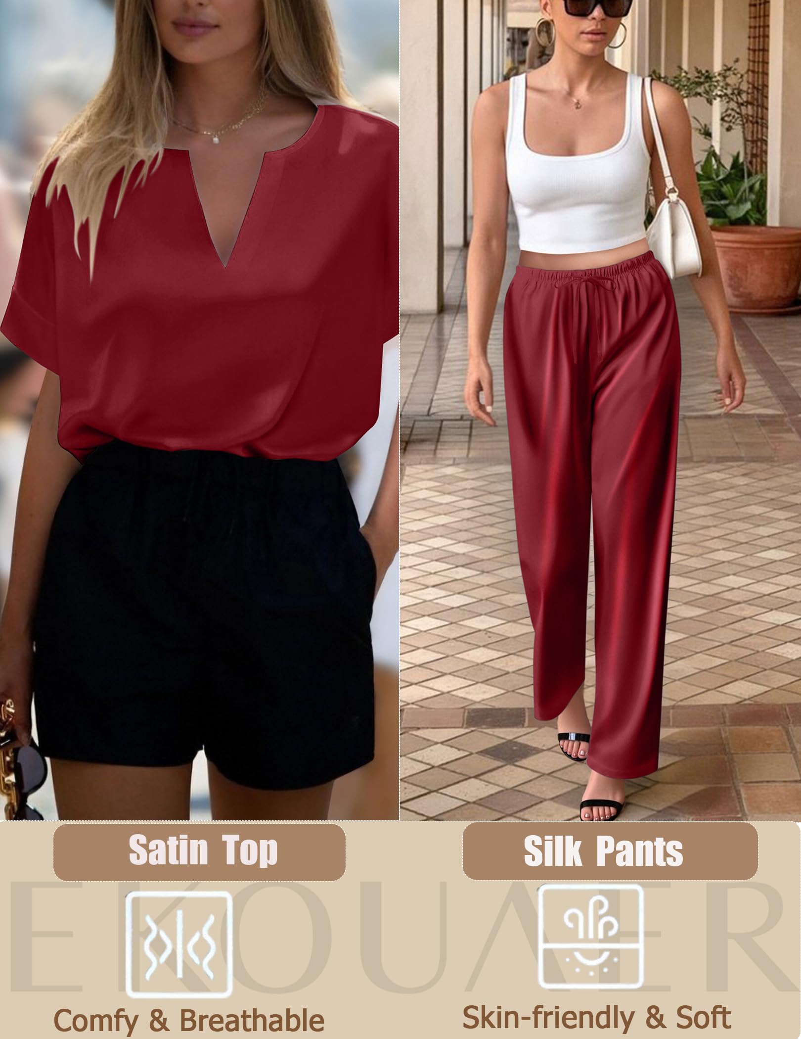 DESIGN&FEATURES: Top: Deep V-neck, short sleeve with wide sides. Pants: Relaxed fit wide legs long pants with high stretch elasticated trousers and 2 sides large pockets.Silk pajamas for women with popular designs makes your family wander more elegant