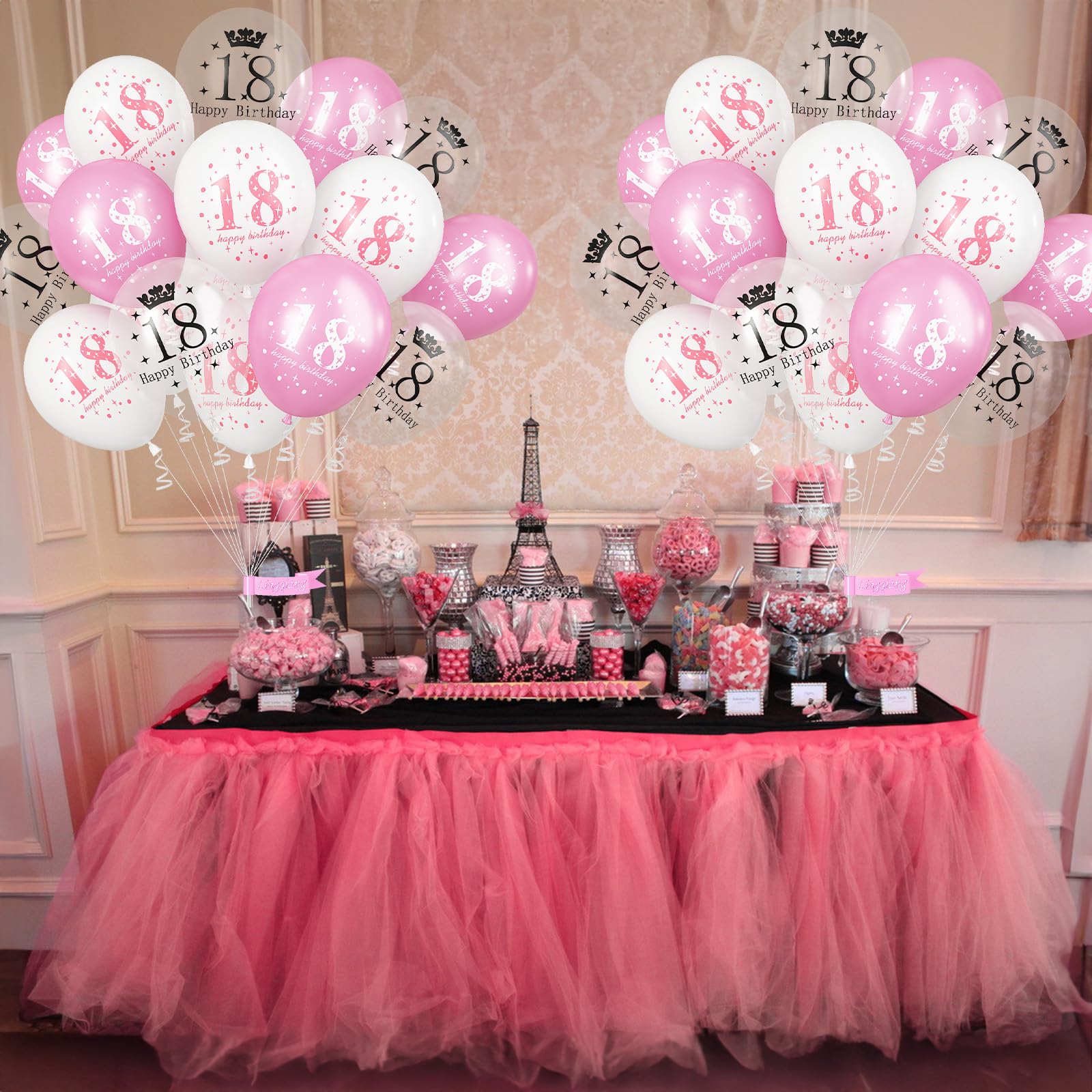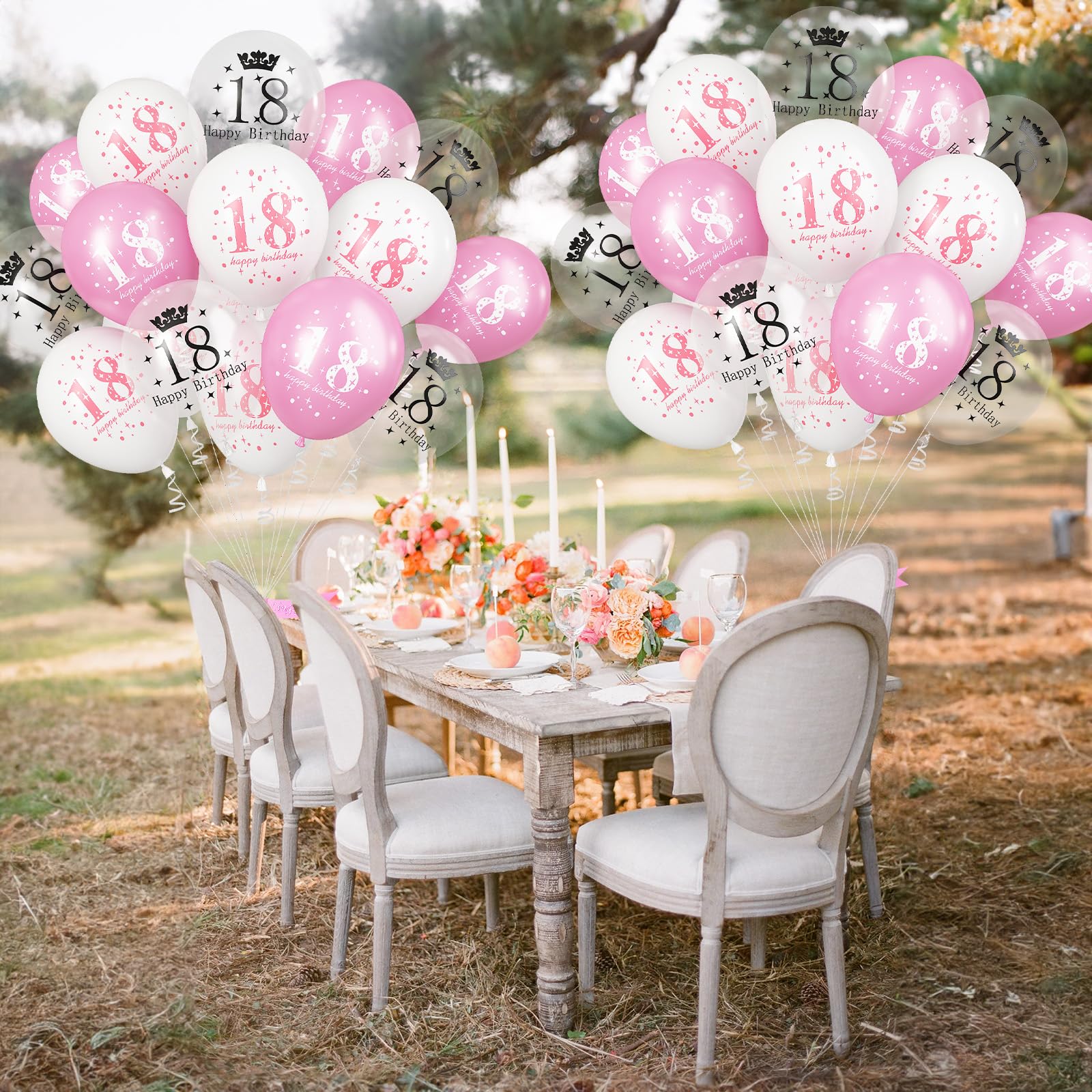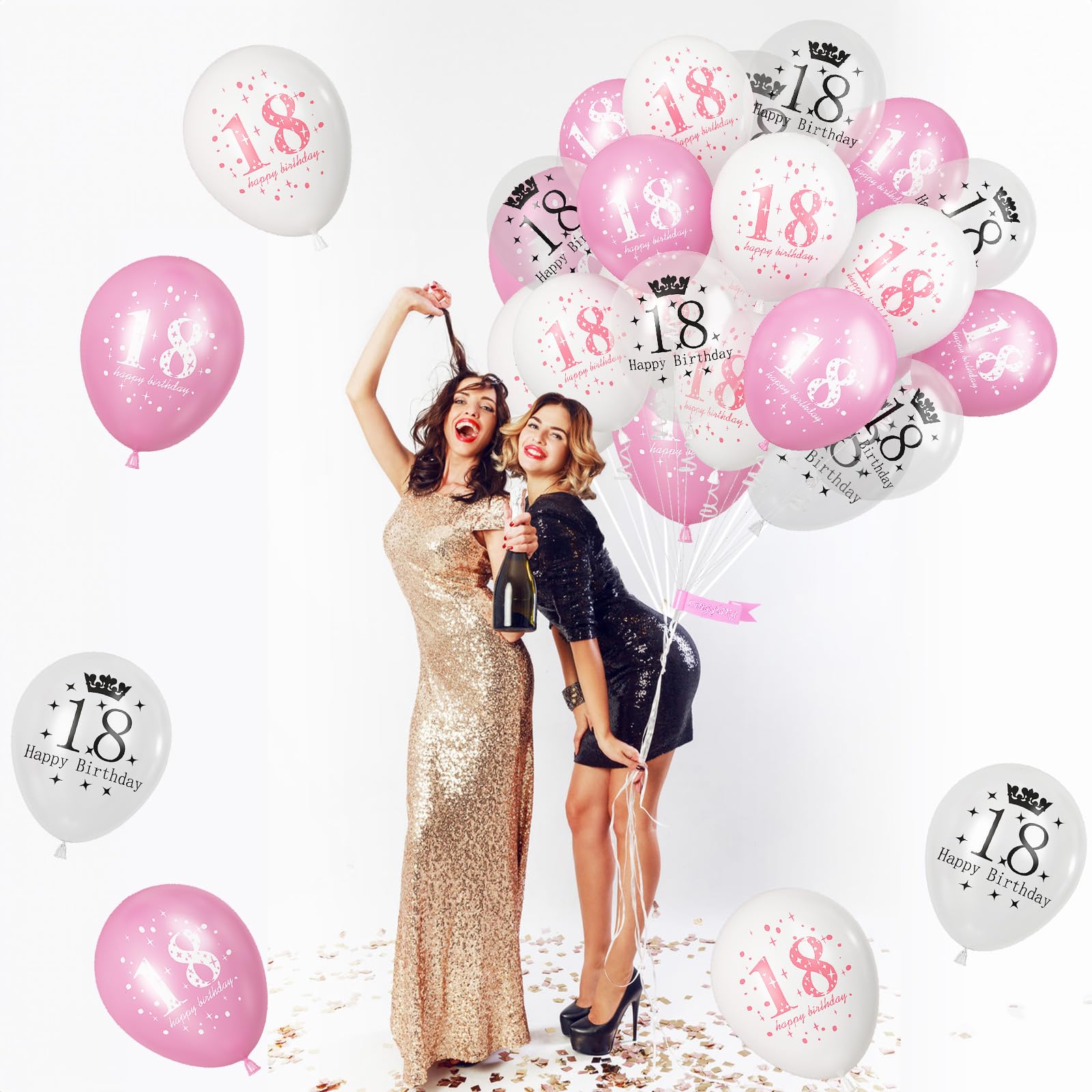 🎂 18th Birthday Balloons - You will get total 15 pieces 12 inch pink white happy 18th birthday latex balloons, inclulde 5 pcs pink print balloons, 5 pcs white print balloons, 5 pcs transparent print balloons, come with a balloon ribbon. Perfect for her girls 18th birthday party decorations supplies.