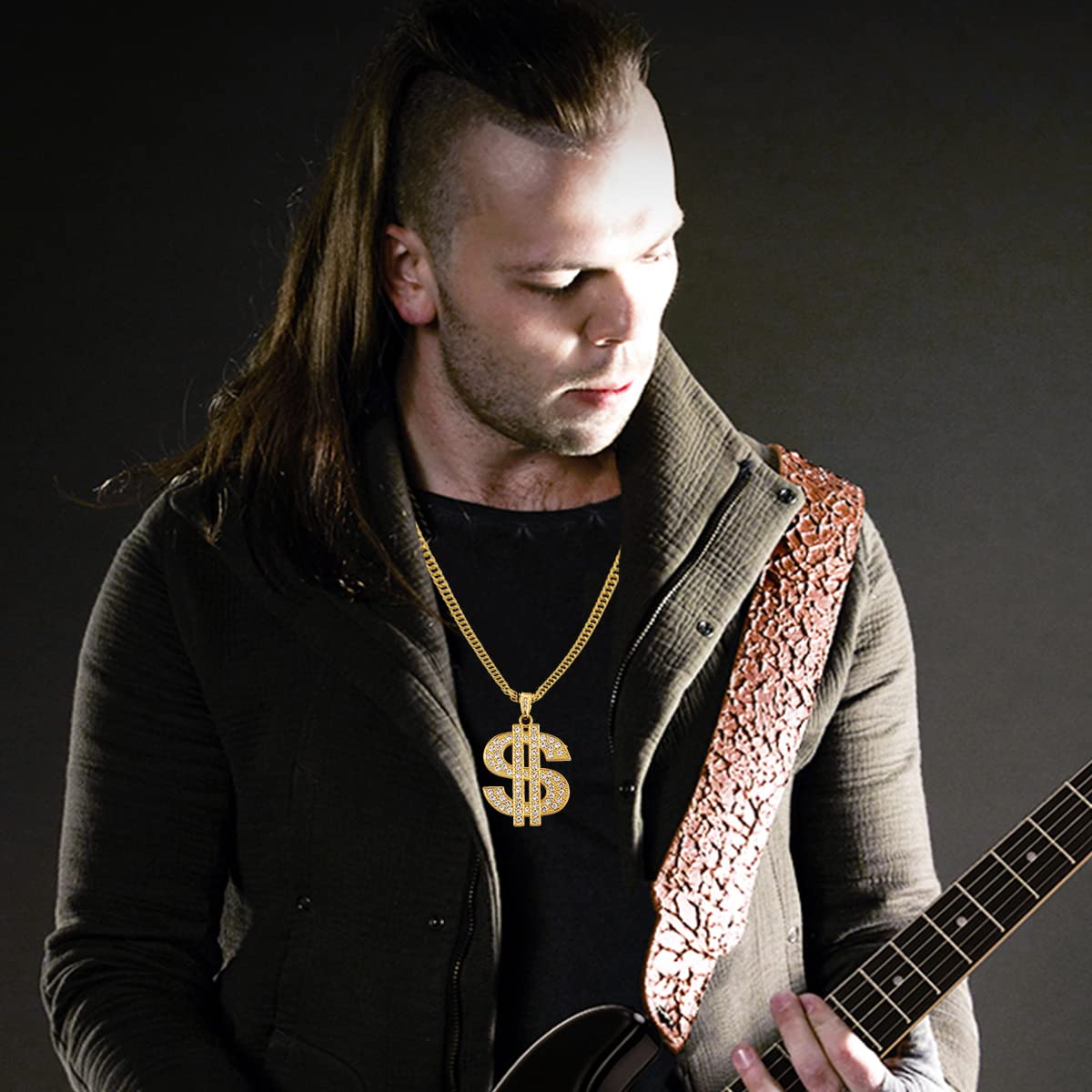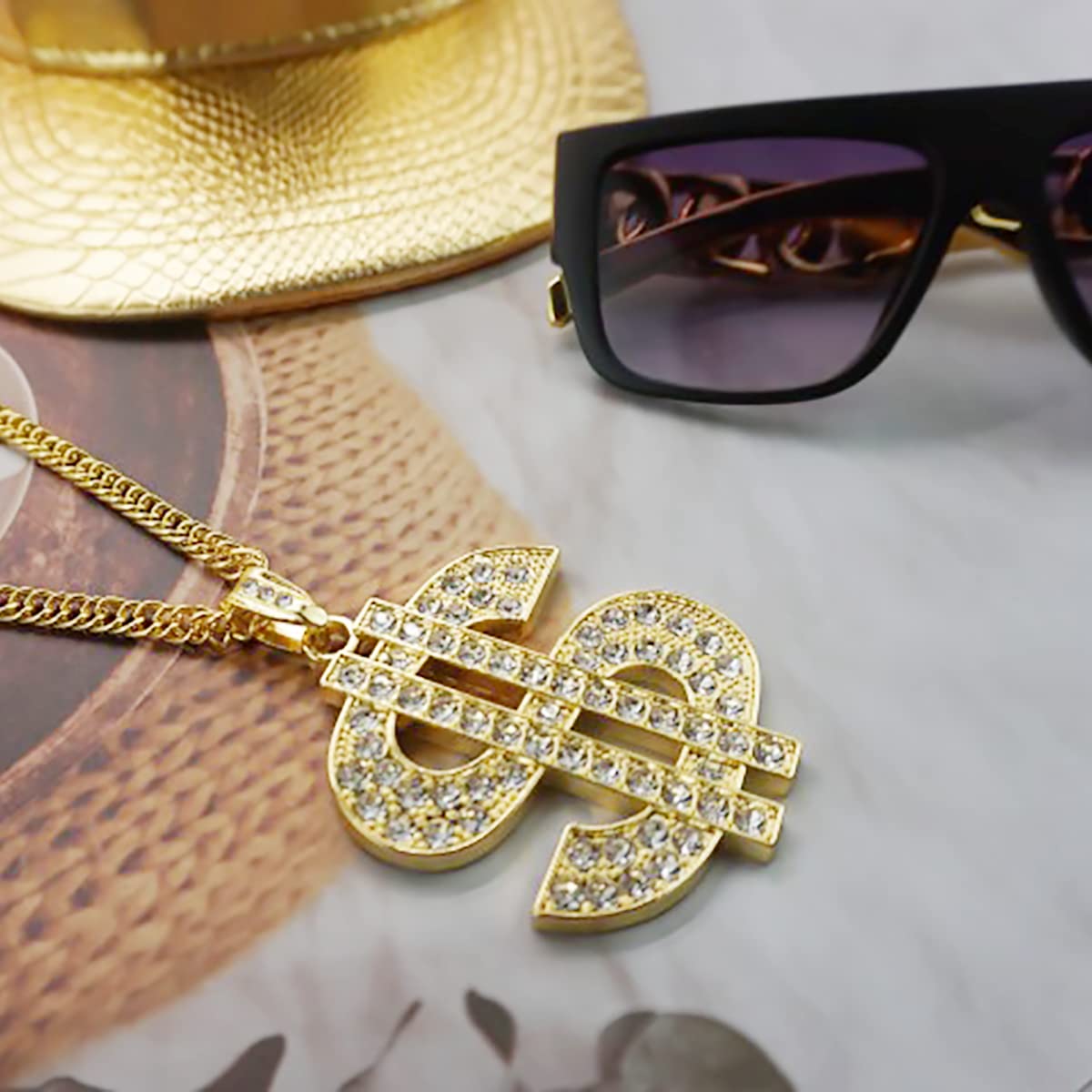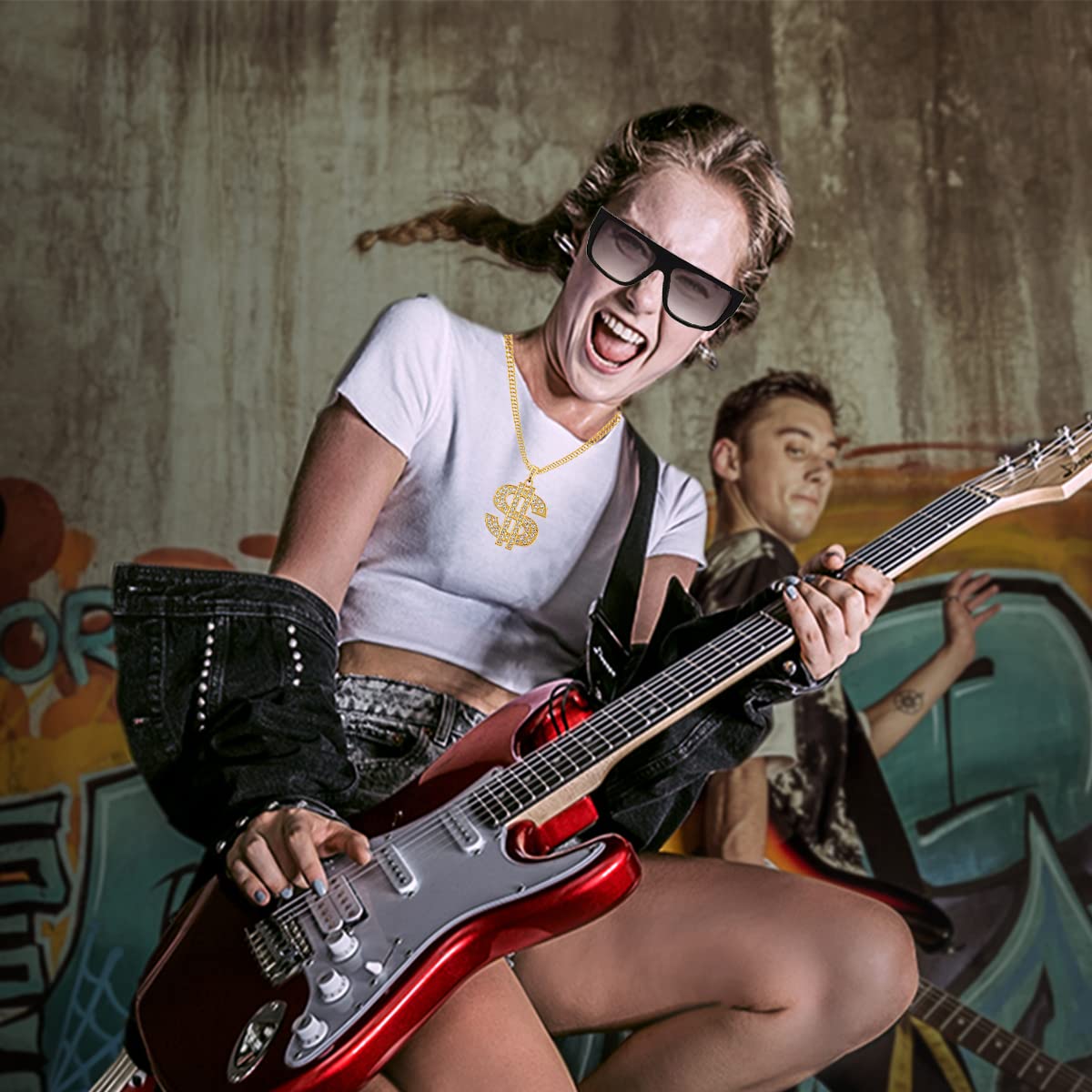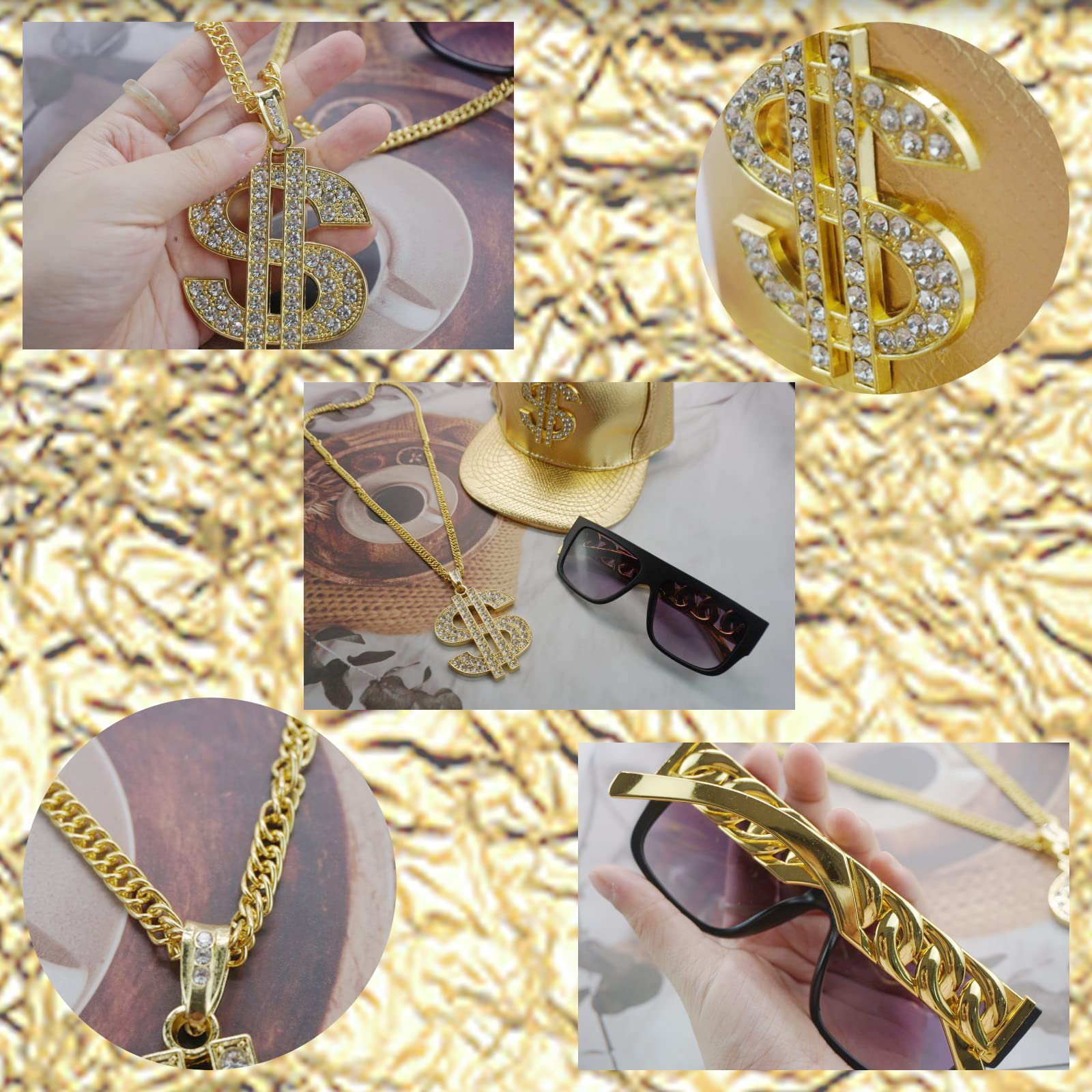 ใ80s 90s Hip Hop Costume SetใThe parcel contains a crocodile leather baseball hat, a golden hip -hop necklace with a dollar pendant and a golden coarse sunglasses. In the 1980s, the style of the 1990s will allow you to be led out of the party.