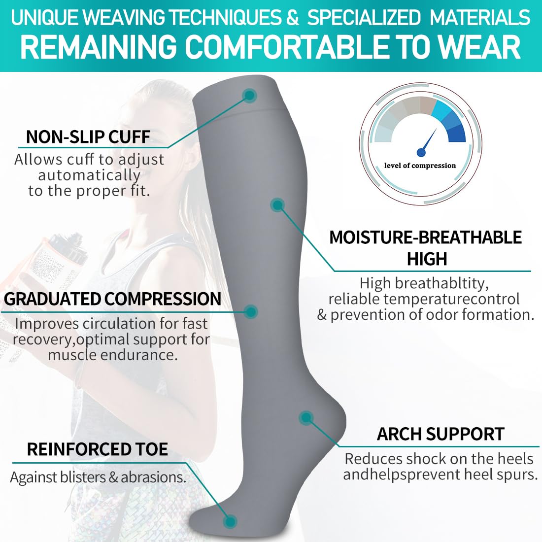 Ture Graduated Compression-Graduated compression is the most effective form of compression, and works differently than regular compression socks. Work by creating a 'pressure gradient' which helps to push oxygen-poor blood out of the feet and legs, and back to the heart. This improves circulation, boost energy levels, and relieves symptoms such as aches and pains, throbbing, swelling, blood pooling, provides the renewable and sustained energy and allows you to heal in the legs and feet.