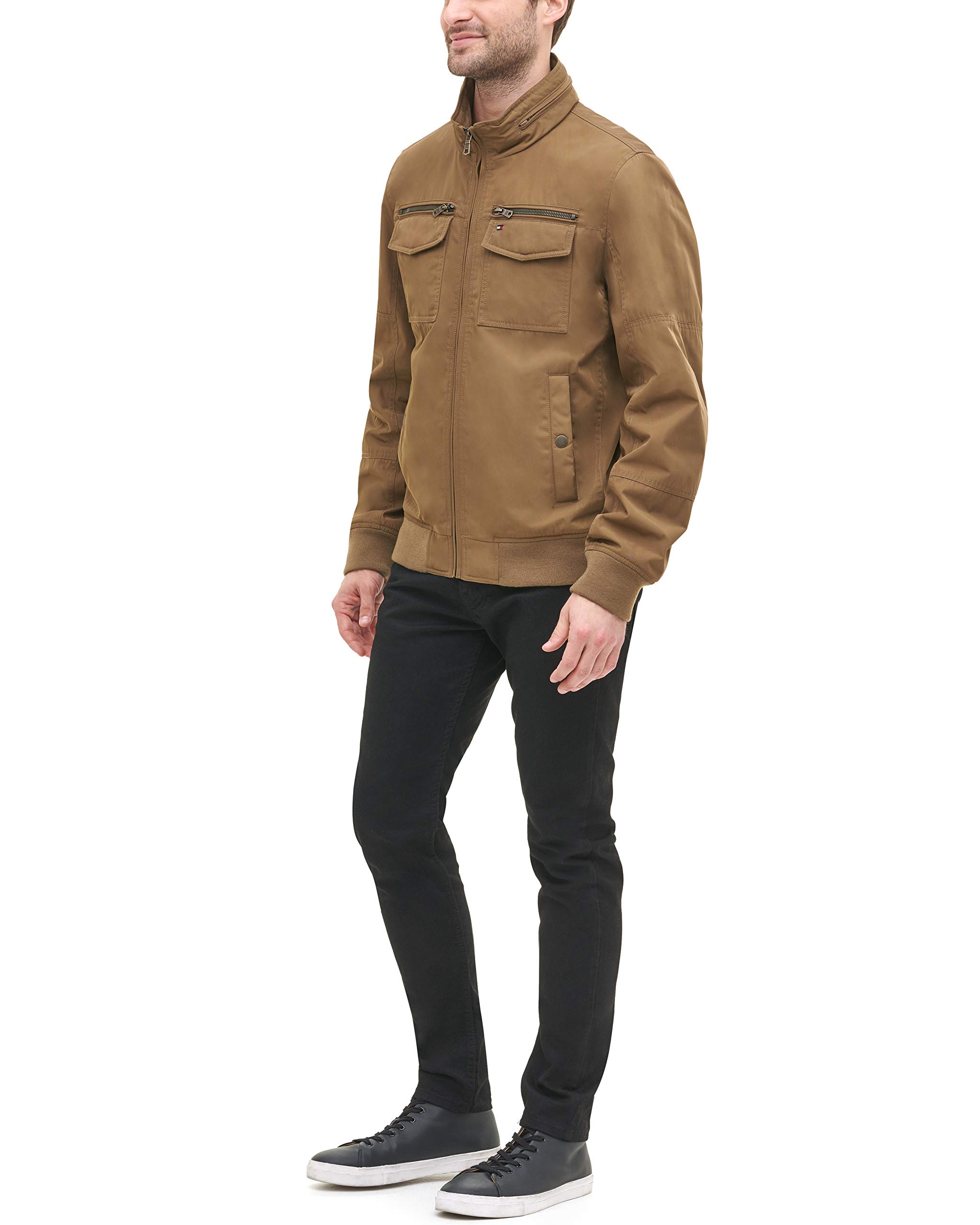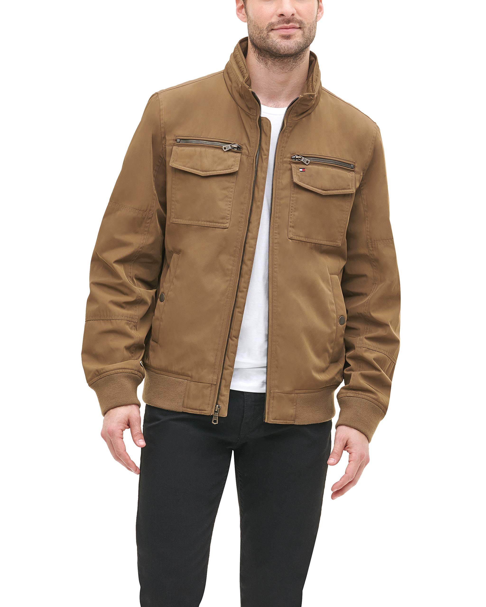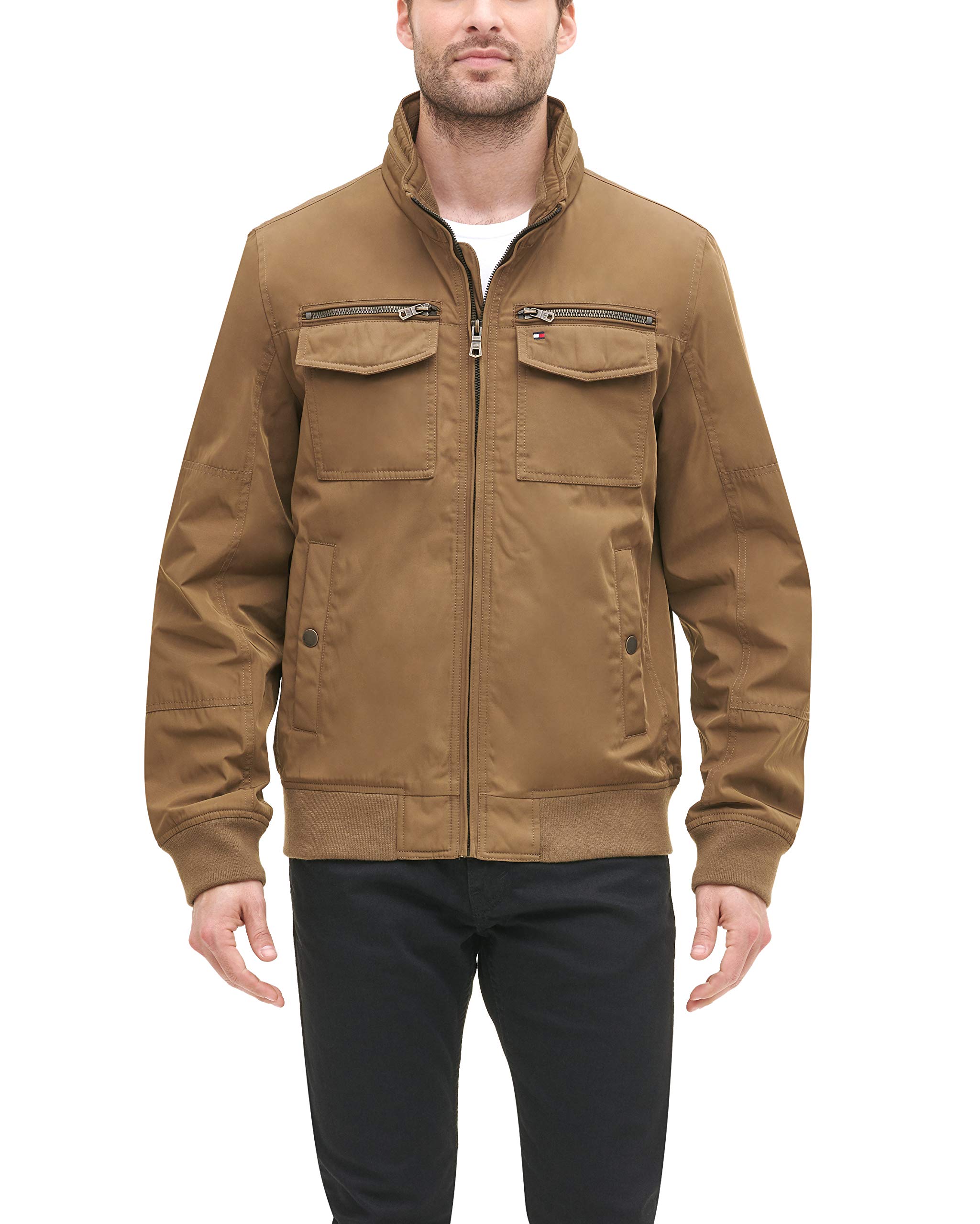 Description Poly twill four pocket performance mid-weight rib knit zip front bomber jacket with utility collar and hidden hood. Contrast quilted lining with light poly fill insulation.