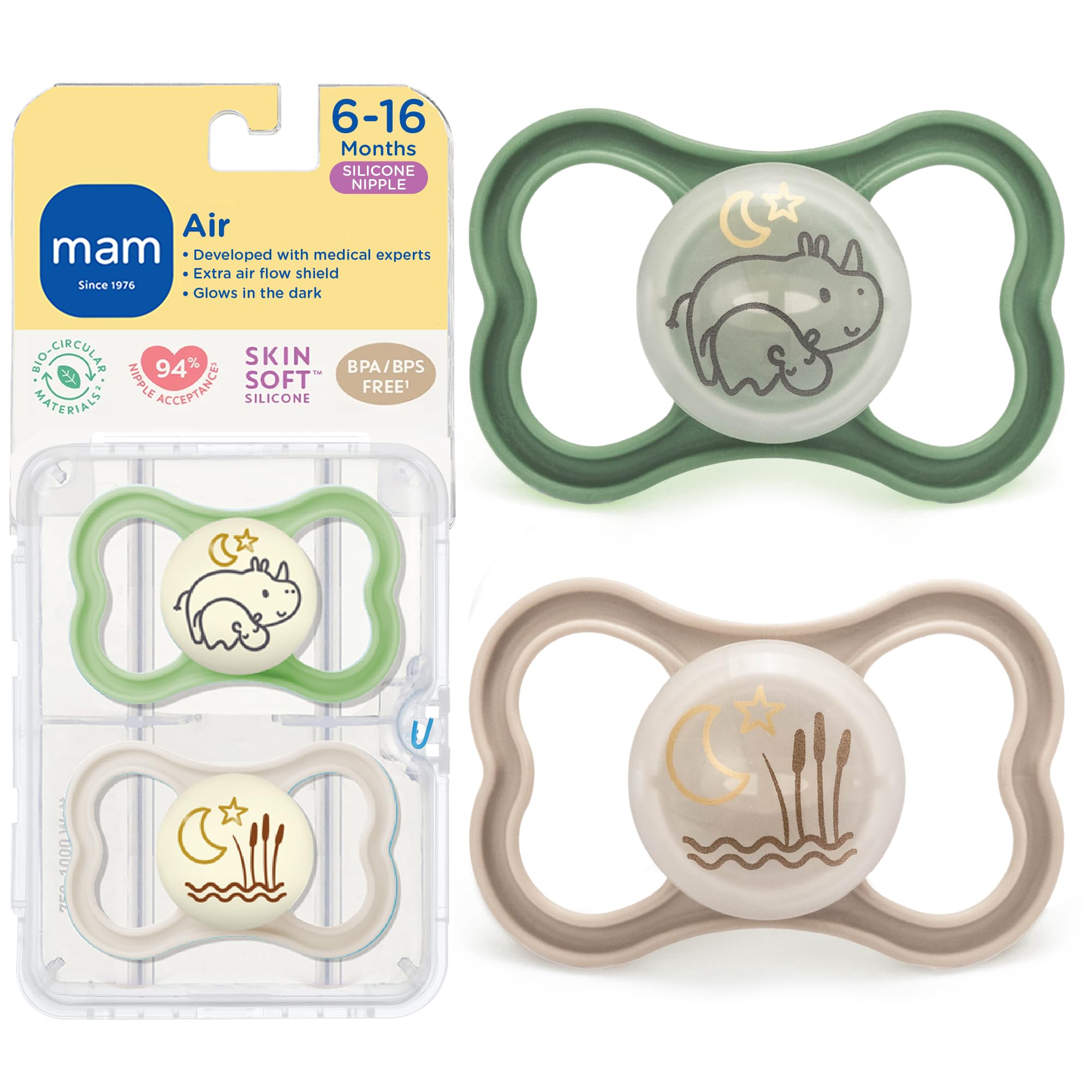 The MAM Air Night Collection pacifiers for baby has a shield that is specially designed for babies 6+ months with sensitive skin. The extra wide air holes allow plenty of circulation around your baby's mouth and even allow you to peek at their little smile. The pacifiers in this pack have a special glow in the dark feature that helps keep your baby's silicone pacifiers in sight without having to turn on the light and disturb their sleep. All MAM pacifiers feature our trademarked SkinSoft silicone nipples that feel like mom and help babies transition from being breastfed to using a pacifier. In fact, market research showed that MAM nipples are easily accepted by babies of all ages, with 94% nipple acceptance among babies tested*. The textured nipple stays easily in baby's mouth and is just the right size for your 6+ months old baby so their growing teeth, palate, and jaw will be safe. Additionally, the symmetrical orthodontic nipple shape means you won't have to worry about uneven pressure or fussing to turn the pacifier "right side up". **Market research 2010-2020, tested with 1,572 babies