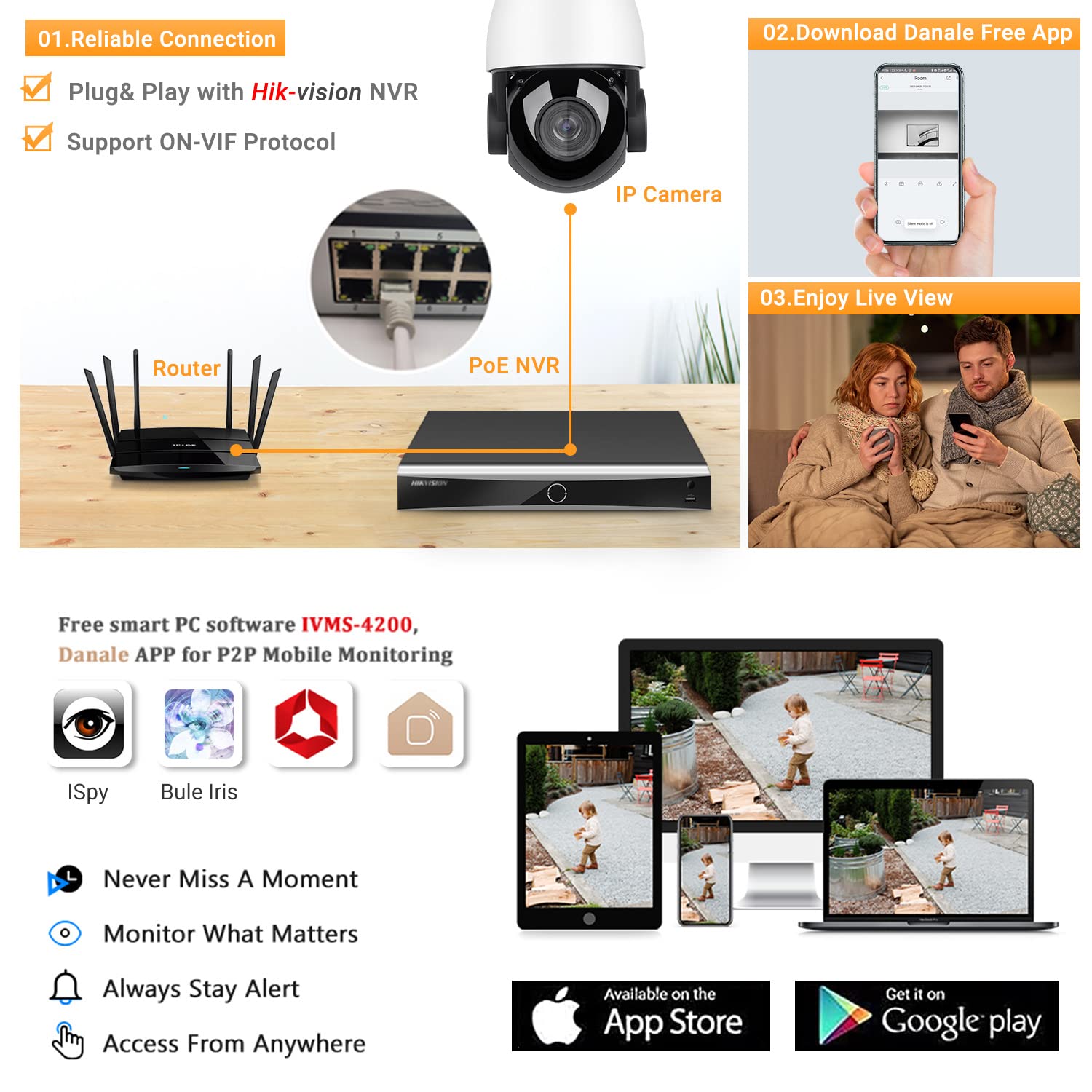 This 4k ptz camera can access the Apple App or Google Play Store through your smartphone, download the "Danale" App for iOS or Android devices for P2P control. We provide