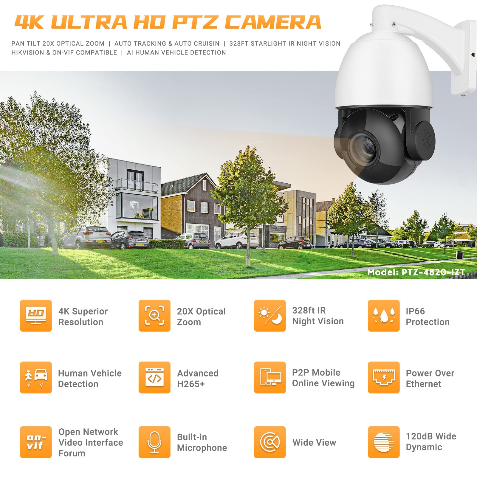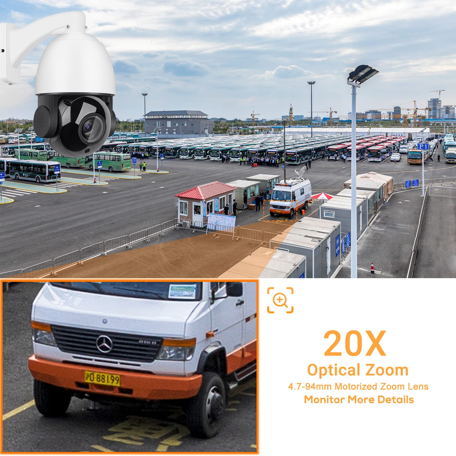 4K UltraHD & 20X Optical Zoom — The 8mp ptz camera has a 1/2.8" So-ny CMOS sensor, 3840x2160@20fps ultra-high pixels give a sharper picture, which is 2X sharper than the 4MP cameras. The built-in 20x optical zoom 4.7-94mm autofocus lens also allows you to zoom in for more detail and zoom out for a wider field of view. (If you need this ceiling mount for ptz camera, we recommend buying ASIN: B0C4HSQBHH)