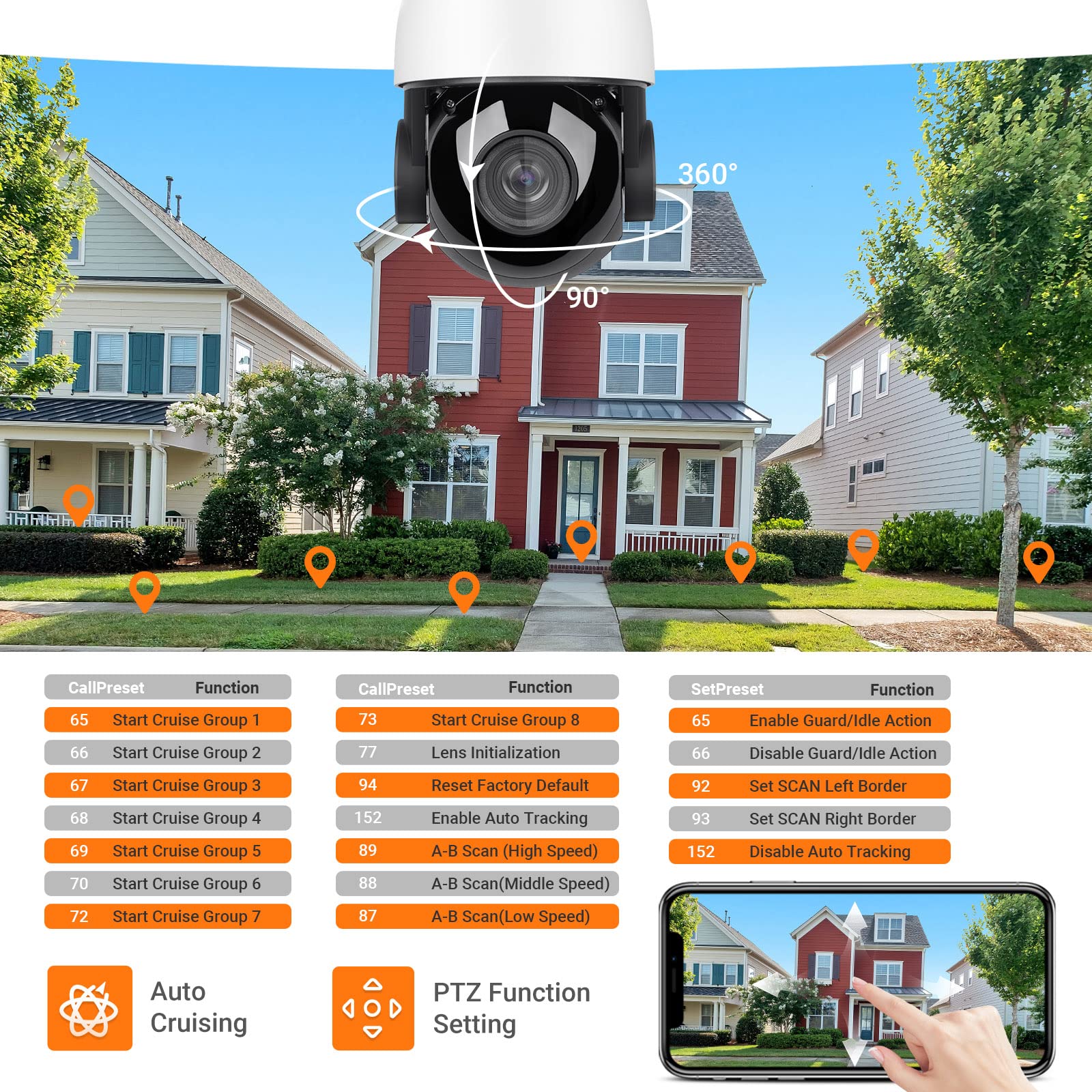 Advanced H.265+ Coding & Audio Recording — PTZ IP Security camera provides smooth stream, records more videos and consumes less bandwidth with the latest H.265+ coding. The built-in microphone with the environment noise filtering records clear voice, providing vivid videos with sound without just silent live stream or playback, get 24/7 recording all the year round.