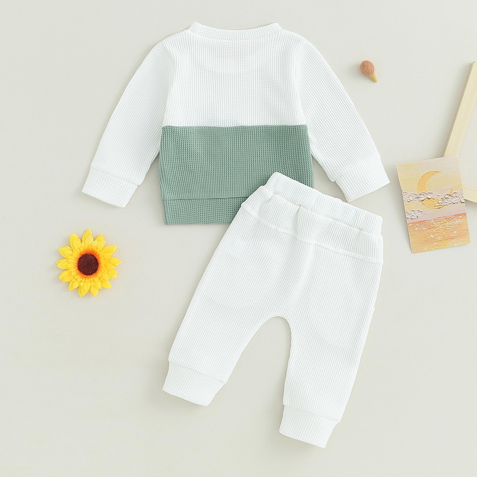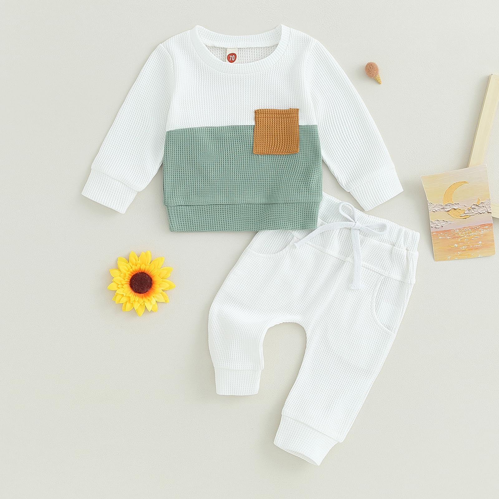 Design: Toddler baby boy fall winter clothes, color block long sleeve waffle knit crew neck pocket pullover sweatshirt jumper tops, casual baby boy long pants joggers, toddler baby boy fall clothes,waffle striped baby boy outfit