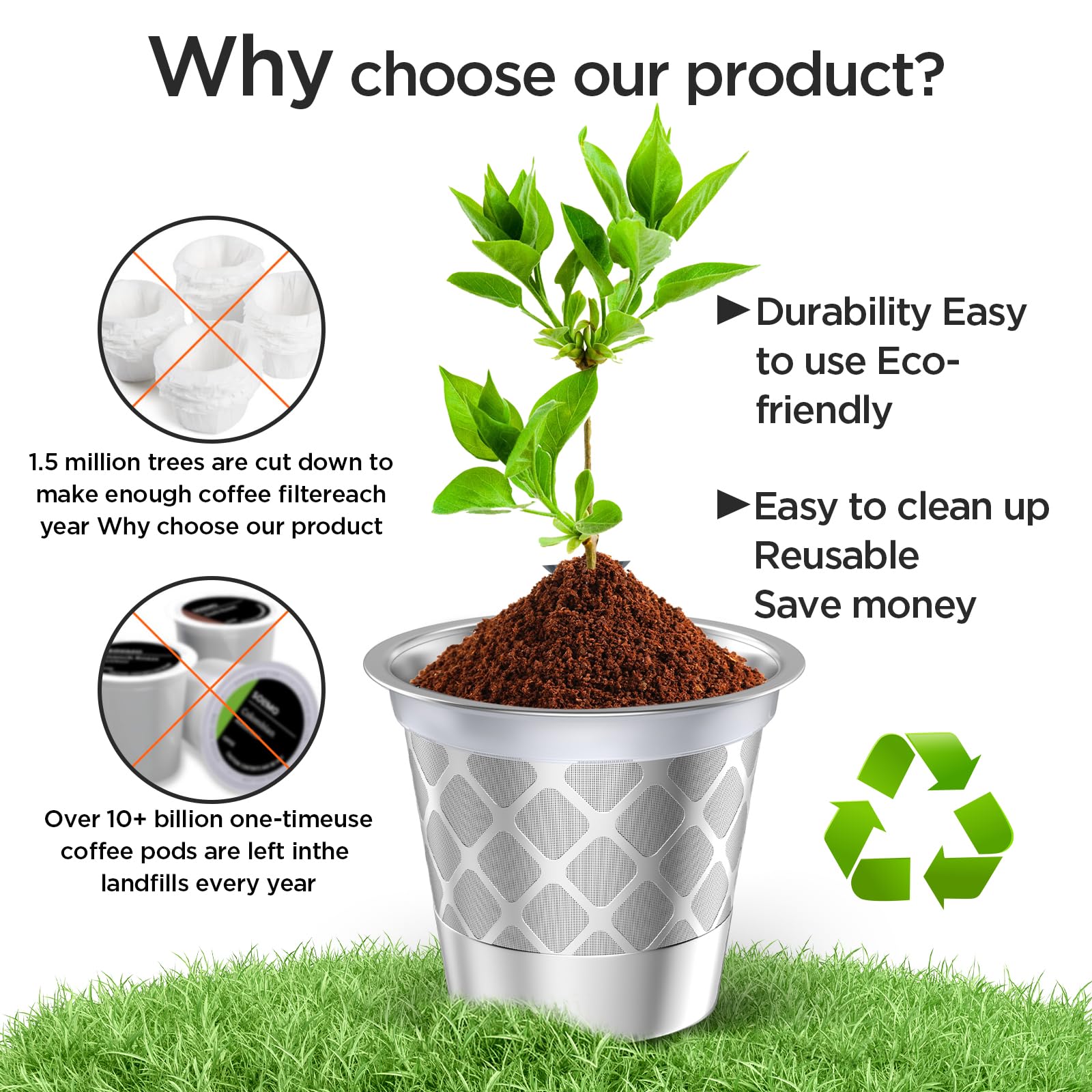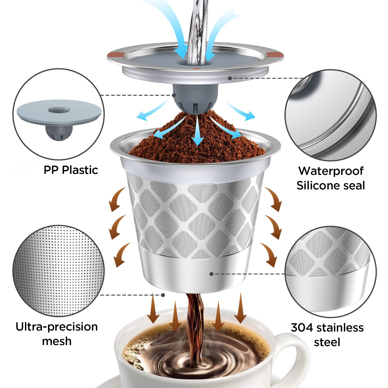 Original patented design- K CUP Reusable are very easy to use, just fill the coffee grounds you need into the stainless steel coffee k cups, after using, just dump the grounds into the trash and wash the reusable K CUP filter by water.