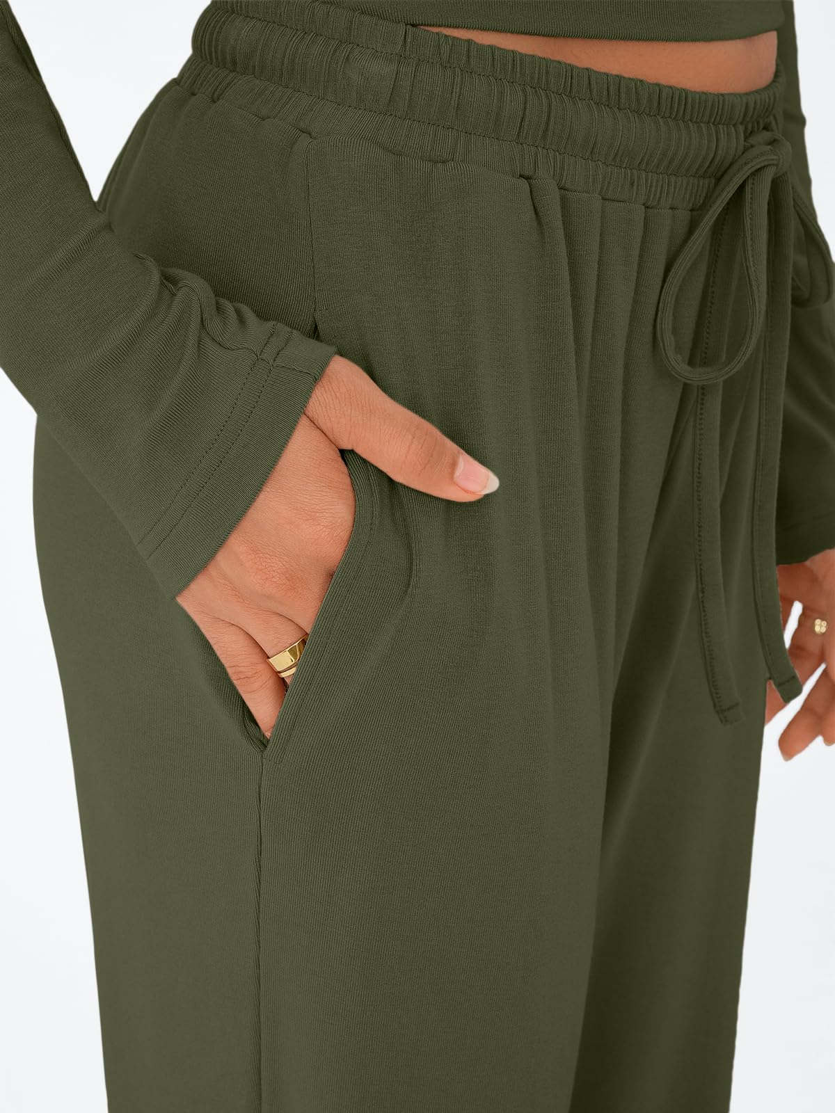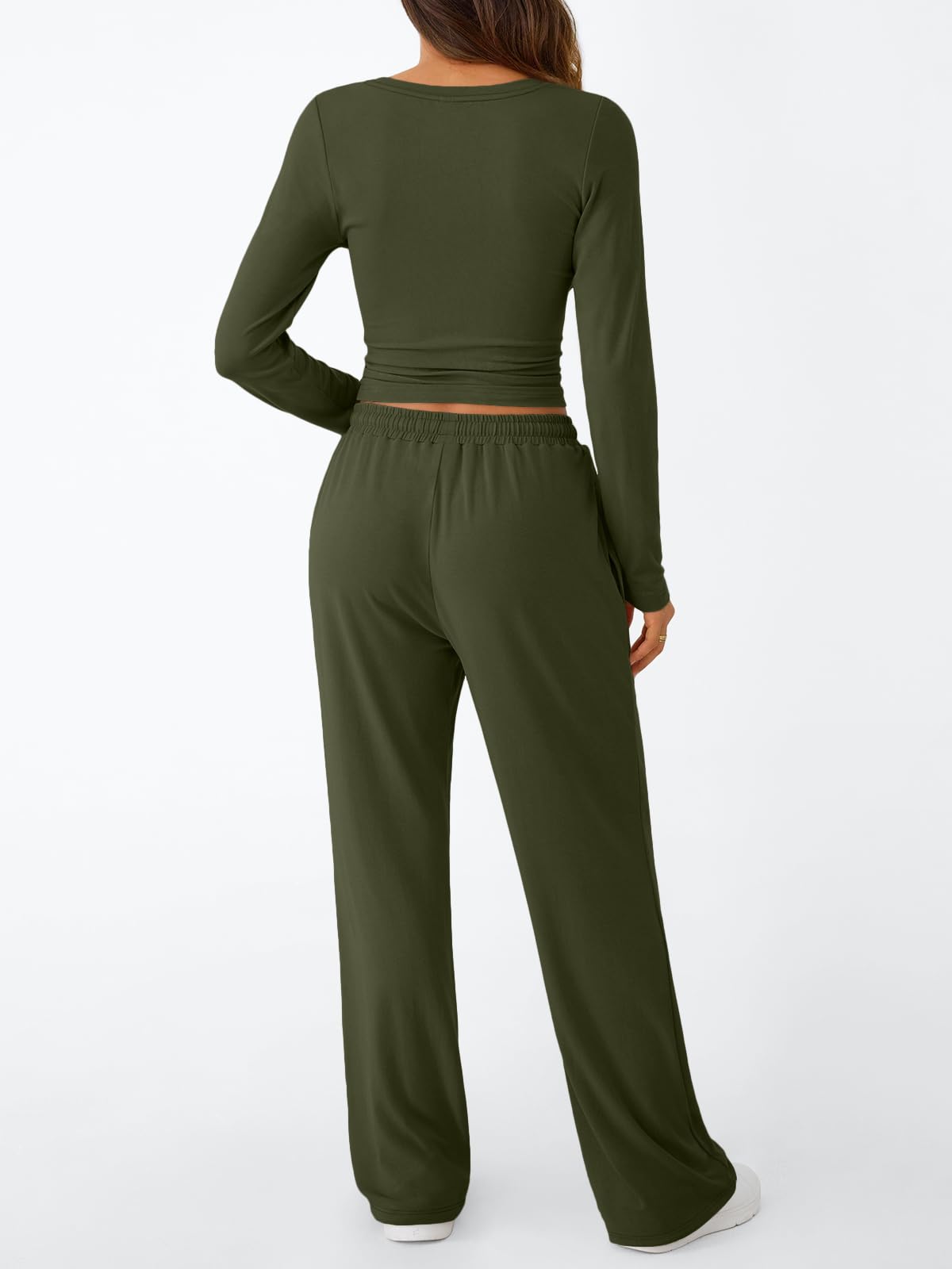 Design & Style: With a sleek crop top and wide-leg pants, this set is designed for those who love a mix of style and relaxation. The side ruching adds a touch of elegance, while the drawstring waist on the pants guarantees a comfortable fit that moves with you.