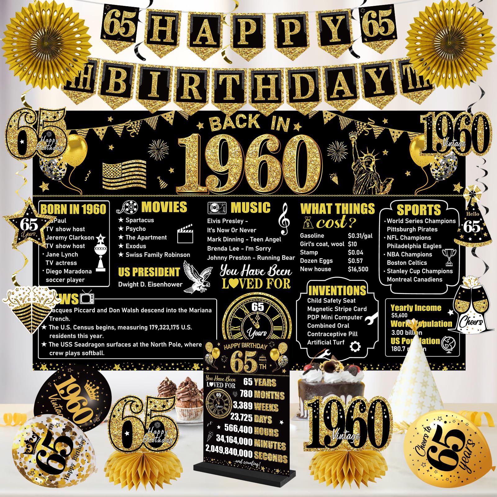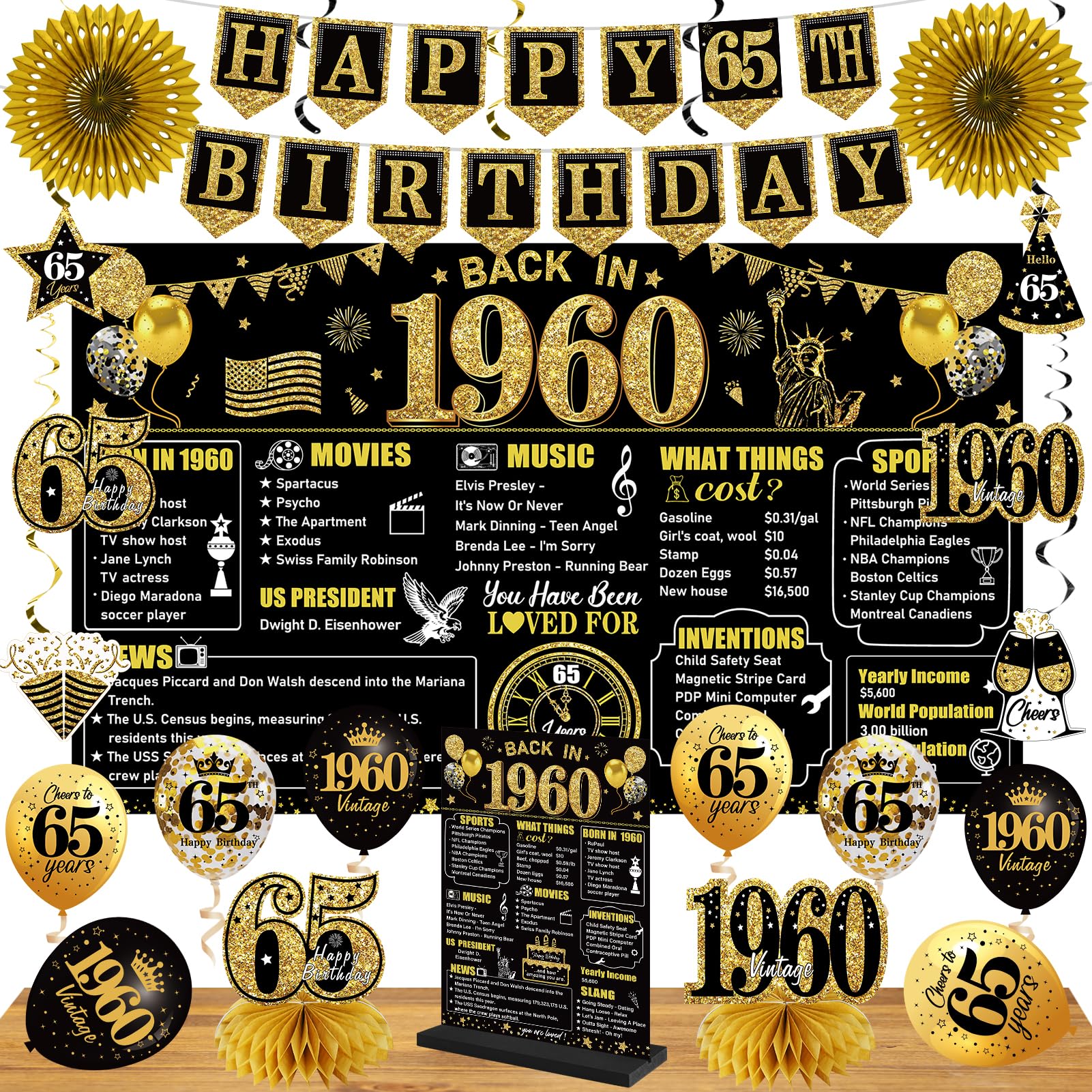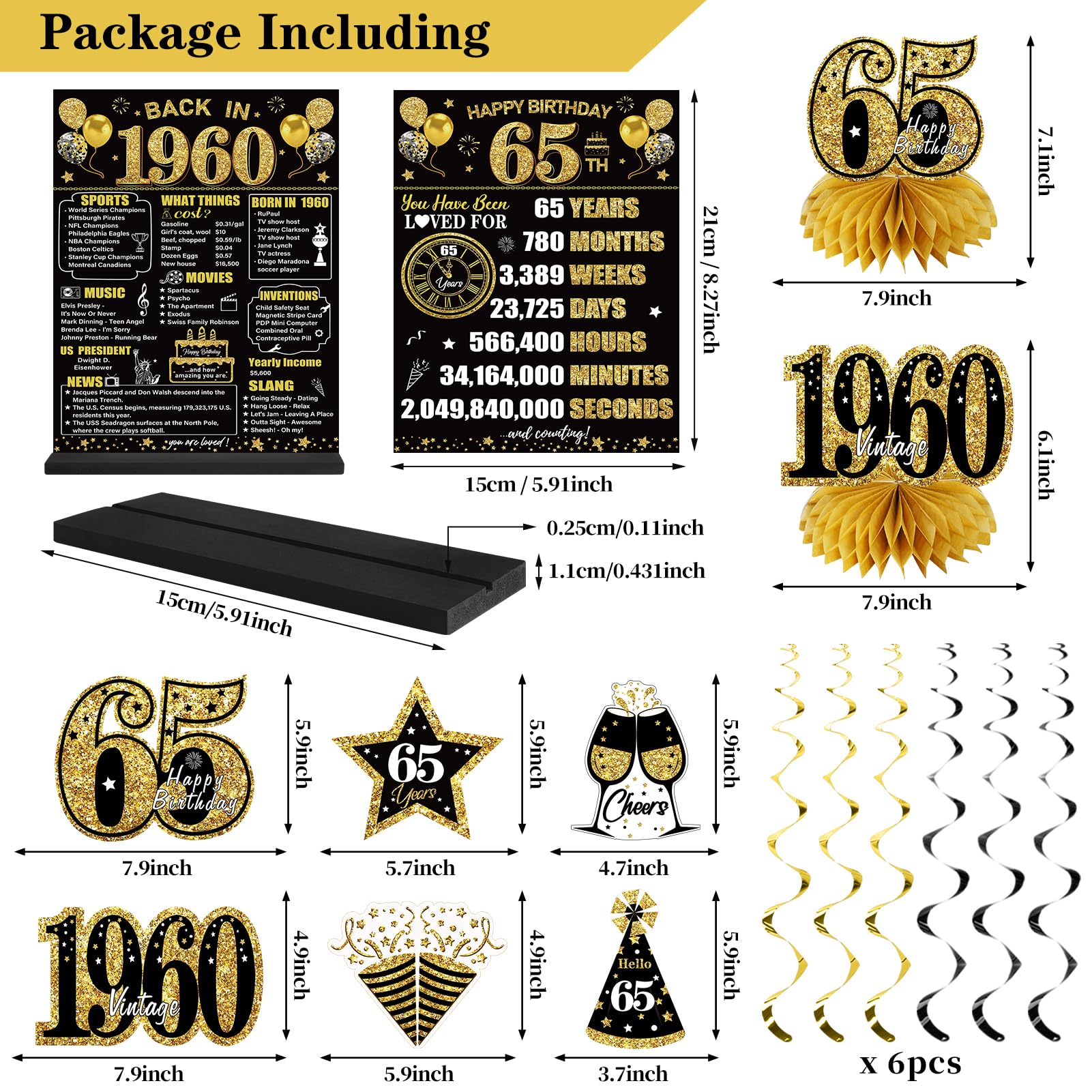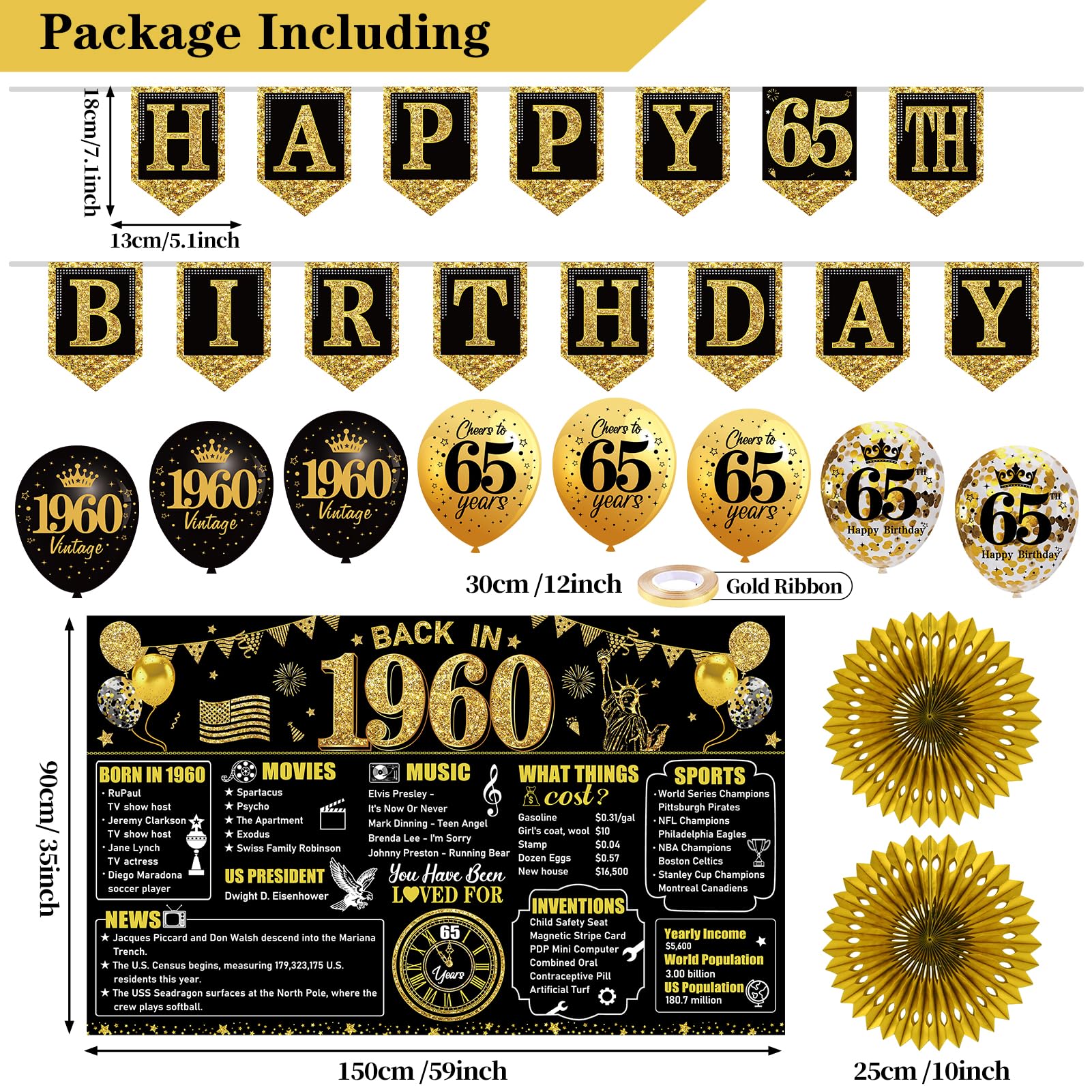 65th Birthday Decorations Kit: 1pcs Back in 1960 Banner Backdrop,1pcs Back in 1960 Table Poster Card,1pcs “65 Happy Birthday” banner, 6pcs Hanging Swirl, 8pcs 12inch balloons,2pcs Honeycomb Centerpiece, 2pcs 10 inch paper fan. The 65th theme birthday party decoration kit is enough to meet your decorating needs and easily create a strong birthday atmosphere in your home