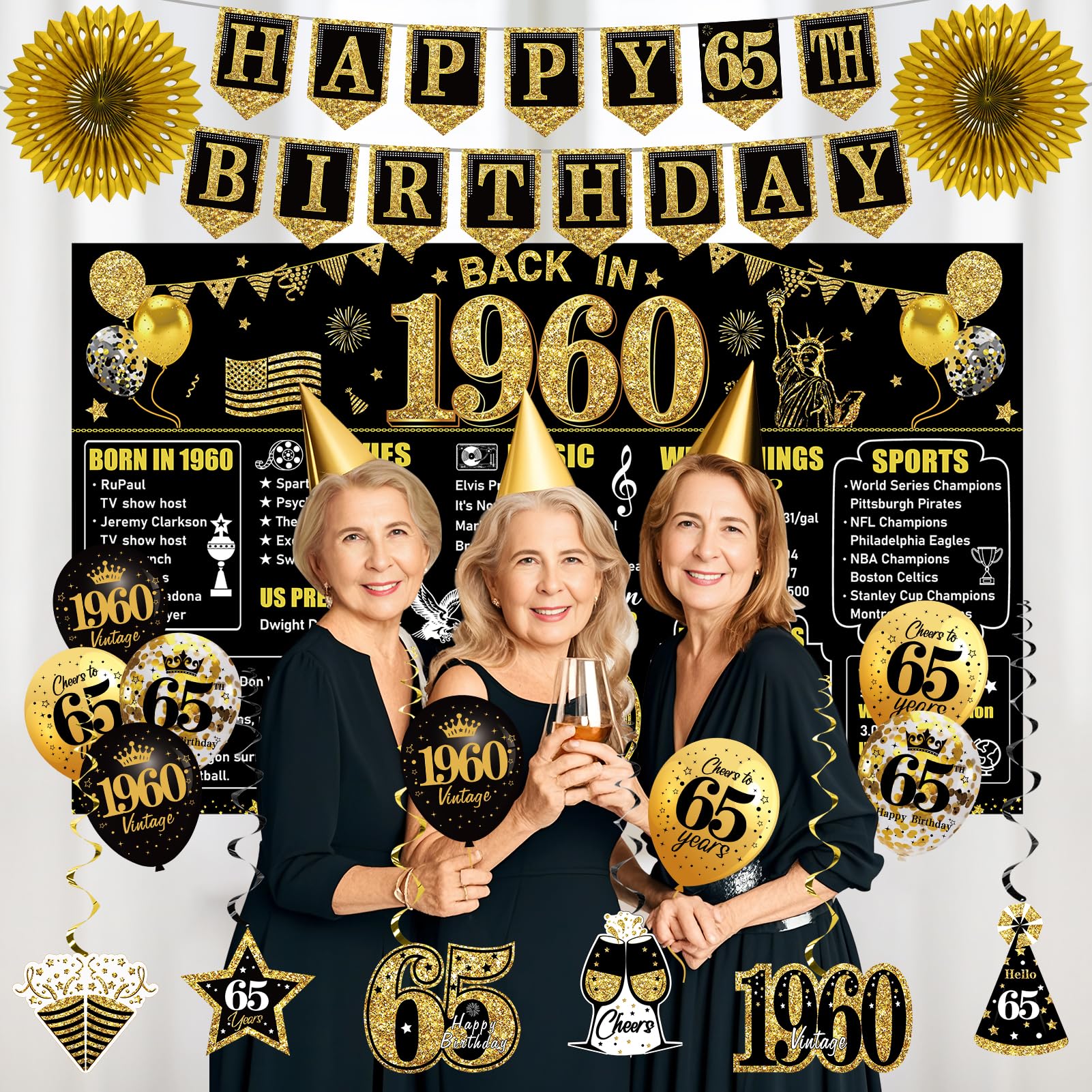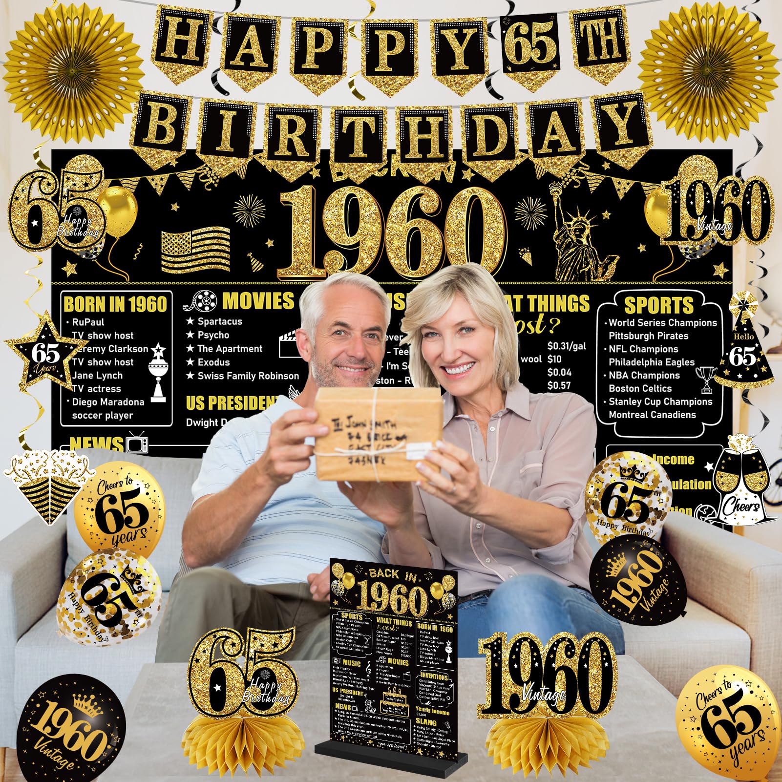 Celebrate Birthday moments with our 65th Birthday Decorations Kit! This kit includes everything you need to create a great atmosphere. The gold and black color will make it stand out and elevate the overall look of your party. Packaging includes: 1pcs Back in 1960 Banner Backdrop 1pcs Back in 1960 Table Poster Card 1pcs “65 Happy Birthday” Banner 6pcs Hanging Swirl (Black,Gold) 8pcs 12inch Balloons (Black,Gold,Confetti ) 2pcs Honeycomb Centerpiece 2pcs 10 inch Gold Paper Fan