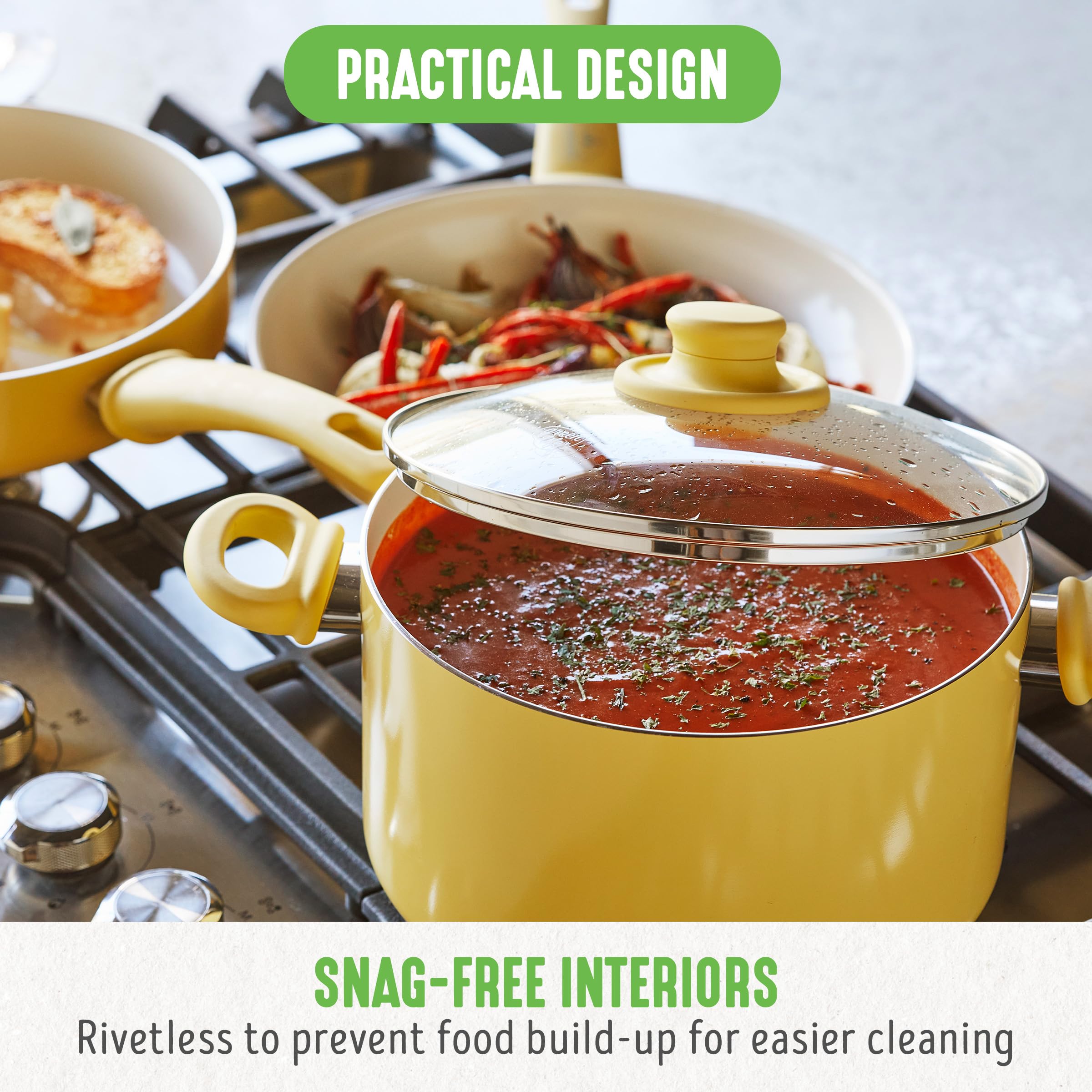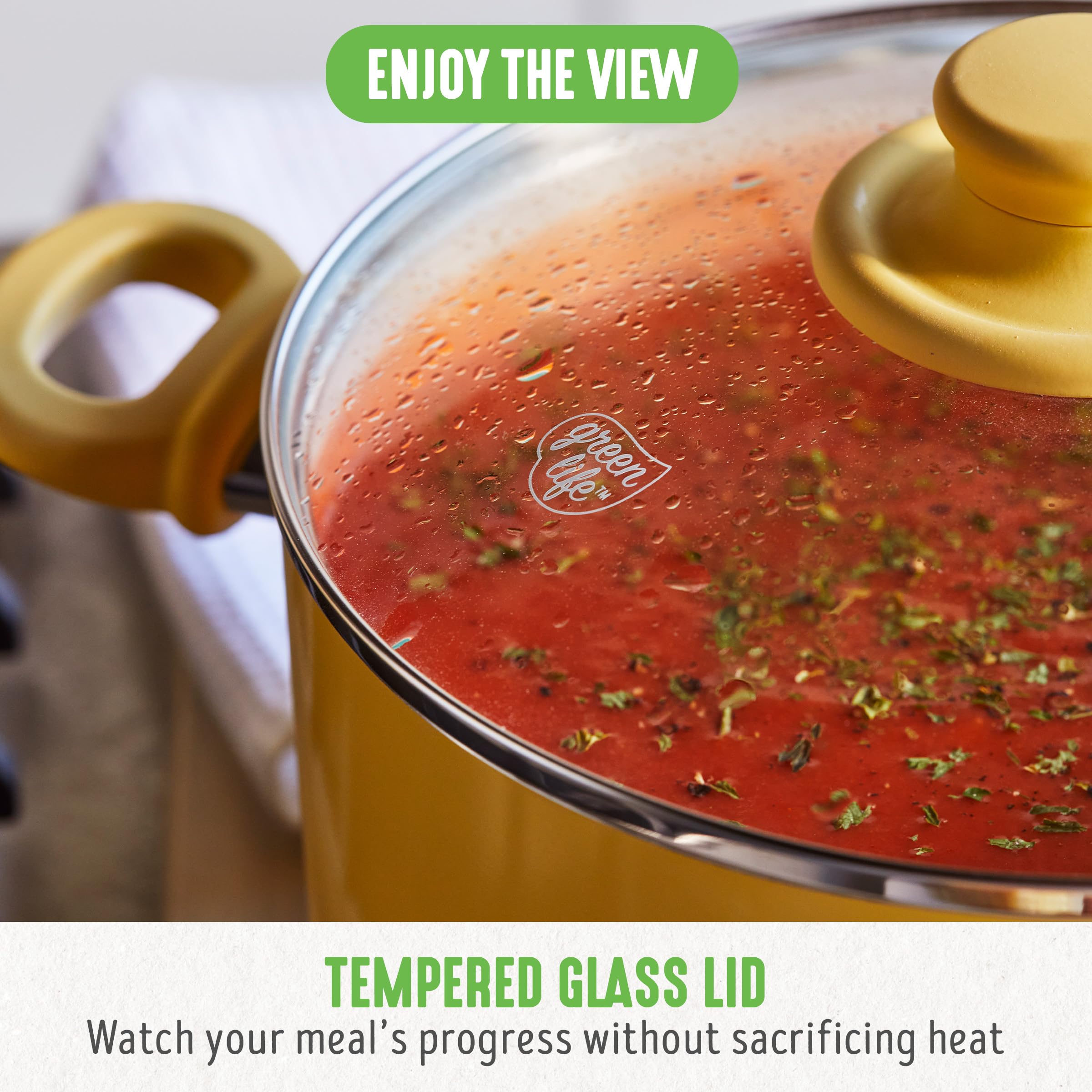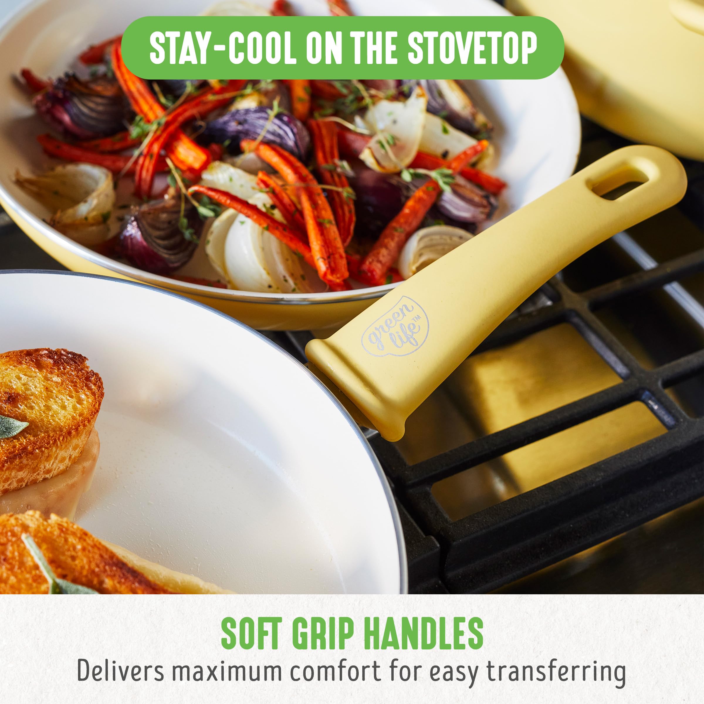 The Soft Grip collection is all about comfort and control. Designed for effortless performance and cleanup, this set features our toxin-free Thermolon nonstick coating, which is free of PFAS, PFOA, lead, and cadmium. GreenLife’s healthy ceramic nonstick is not stuck in the past—that’s why our ceramic nonstick starts with sand and creates 60% less CO2 emissions during the curing phase than traditional coatings. The pans are also crafted with recycled aluminum, because we want your kids’s kids to cook healthy, too. Finished in vibrant colors, this set is outfitted with stay-cool handles to keep your cooking comfortable. Durable glass lids for a good look at any meal in progress without sacrificing heat. For all stovetops, except induction. Oven safe to 350°F. Dishwasher safe. This cookware set includes: 4-inch mini frypan, 7-inch and 9.5-inch open frypans, 1-quart and 2-quart covered sauce pans, 5-quart covered stockpot, 2.5-quart covered sauté pan, stainless steel steamer, and 4 kitchen utensils.