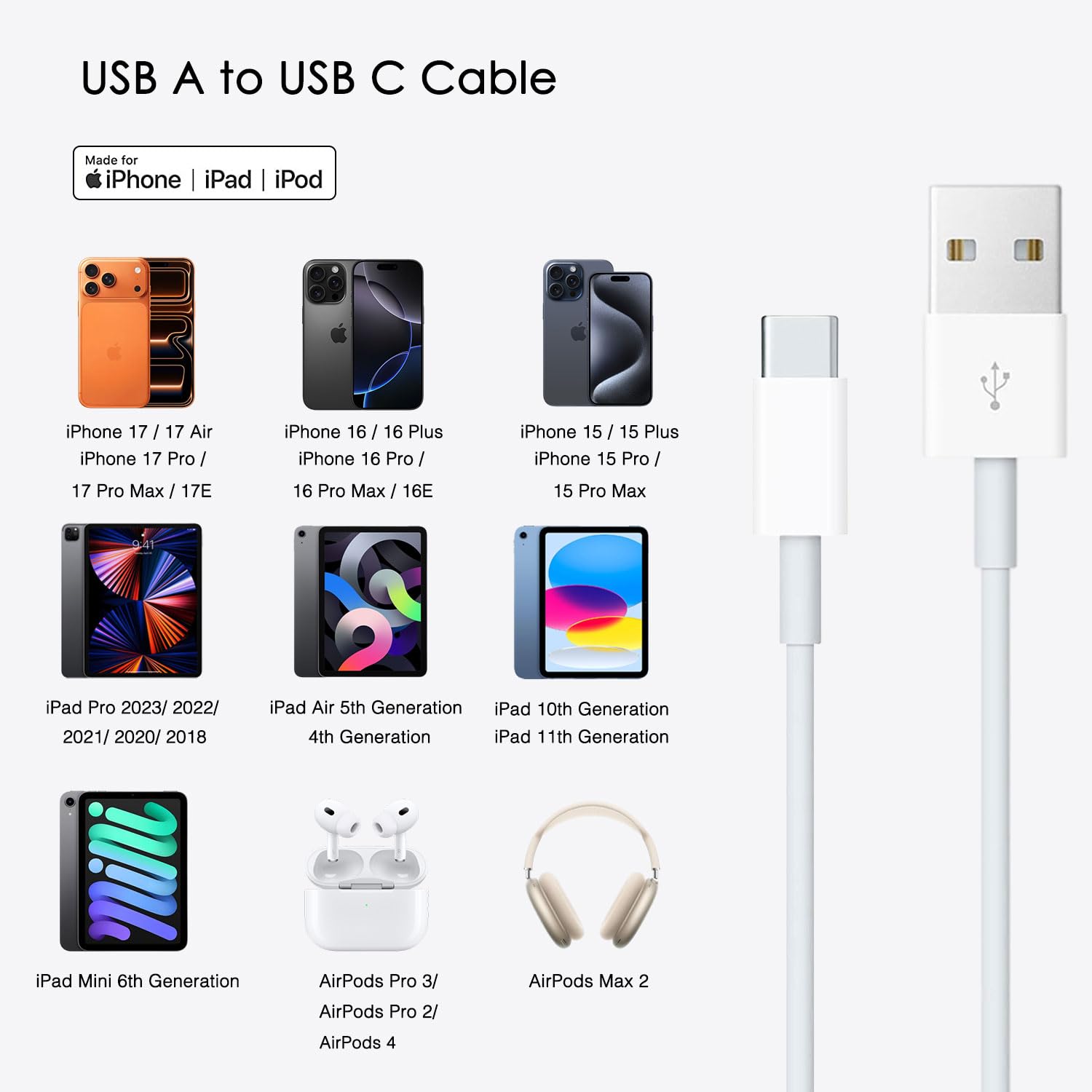 This USB A to C Cable, Compatible for: iPhone 15 All series, iPhone 16 All series, iPhone 17 All series, IPhone 16E (SE4), IPhone 17E (2026)