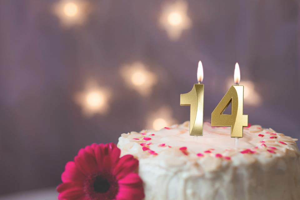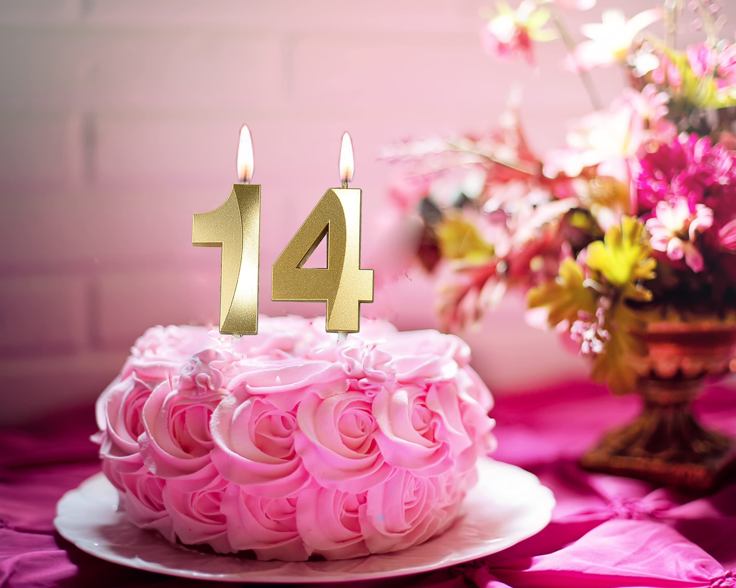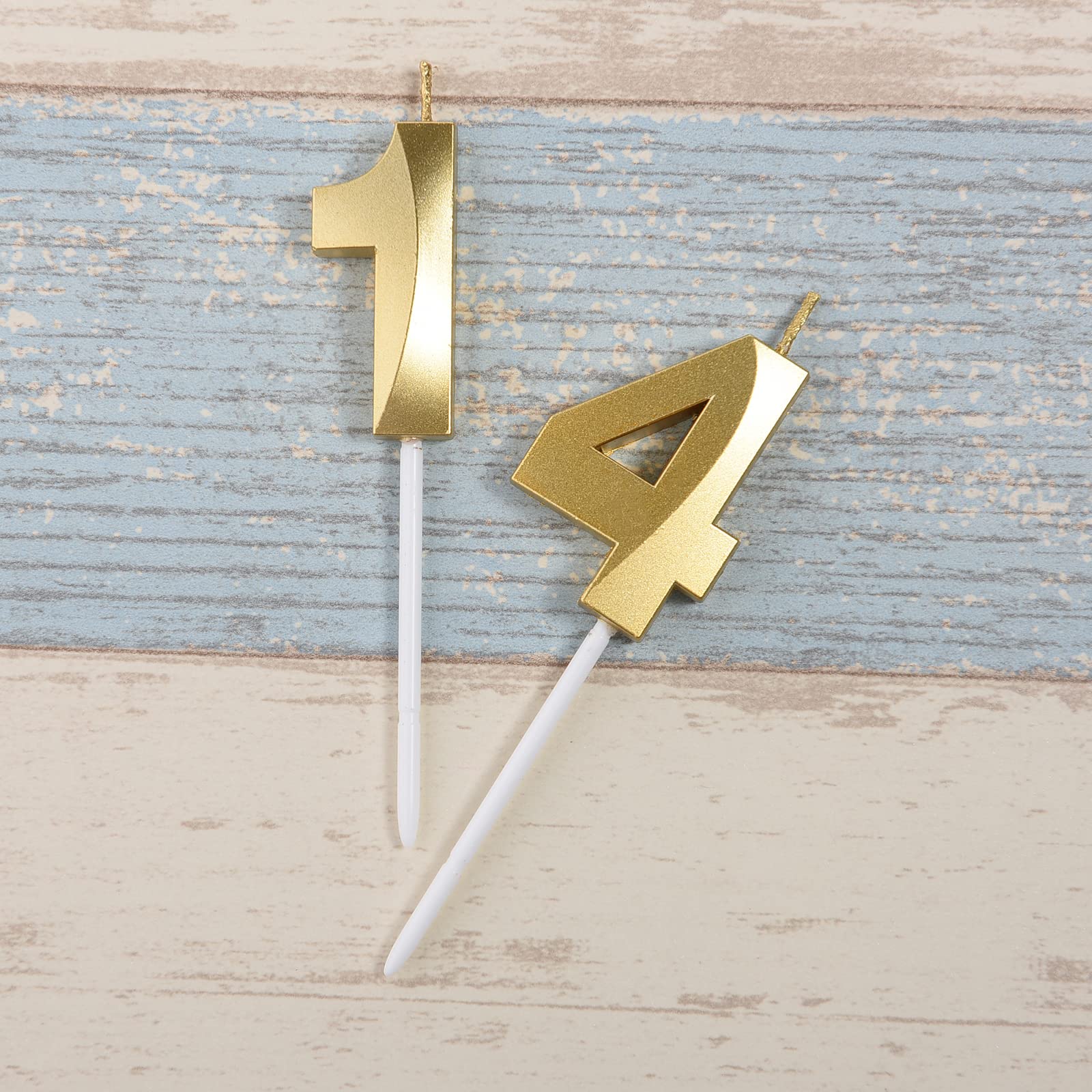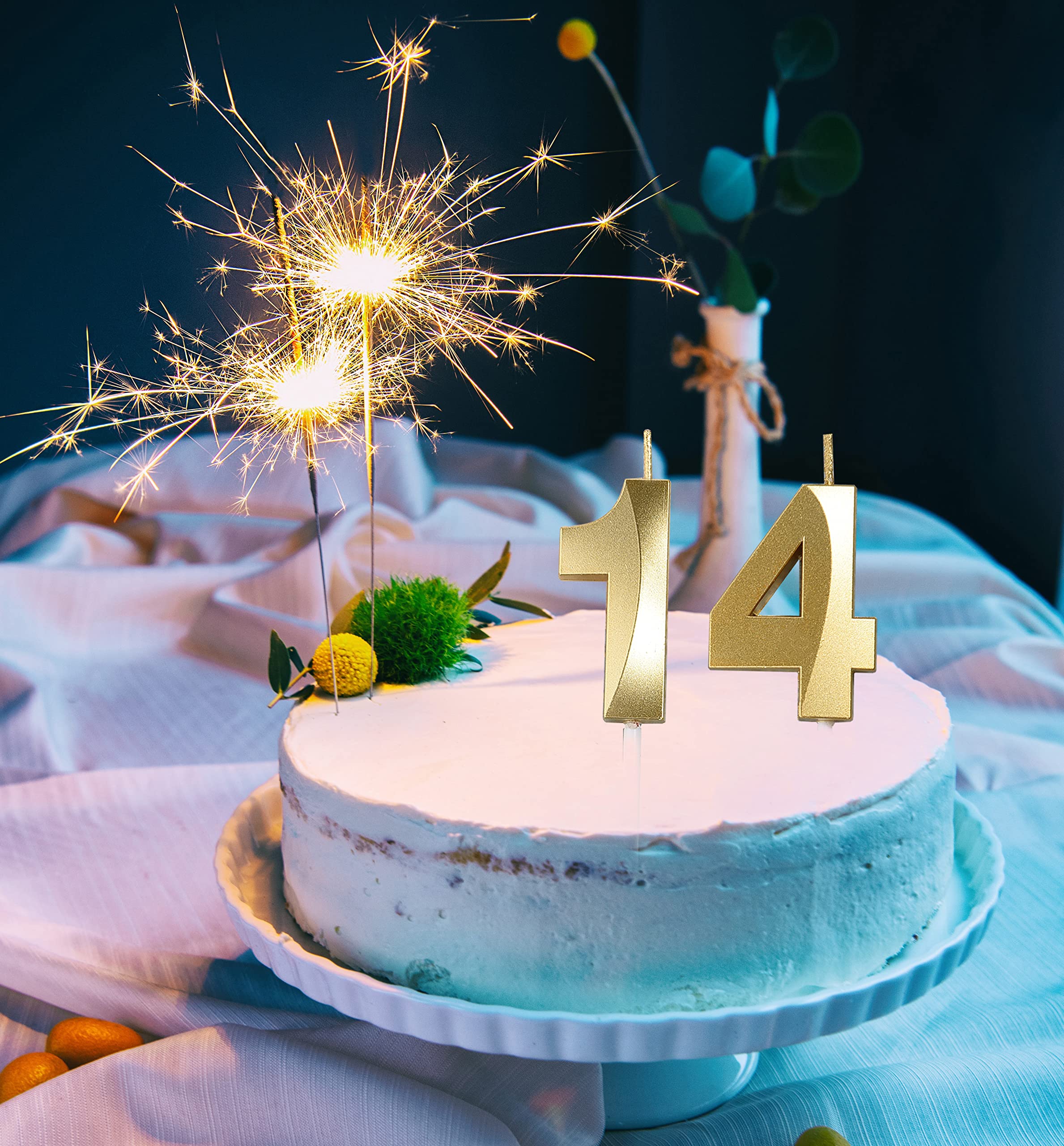 INSTRUCTIONS: Size: Width:1.3 in. Number height: 1.9 in. Total height: 4.8in Color : Glitter Gold Material : quality wax ,smokeless and non-toxic Burning Time :approx 4-5 minutes Package included:2 Pcs ,Gold Number 14 birthday candles PLEASE NOTE: Please keep the candles in shade away from the fire and make sure the size match to your birthday cakes
