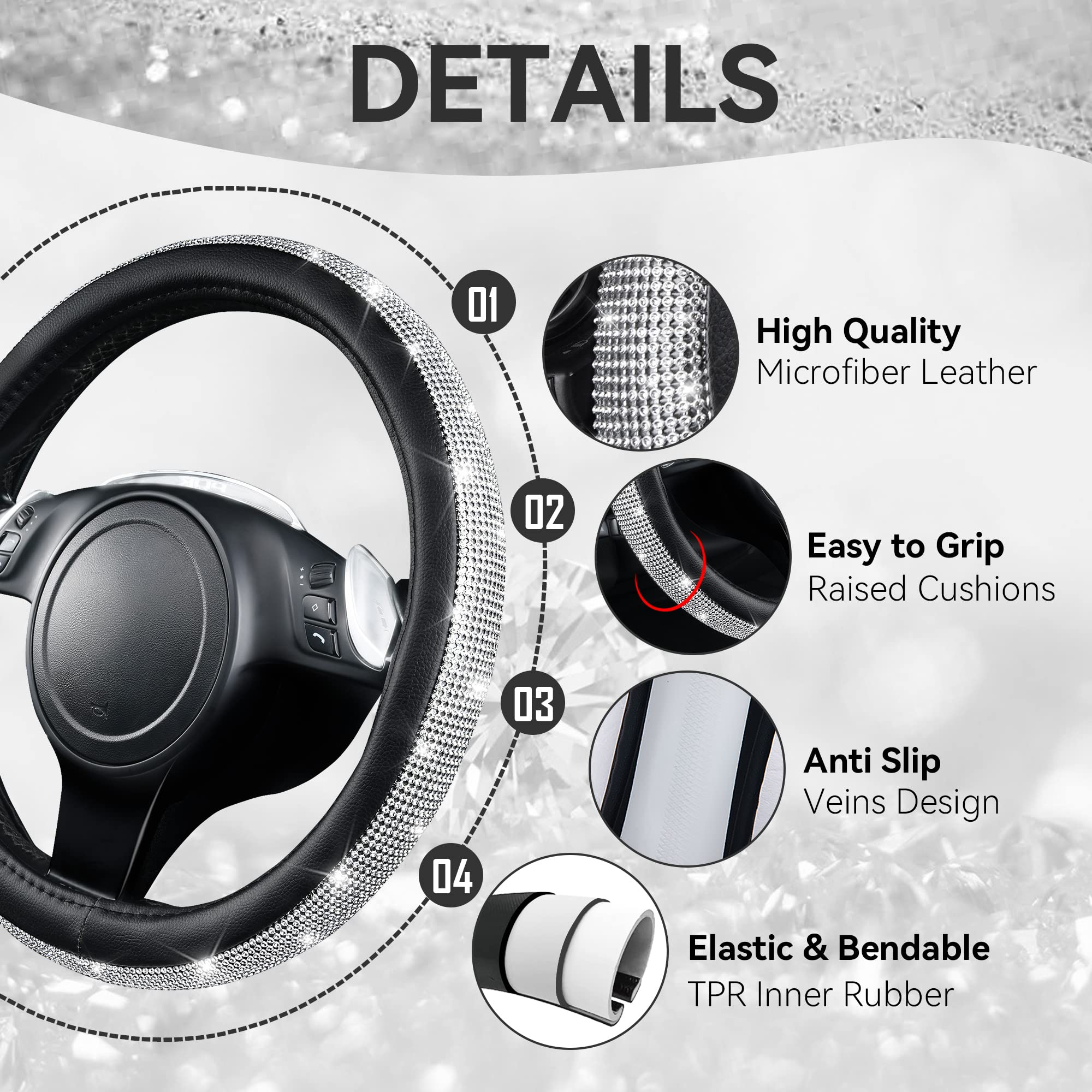 SILVER DIAMOND LEATHER: Premium Quality Material: PU Leather and Top diamond craftwork. The SILVER Crystal Steering Wheel Cover made of durable microfiber leather and SILVER DIAMOND, consisted hundreds of shiny rhinestones. Super Sparkly, Better Spotlight. Each diamond is fixed by the SILVER metal frame, Non-Dropping Diamond, Comfortable Feelings, does not scratch hands, and has good anti-slip effect.