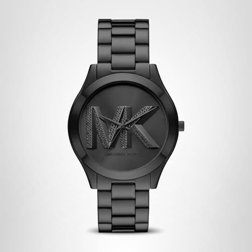 Michael Kors' 42mm Slim Runway watch features a black pavé sunray dial, three-hand movement and black stainless steel bracelet.