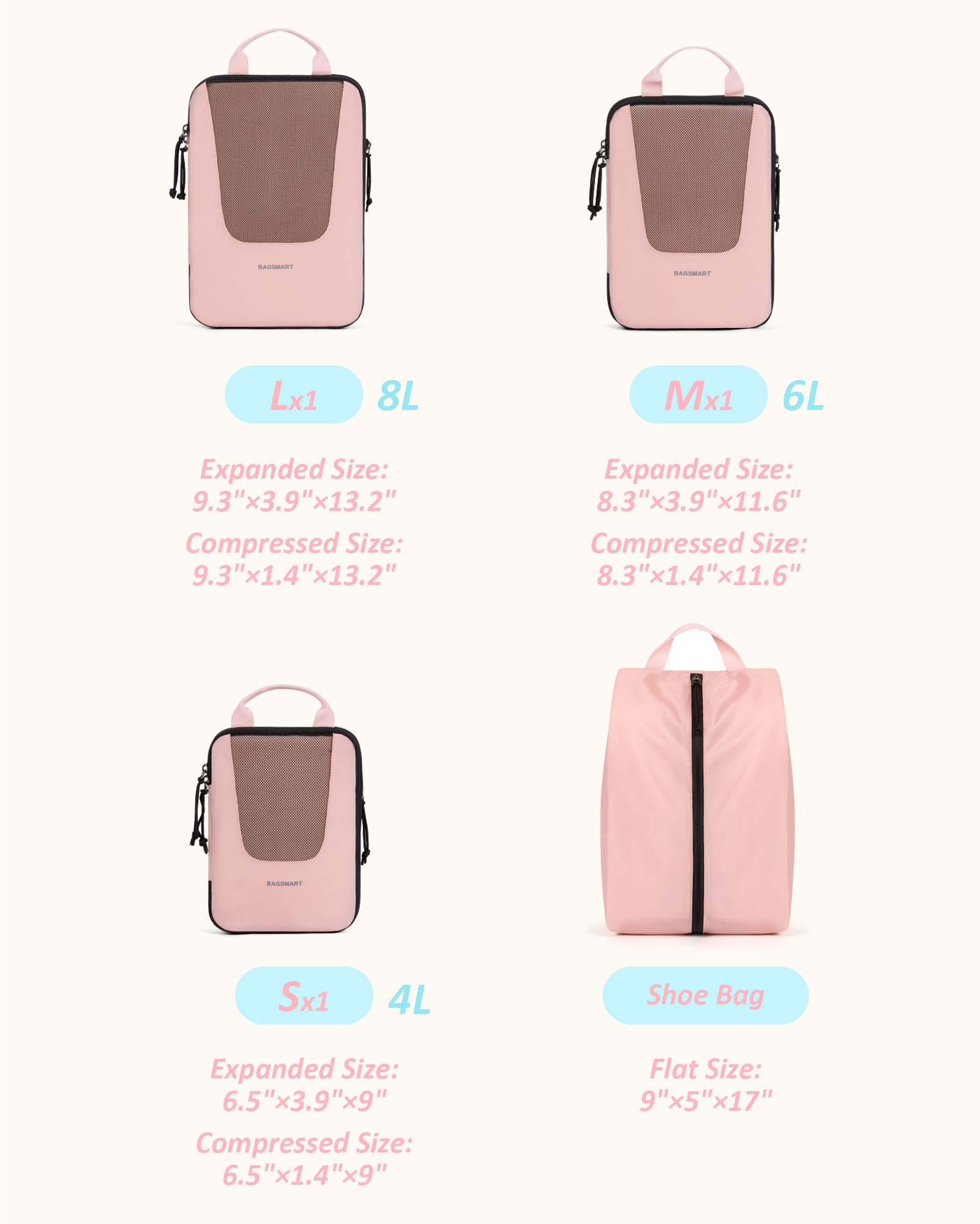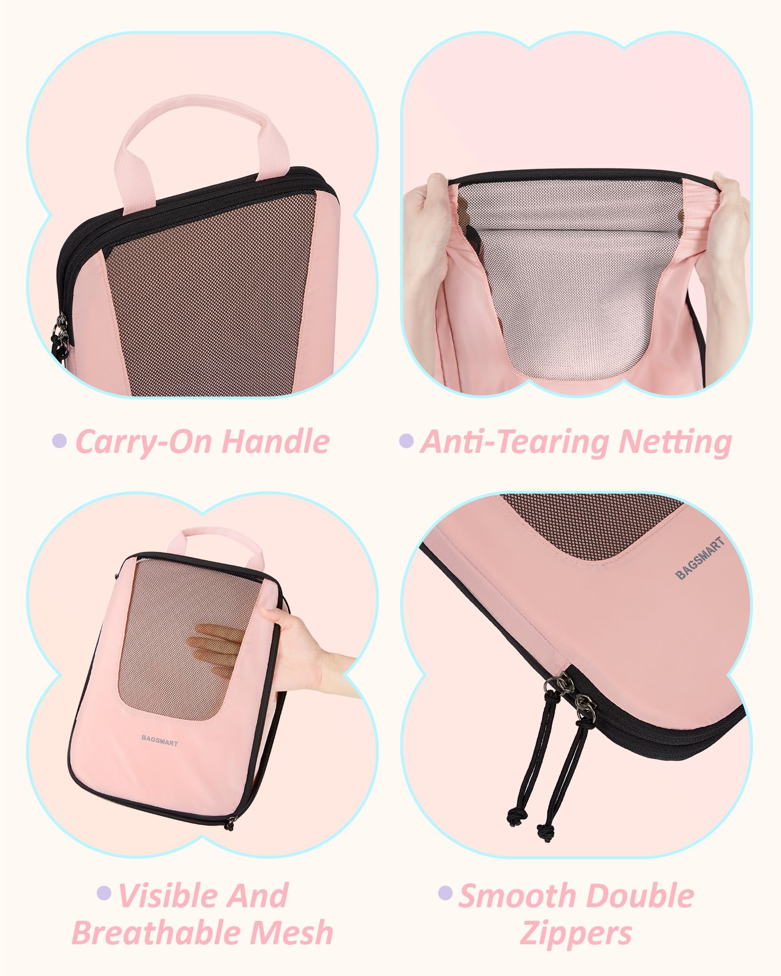 4 Set Packing Cubes - Are you fed up with the travel kind of messy suitcase? Travel with BAGSMART PACKING CUBES and they make a world of difference. The 6-piece packing cubes contains 3 travel cubes + 1 shoe bag, keeps your outfits in separate packing bags, and makes your luggage clean and neat while traveling