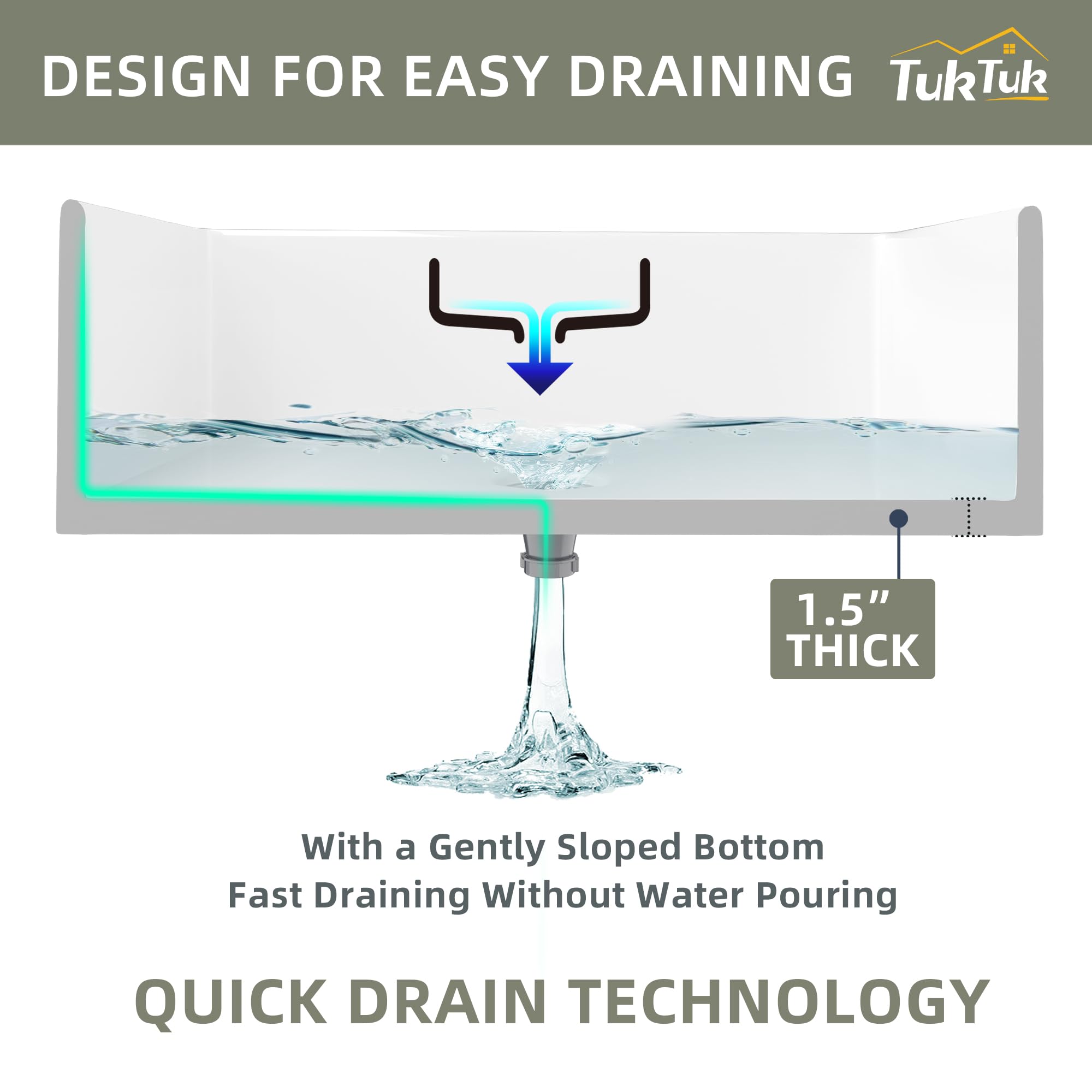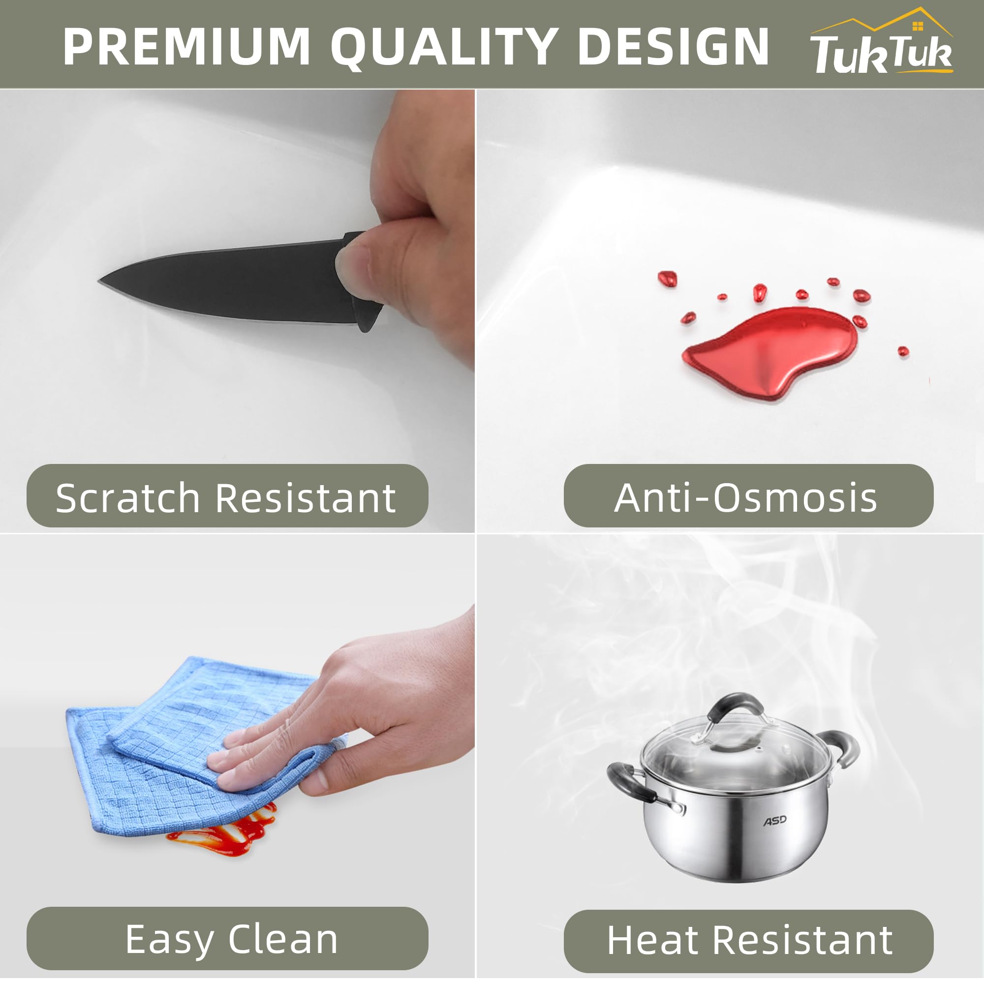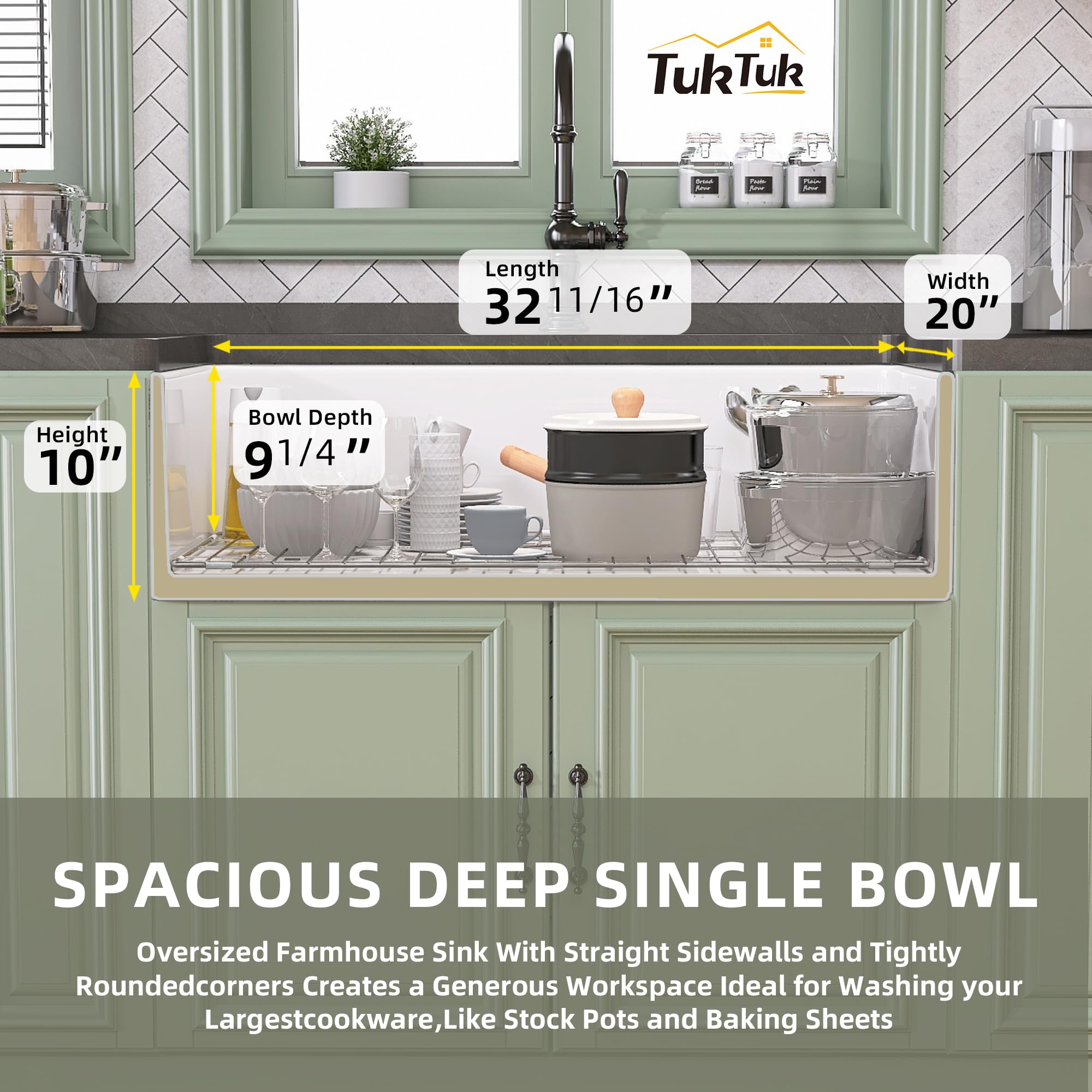 Extra Large Space & Extra Deep Kitchen Sink - TUKTUK fireclay white farmhouse sink 33 inch with 20 inch width from front to back, with a large and spacious single bowl in 10 inch height 9 1/4 inch bowl depth. This big white kitchen sink making the space of the large farmhouse sink more huge and creating more posibilities for life. With extra depth, dirty dishes can be stacked, and large dishes can be washed without spilling on the countertop or floor.