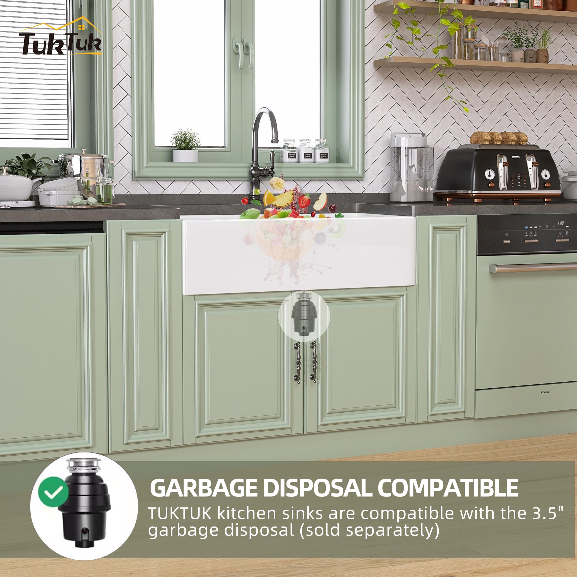 Wide Compatible & Upgraded Drainage System - Our white kitchen sink compatible with all standard 3 1/2" garbage disposals.TUKTUK 33 inch farm sink upgraded the undermount farmhouse sink bottom design, the bottom of the apron kitchen sink is slightly inclined to the middle to form an X-flowing water, allowing kitchen waste water to flow smoothly into the drain pipe to prevent clogging, while the flat bottom of apron front sink ensures the dishes or wine cups keeps standing sturdy without any slipping, gives you fresh and relaxation feeling all the time.