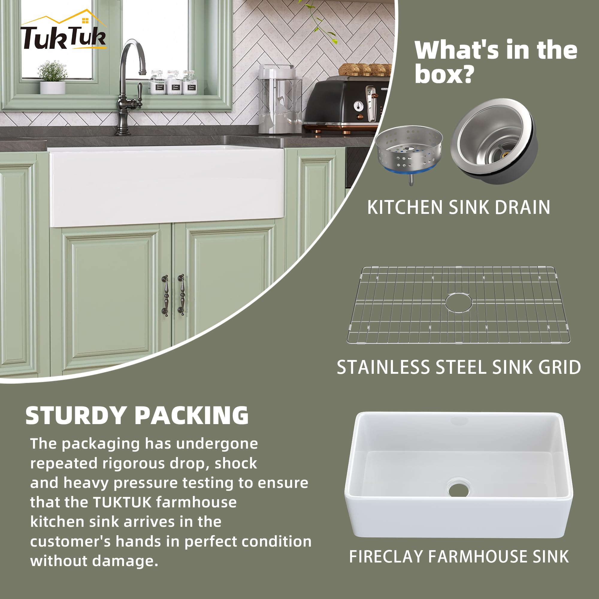 Secure Packaging & Excellent Service - TUKTUK fireclay farmhouse sink 30 x 20 inch comes with sturdy packaging, including a drop in white farmhouse sink 33 inch, removable 304 stainless steel bottom grid & strainer. Outer classic farm sink Dimensions: 33" Length x 20" Width x 10" Height. Any product issues occur when you receive our apron front white farm sink, please kindly contact us. TUKTUK service team are very willing to help you figure it out.