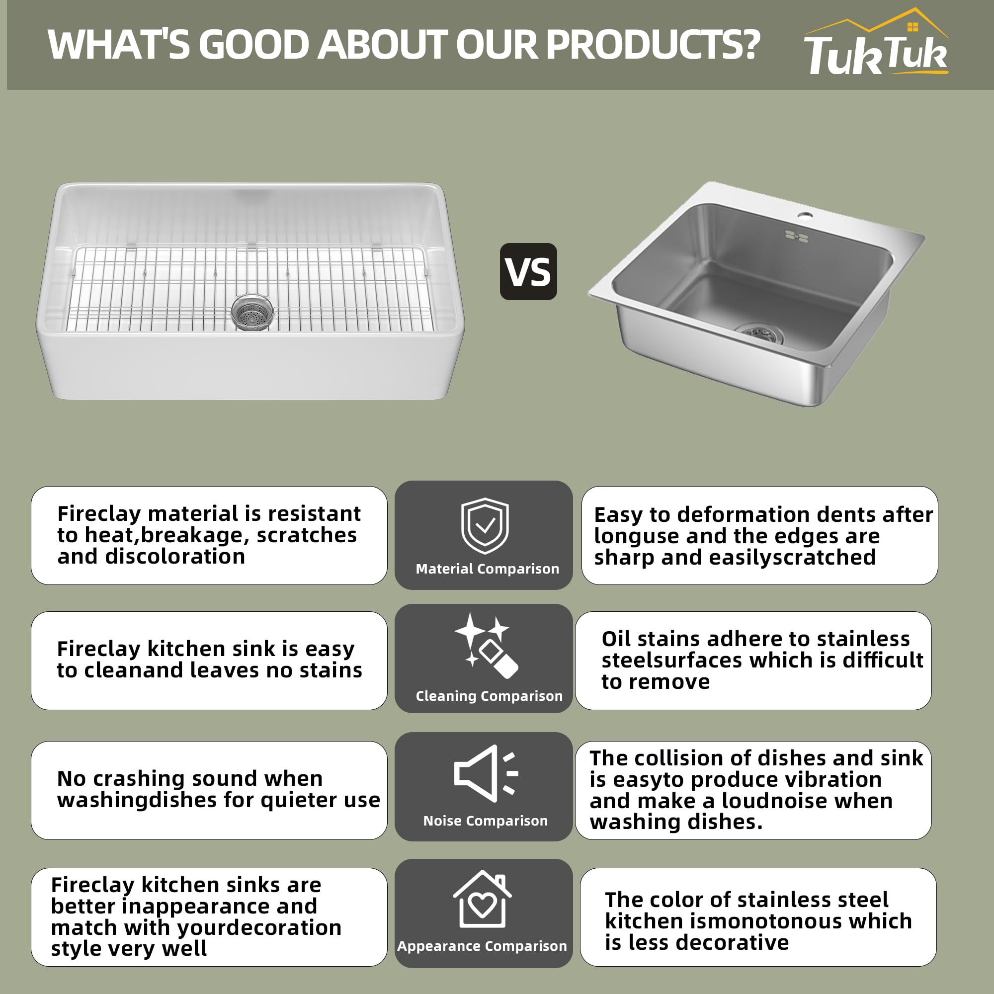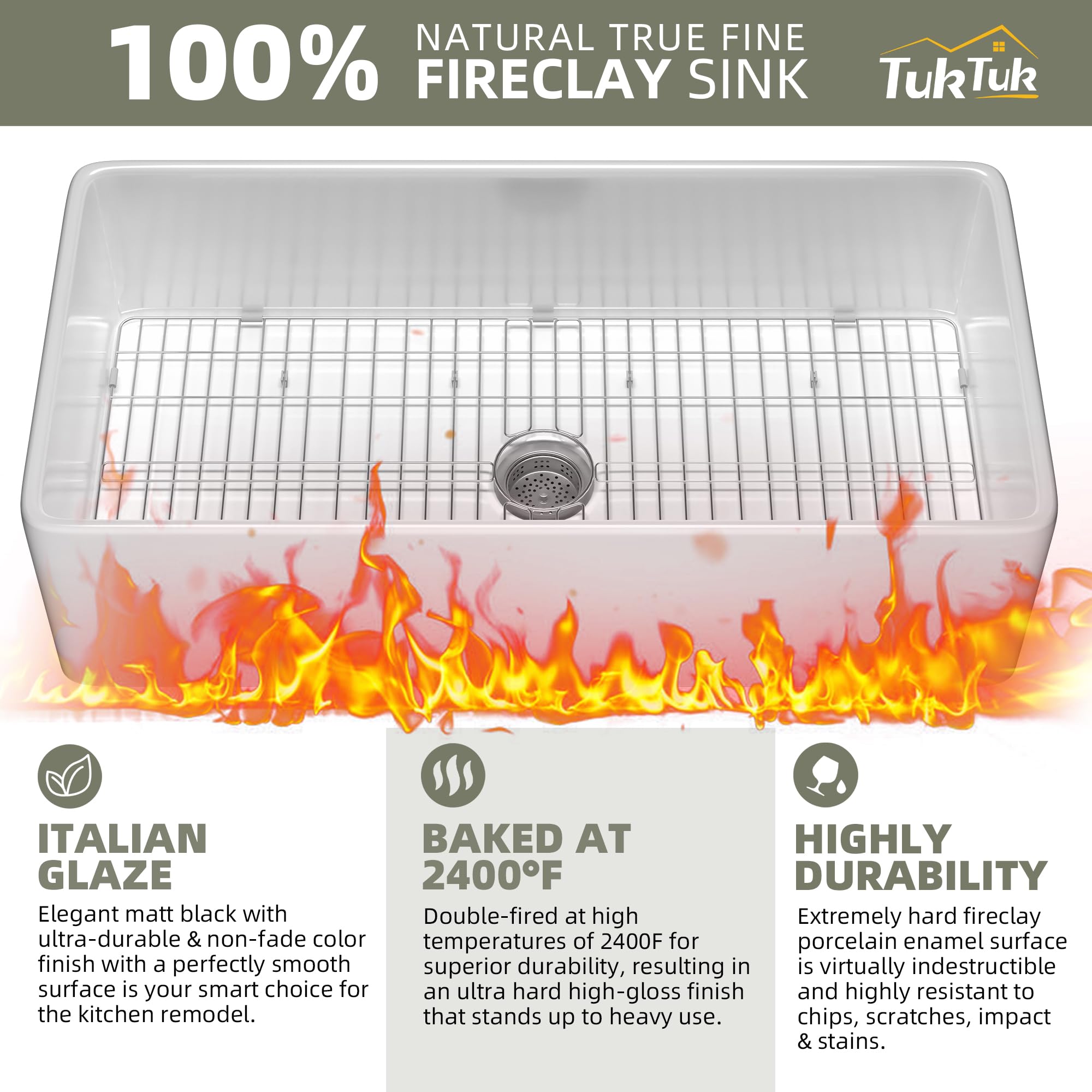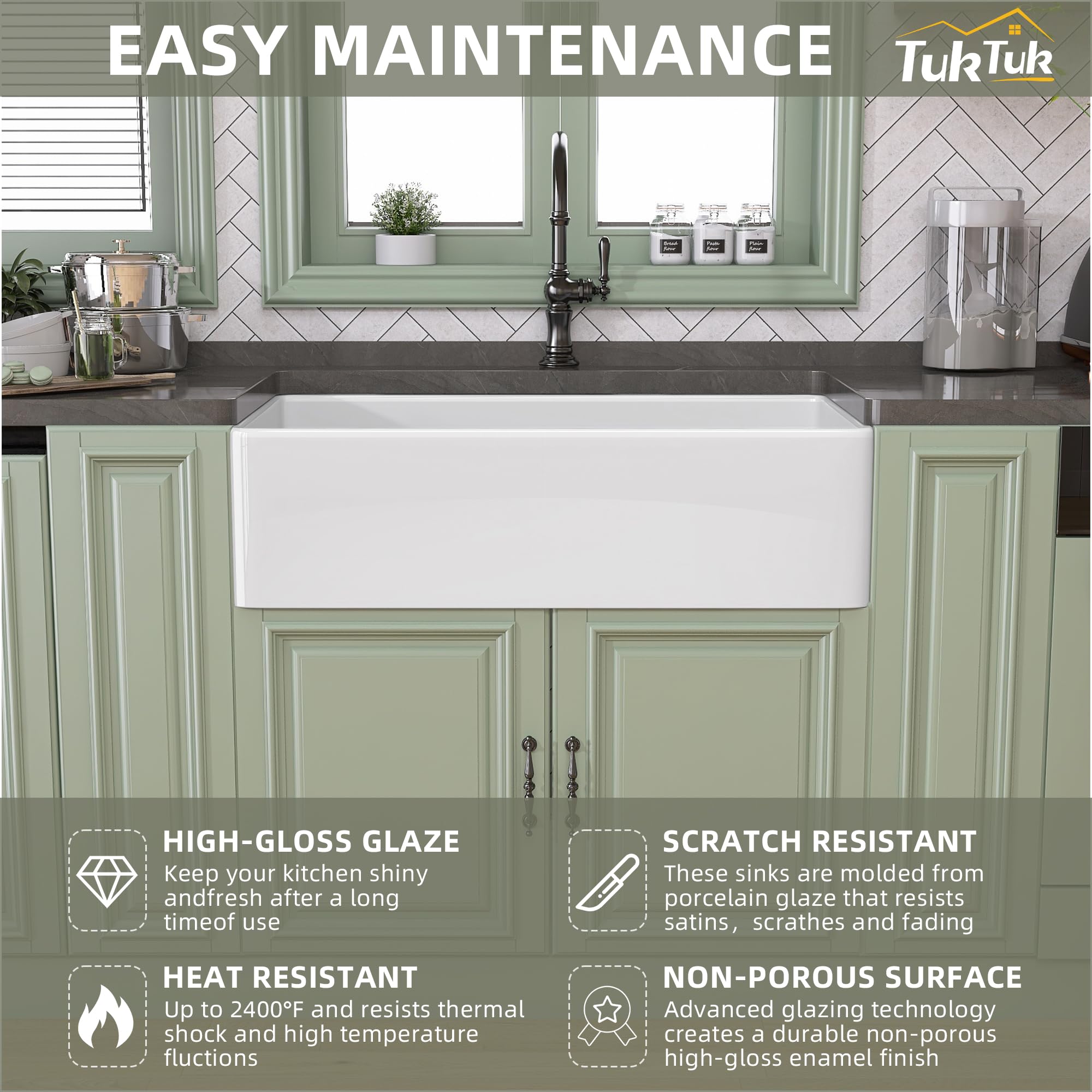 100% Fine Solid Fireclay Farmhouse Sink -TUKTUK farmhouse sink 33X20 made of 100% fine natural fireclay fired at extremely high temperatures above 2600β for 28hours, makes this white kitchen sink in hard and sturdy solid core construction, offers this 36 inch farm sink for kitchen superior strengthen and durable to withstand kitchen heavy-duty use. You won't have to worry about staining, chipping, scratching and cracking. This new design apron farmhouse sink was built for long-lasting.