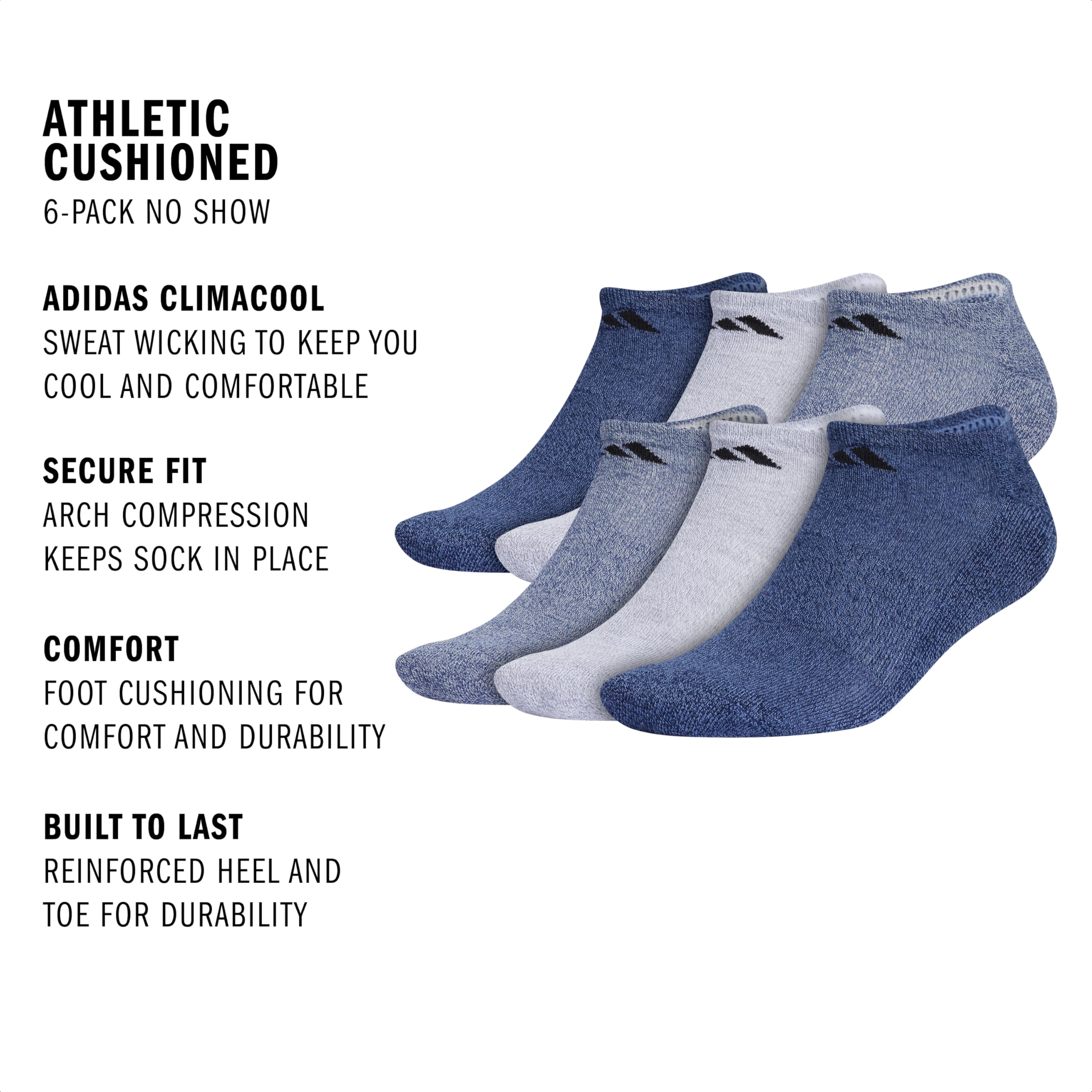Description Enjoy comfort and performance with these adidas Men's Athletic Cushioned No Show Socks, available in a convenient 6-pair pack. Designed specifically for the active man, these mens athletic socks offer cushioning in the foot, providing both comfort and durability during your daily workouts or casual outings. The arch compression feature delivers a secure fit, helping you maintain the ideal stride. The moisture-wicking yarns effectively keep your feet dry from sweat, providing a fresh feel mile after mile. Tailored to fit men's feet, these socks are ideal for diverse activities. Whether you're hitting the track with mens running socks or enjoying a leisurely day at home, these men's socks offer versatile appeal. Furthermore, as mens adidas socks, they bring trusted brand quality into your apparel lineup, helping you stay comfortable and stylish with each step you take.