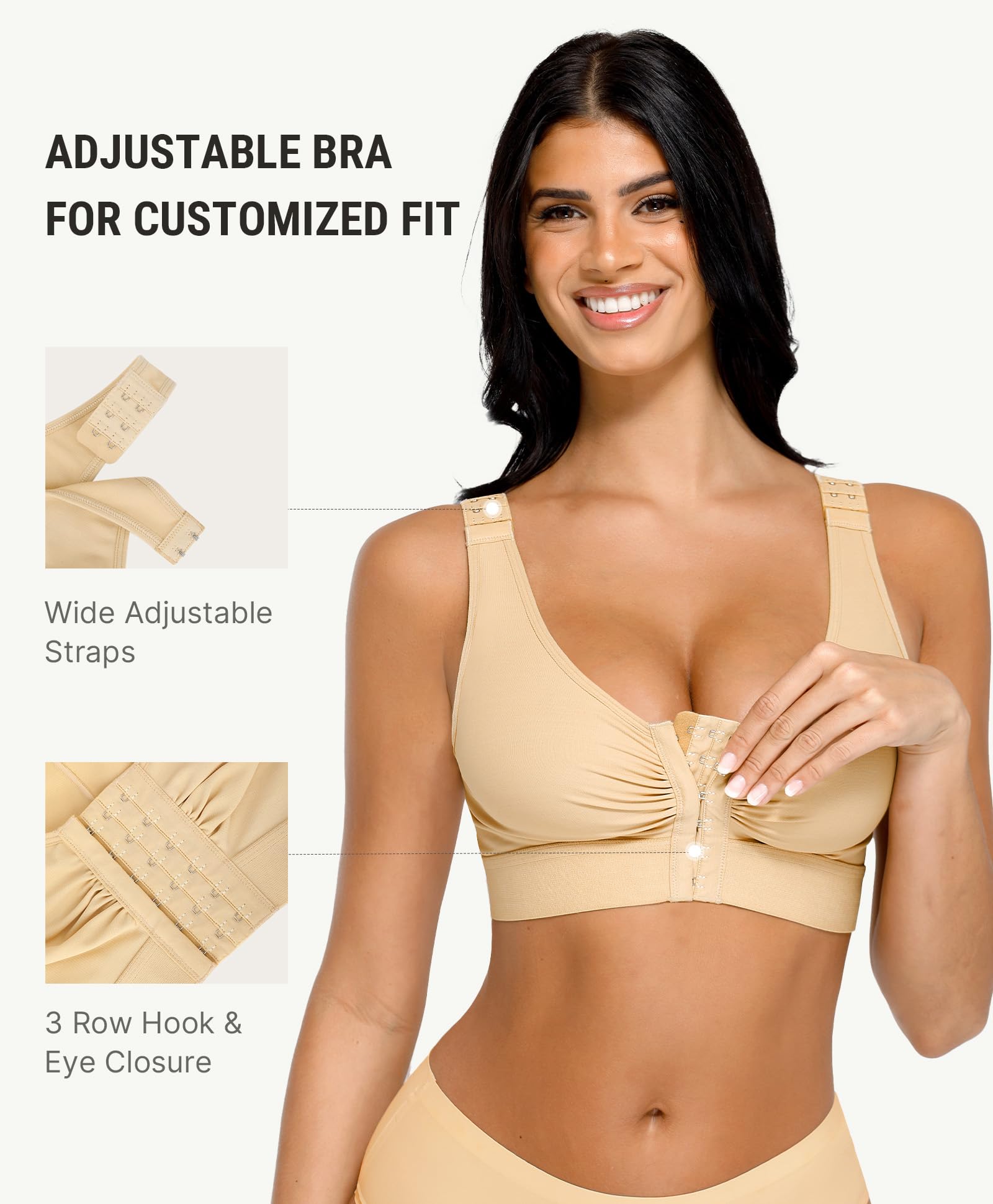 EASY ADJUSTMENT: This women's front closure bra can be adjusted in multiple ways to accommodate various cup sizes, including three rows of hook-and-eye closures in the front and shoulder closures for full adjustability. It is easy to wear, and you can adjust the compression level as needed at any time.