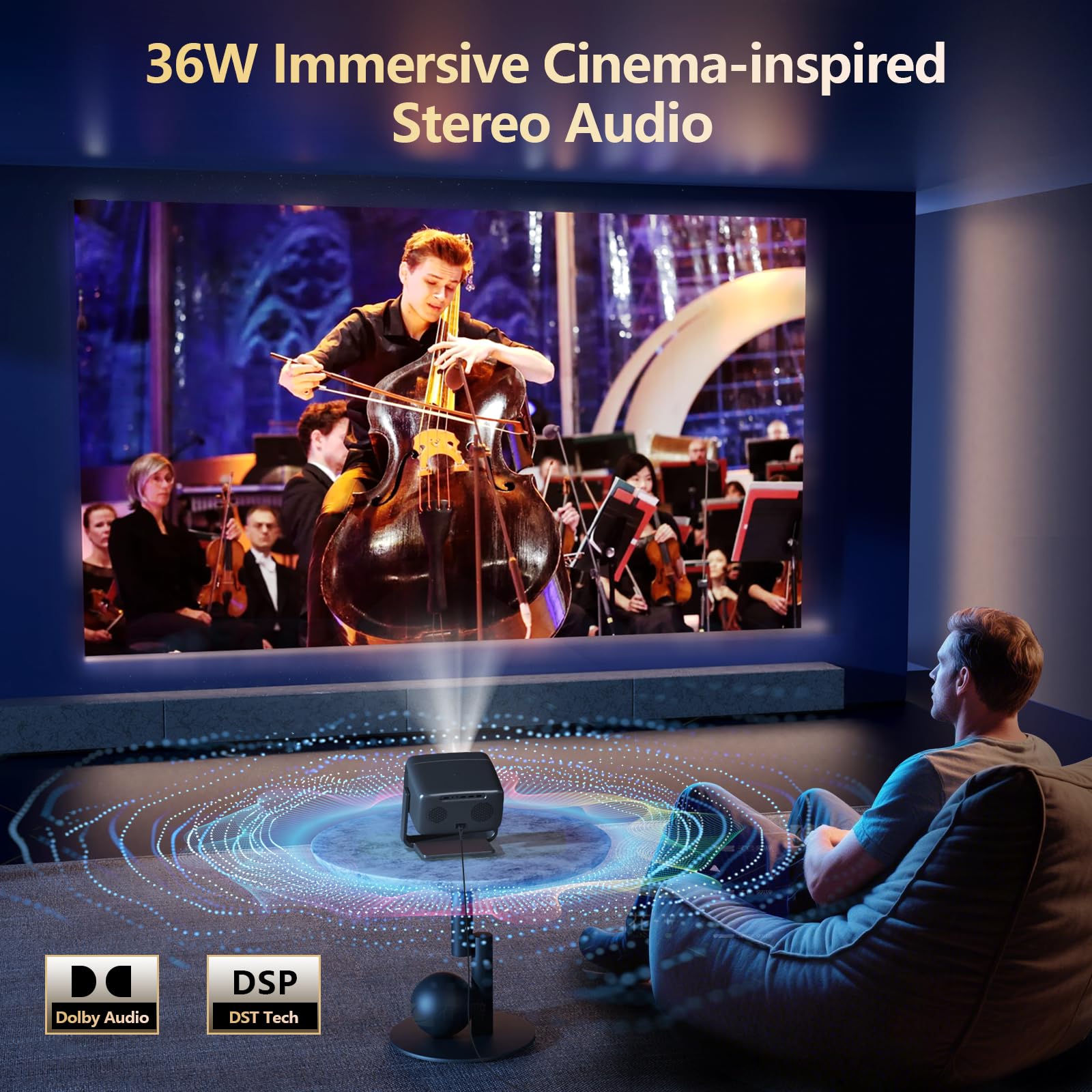 Official Apps and Unparalleled 36W 360° SRS HiFi Sound---The outdoor projector with wifi and bluetooth is pre-installed licensed apps, which allows us to stream contents directly from apps like NetfIix, YouTube, prime video, Disny+, HuIu without extra devices. Moreover, experience cinema-grade audio with our 36W DoIby-supported stereo speakers (with one-touch surround sound activation). Featuring deep bass and crystal-clear highs, it delivers room-filling sound—perfect for movie nights, parties, or outdoor gatherings