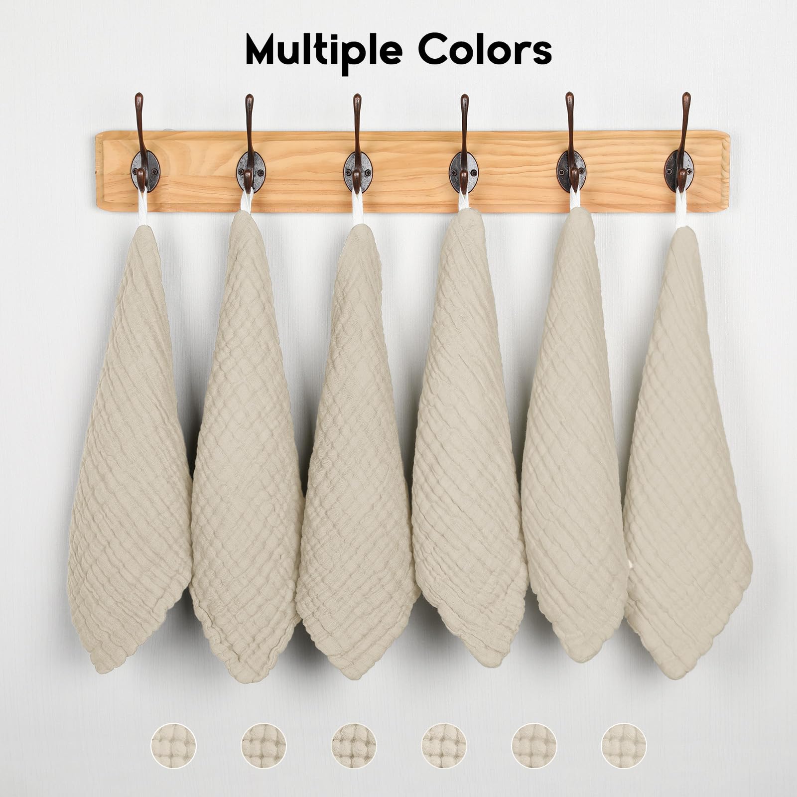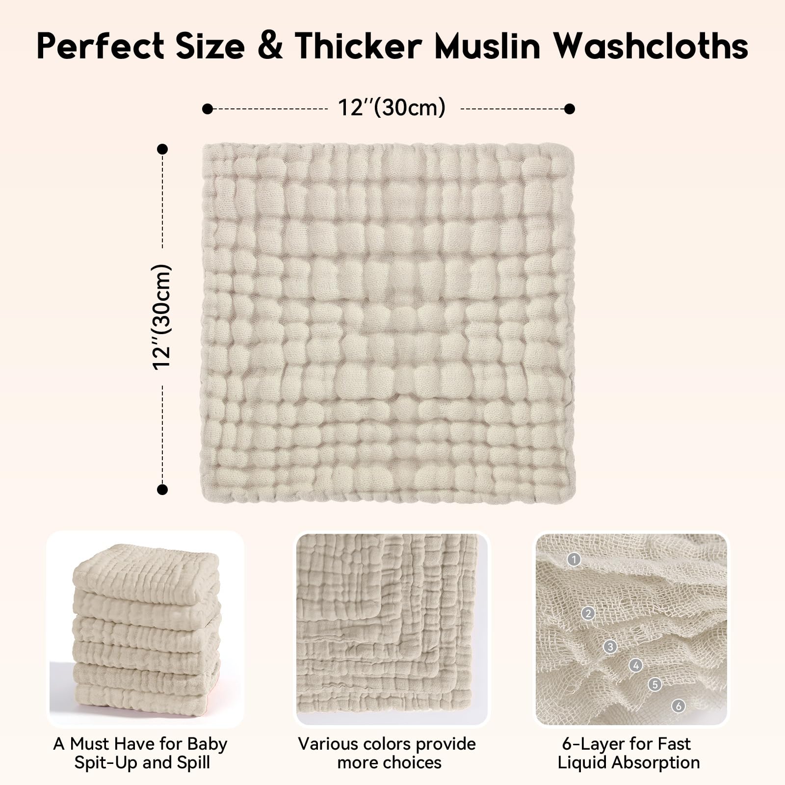 Pratical Design: The 6 pack baby muslin washcloths are thoughtfully designed in a generous size of 12"x12", offering a perfect balance between functionality and portability. Lanyard design make it easy to hang or dry, avoid germs accumulating. Reinforced edges make the muslin washcloths can withstand repeated washing while retaining its shape.