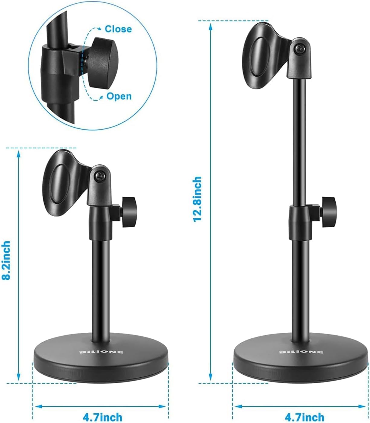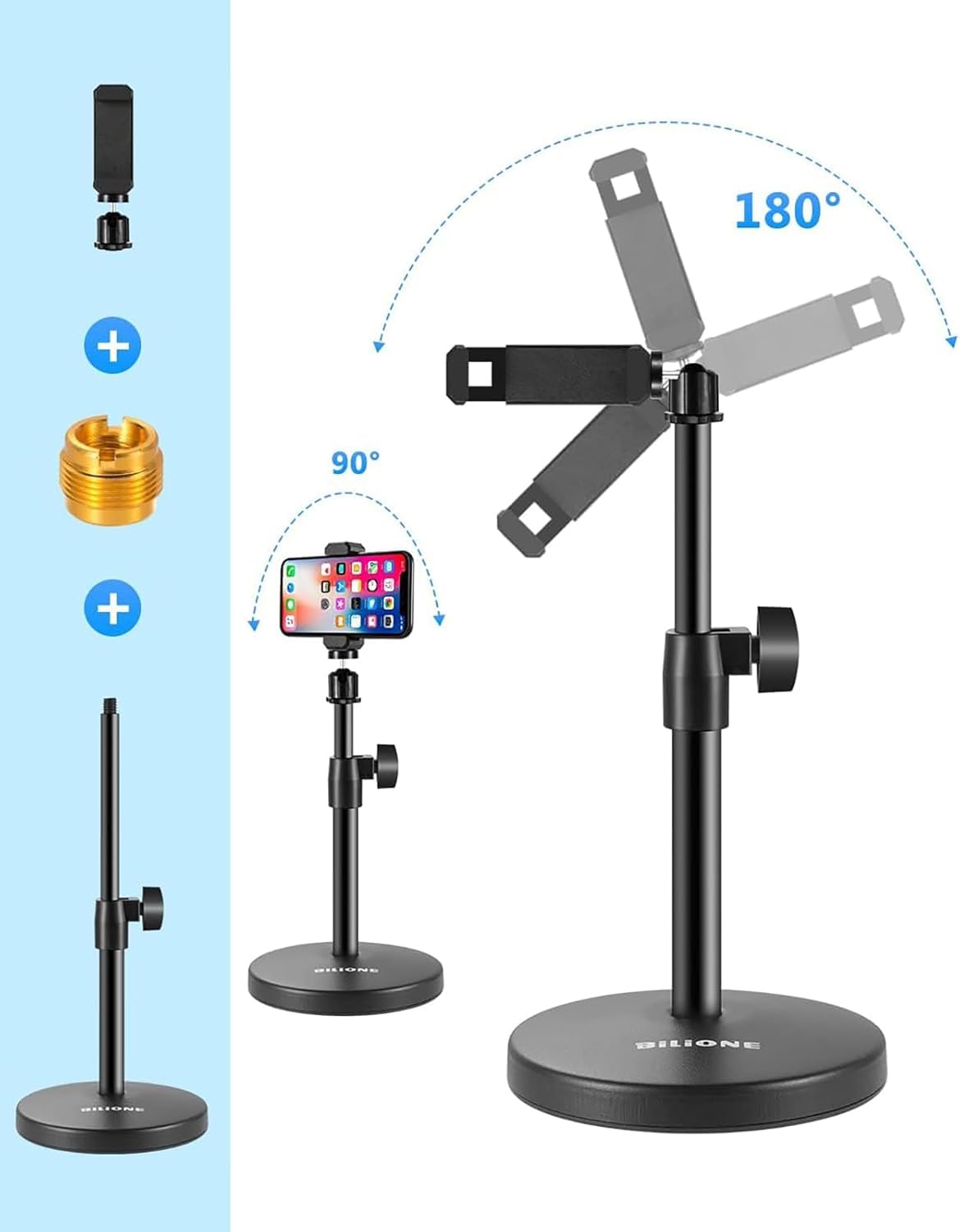 [Multifunction] BILIONE desk microphone stand can also be used as a cell phone stand by replacing the clip. The box also contains an additional universal high-quality metal adapter that can be compatible with Blue Yeti Snowball and other microphones, and has multi purposes for the shock mounts