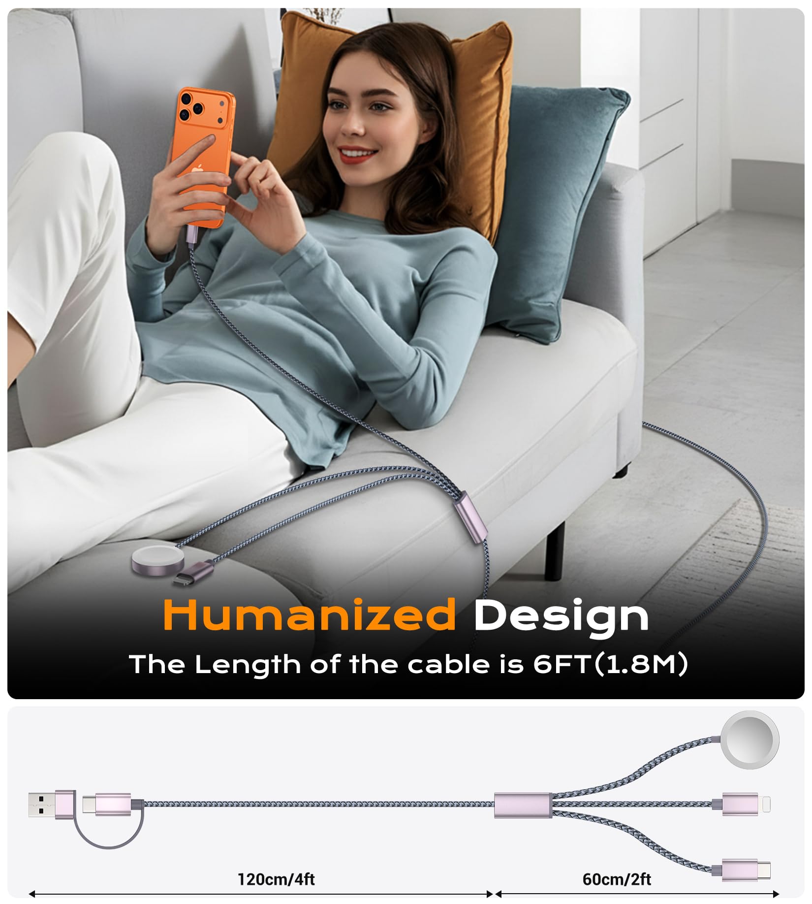 【3-in-2 Multi Charging Cable】3-in-2 multi charging cable provide 6 charging modes (USB-C/A for Apple Watch charger, Lightning, and Type-C),which compatible with iWatch Series 1-9, SE, and Ultra models, compatible with iPhone 17 and newer models,and iPads (Lightning/USB-C).A portable travel charger and a universal charging cable for multiple devices,designed to charge multiple devices at once