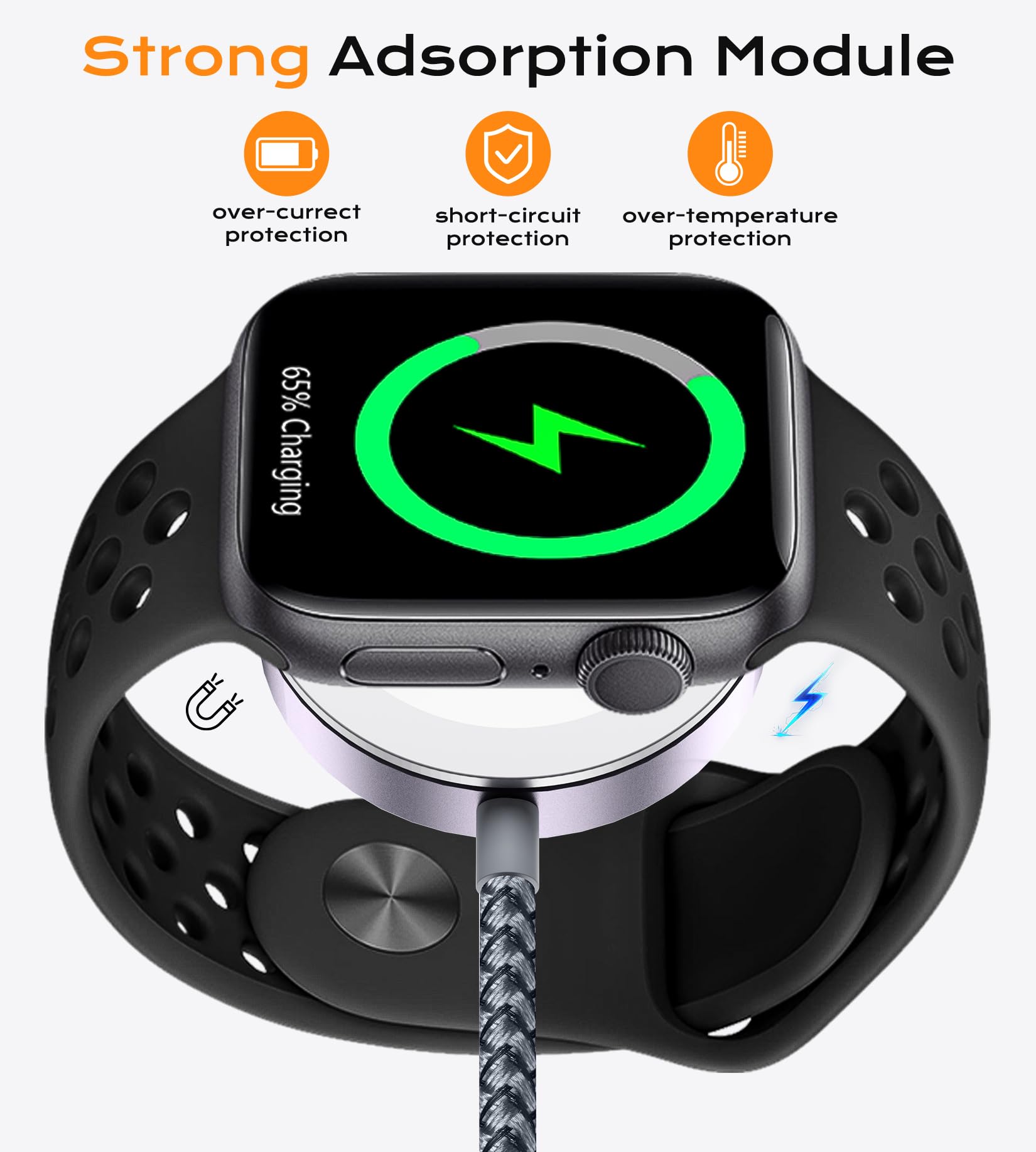【Magnetic iWatch Charger】With auto-alignment magnetic technology, this charger effortlessly snaps into place, ensuring a secure and efficient charge as it automatically aligns with the back of your Apple Watch.(please note: for optimal charging, avoid using an Apple Watch protective case)