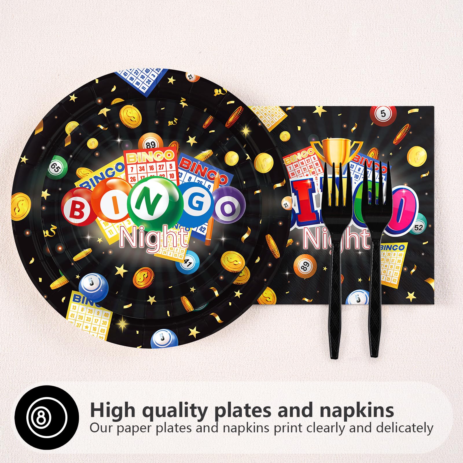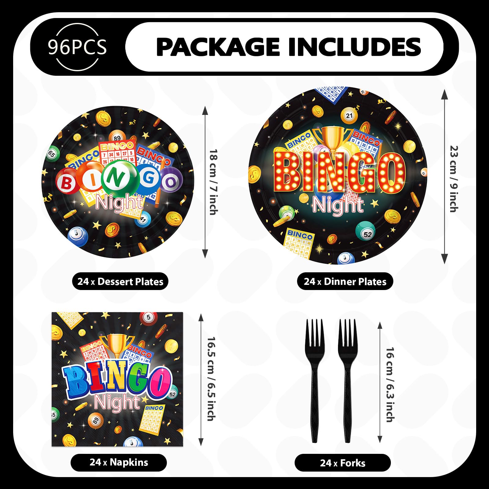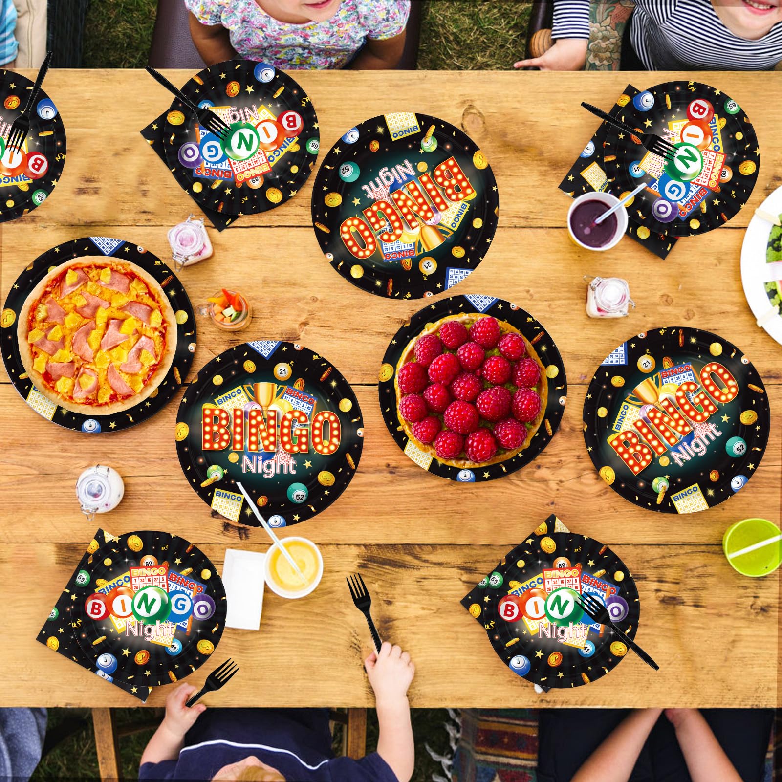 Complete 96-Piece Entertainment Set: Host hassle-free gatherings with this all-inclusive bingo night kit! Includes 24 premium black paper plates (9-inch), 24 bingo dessert paper plates (7-inch), 24 napkins (6.5-inch), and 24 durable plastic forks. The generous quantity supports medium to large groups, ensuring every guest has plates, utensils, and napkins. Neutral black bases allow vibrant food displays while maintaining a sophisticated atmosphere—perfect for bingo halls, pubs, or home game nights